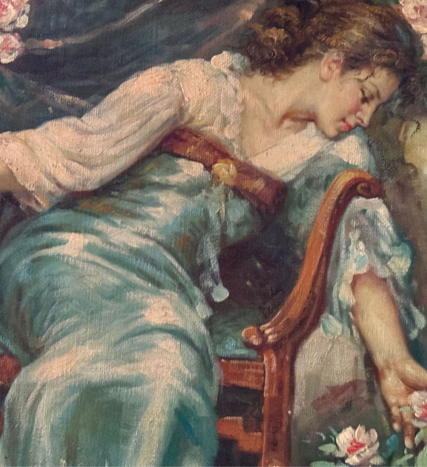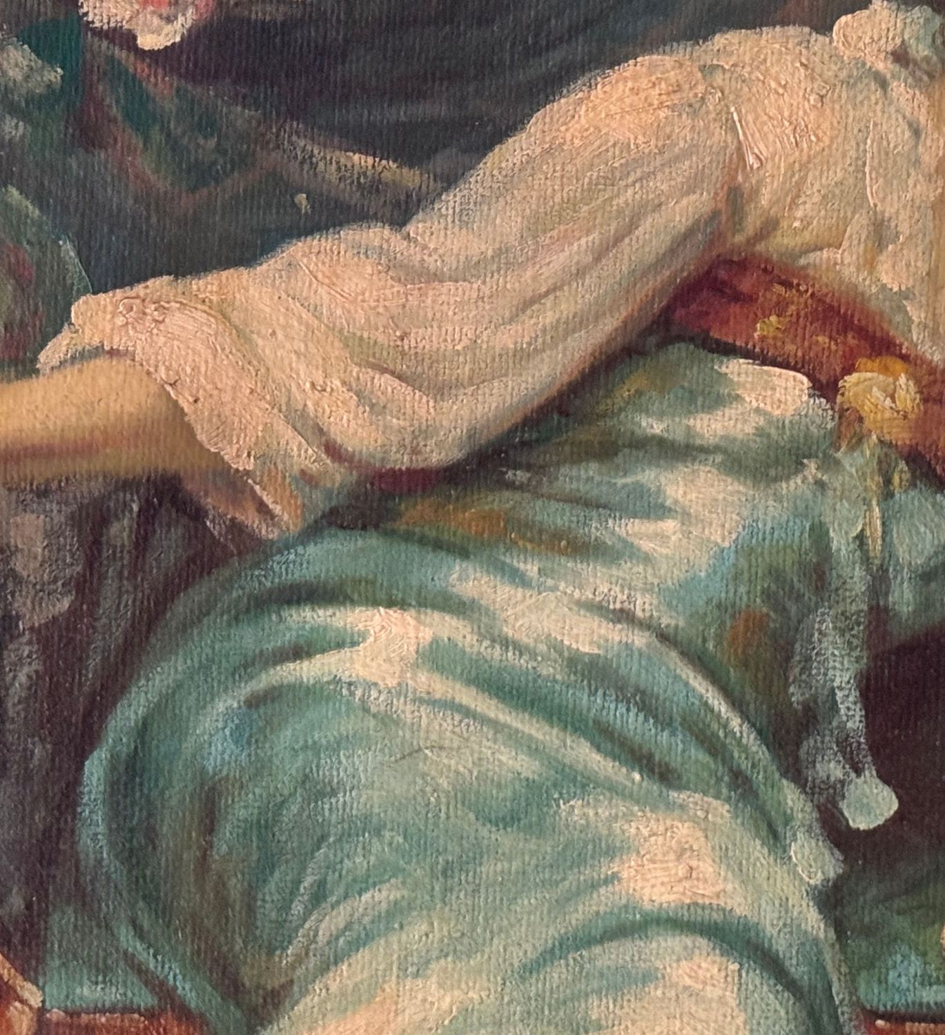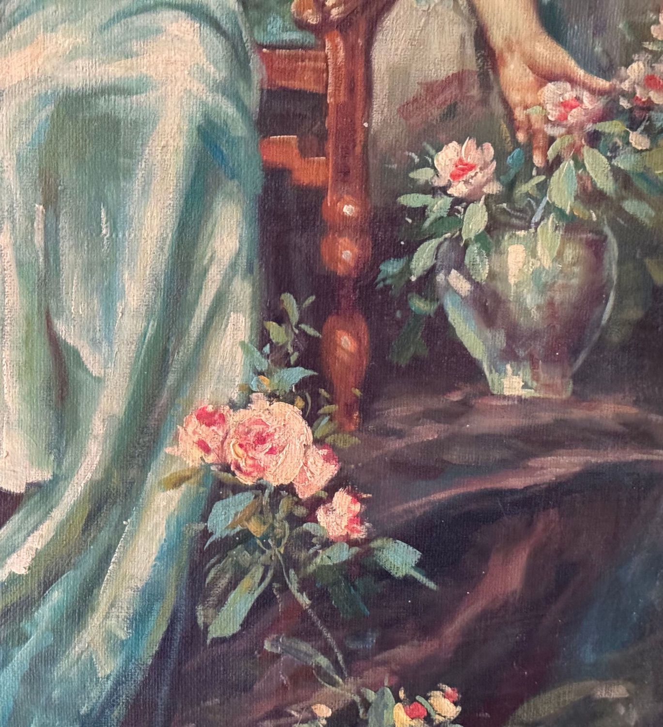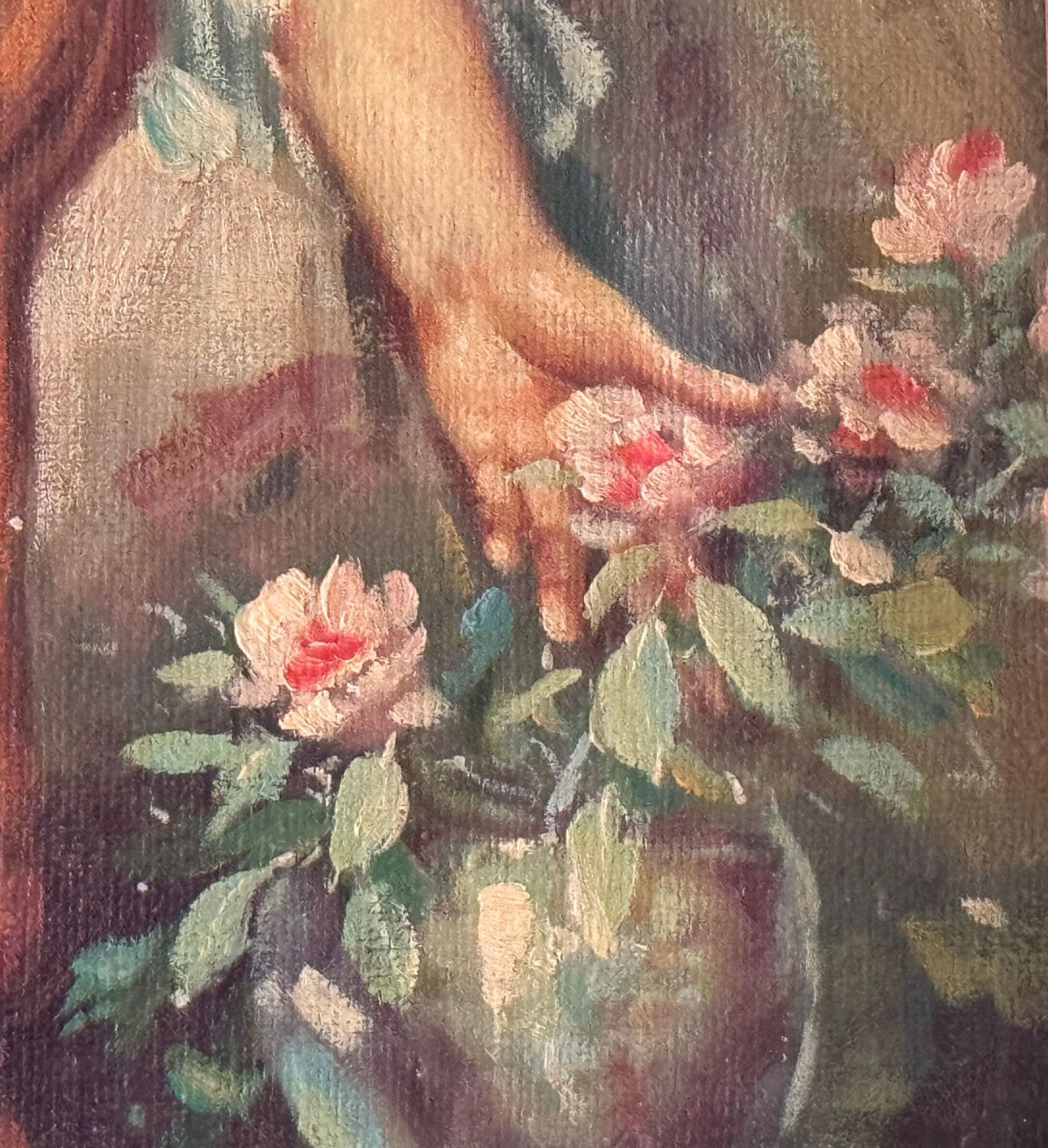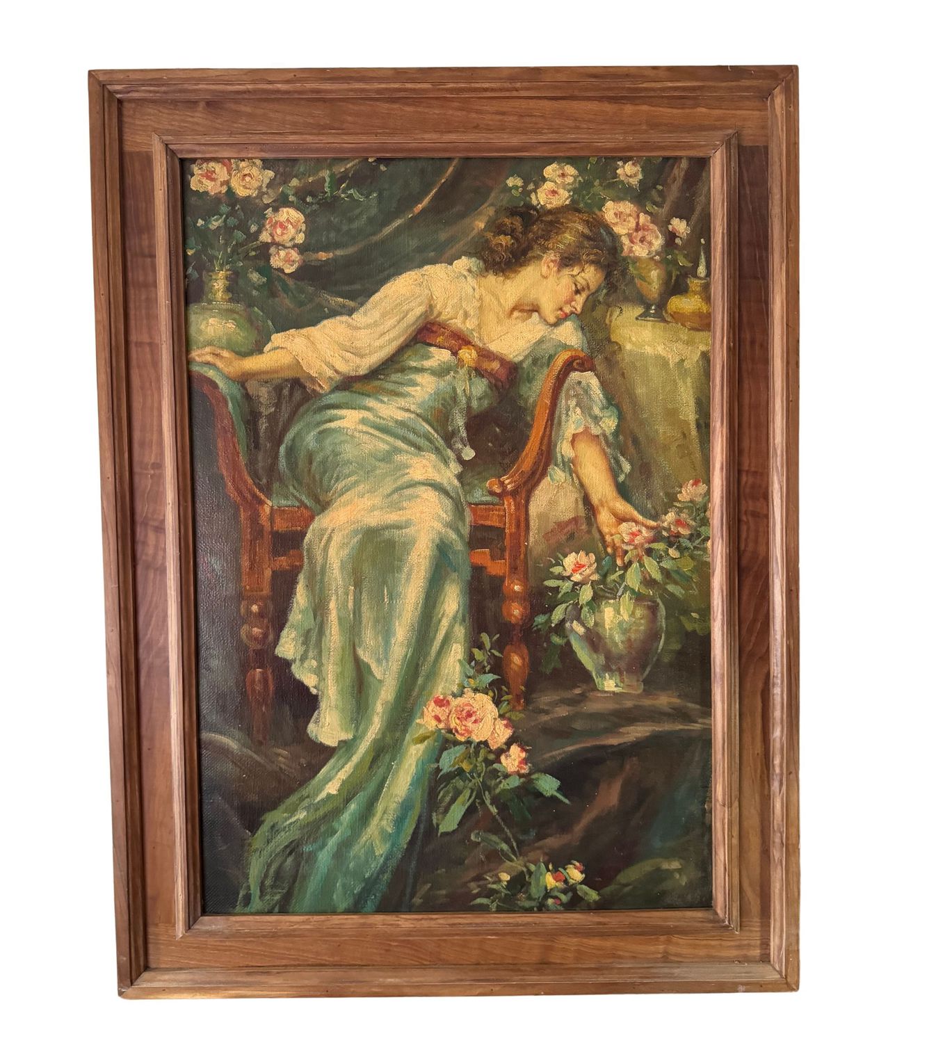 Dipinto olio su tela, periodo XX secolo scuola Italiana, raffigurante Ritratto di donna. Nella maniera di Vincenzo Irolli. Dimensioni compreso cornice: 89x119 cm. Dimensioni interno cornice: 69x100 cm. Da artista anonimo. Opera in buone condizioni.