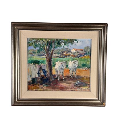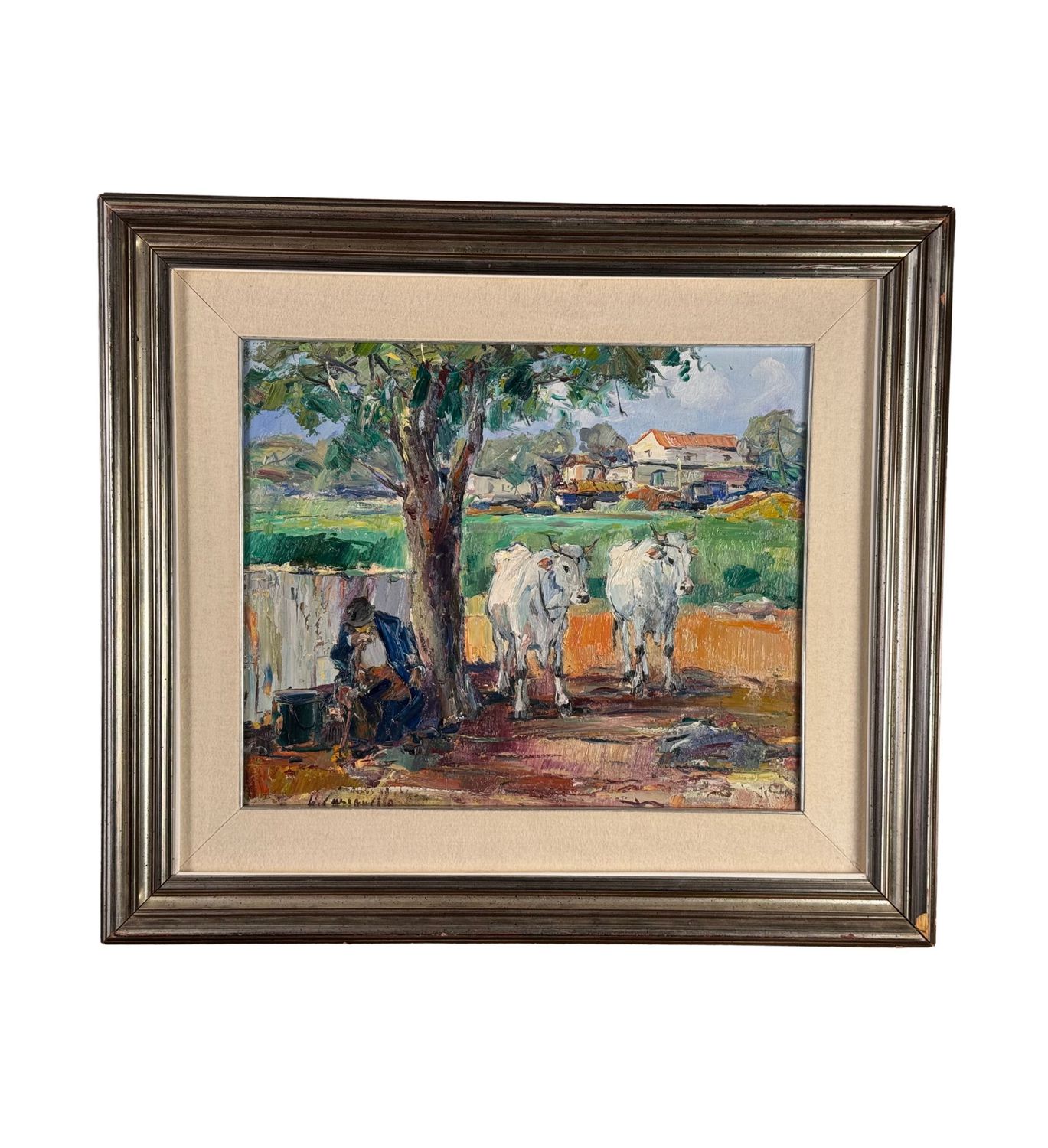Dipinto olio su tavola, periodo XX secolo scuola Italiana, raffigurante Fattoria. Dimensioni compreso cornice: 74x84 cm. Dimensioni interno cornice: 60x50 cm. Reca firma in basso a sinistra Nicola Canzanella. Opera in buone condizioni.