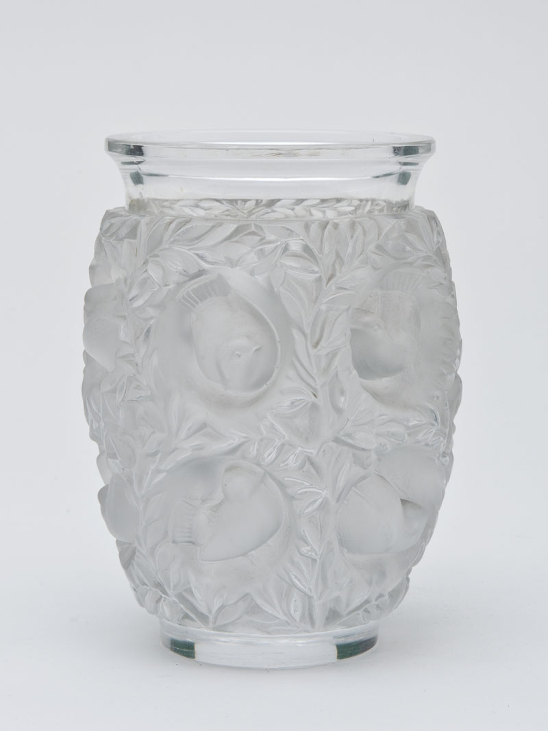 Lalique, Francia - Vaso "Bagatelle" in vetro trasparente soffiato in stampo, molato e patinato. Corpo decorato a rilievo con motivi vegetali e uccelli. Disegnato nel 1939, n. di catalogo 10-936, prodotto nel 1947 con il n. 2036 e ripreso dopo il 1951 con n. 12-219. Firmato a punta sotto la base in grafia corsiva "Lalique France" Bibliografia: F. Marcilhac, R. Lalique. Catalogue raisonné de l’oeuvre de verre, Les éditions de l’Amateur, Paris 2004, p.471