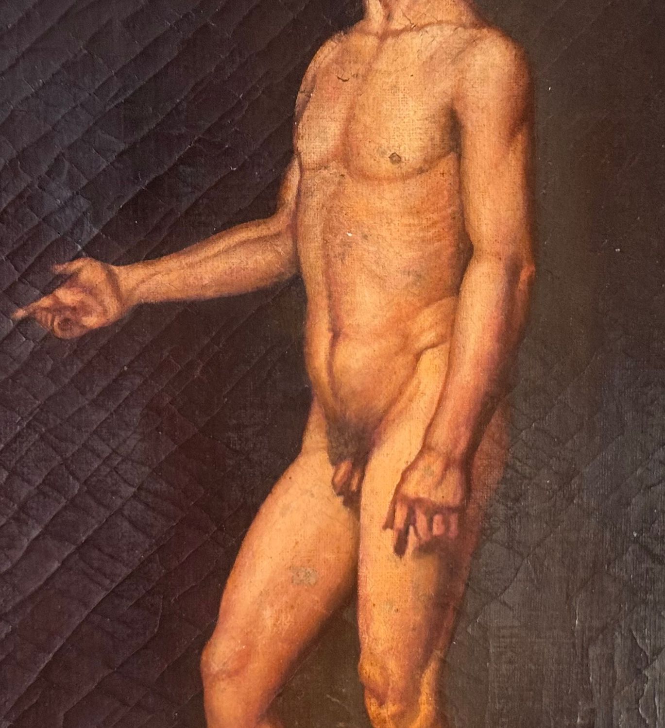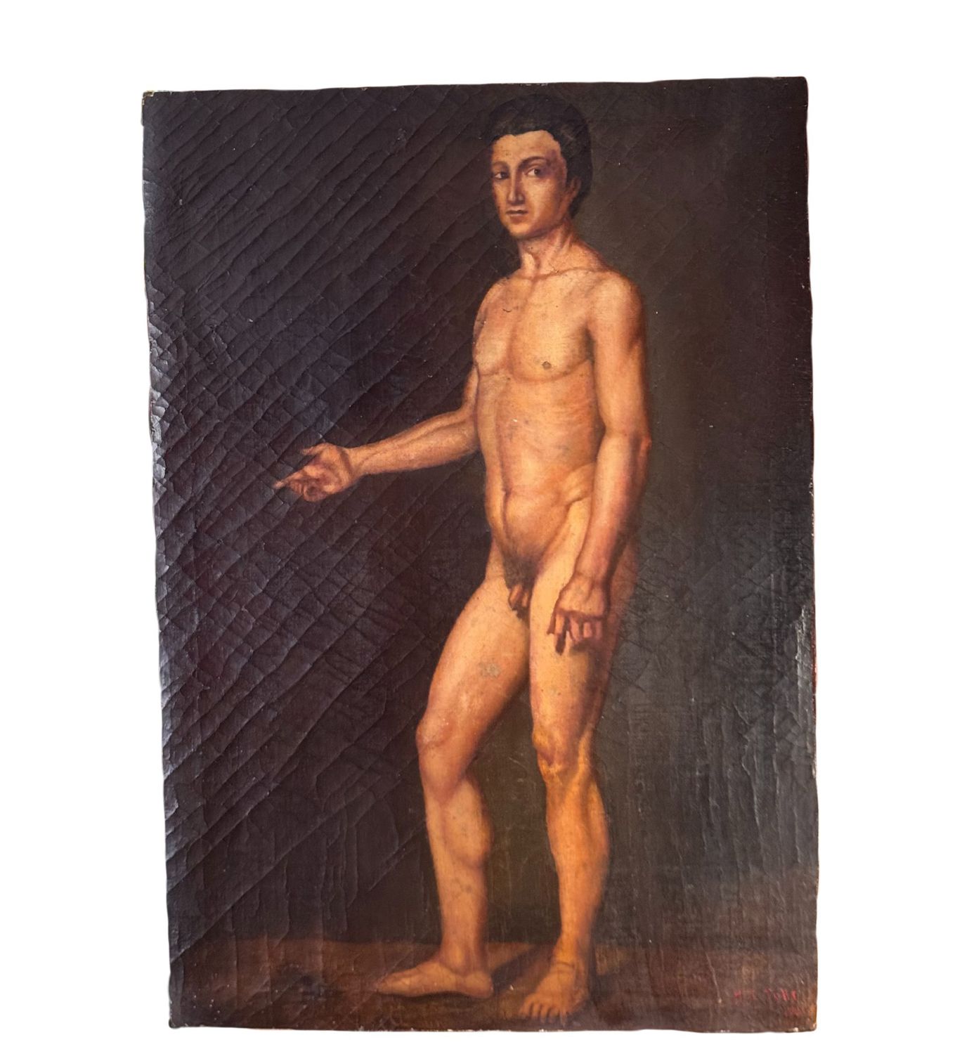 Dipinto olio su tela applicata su tavola, periodo primi anni del XX secolo scuola Italiana, raffigurante Nudo di uomo. Dimensioni: 84x58 cm. Reca fiRma in basso a destra da artista non identificato. Opera in discrete condizioni, con evidenti segni di vissuto come da foto allegate.