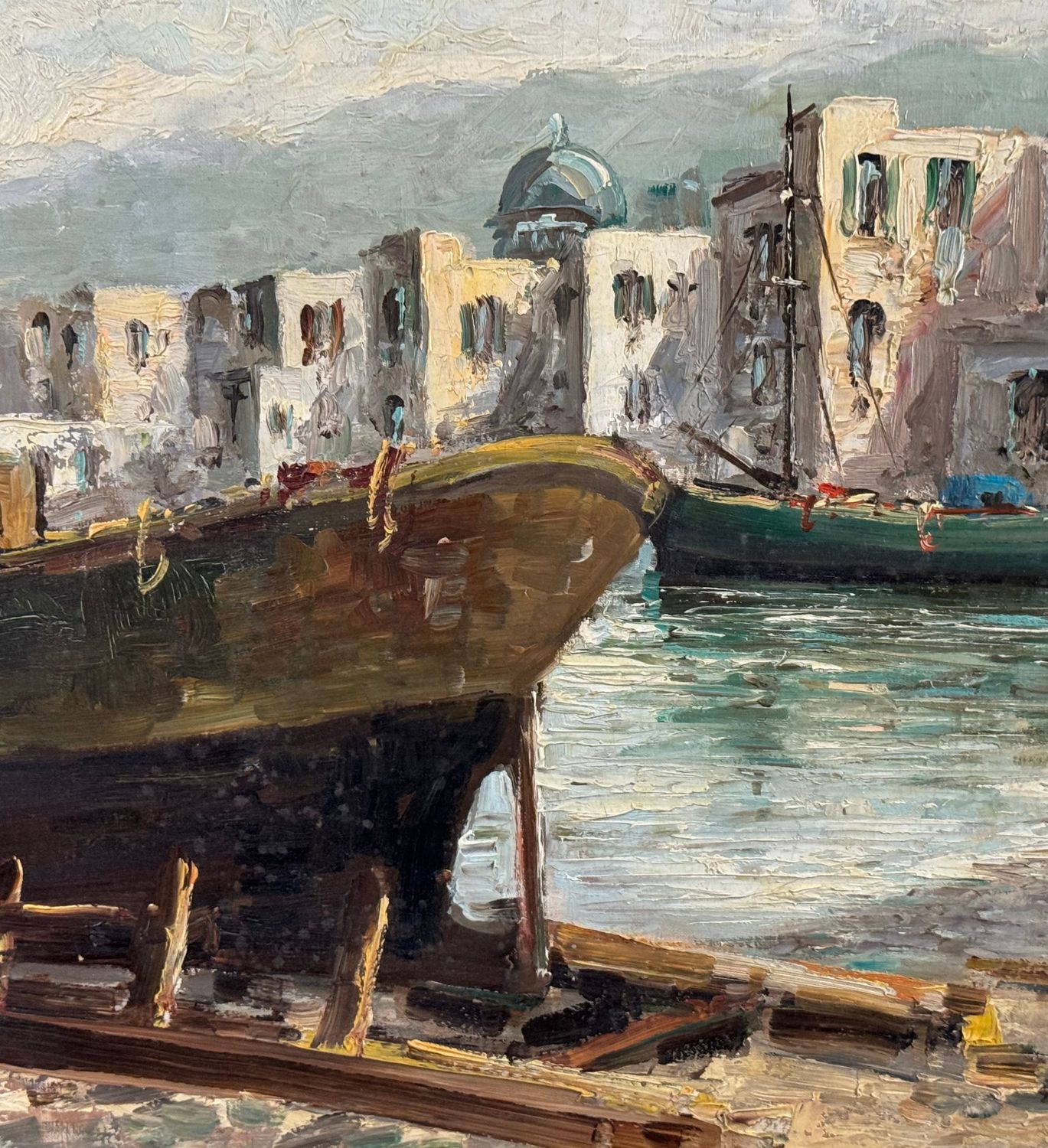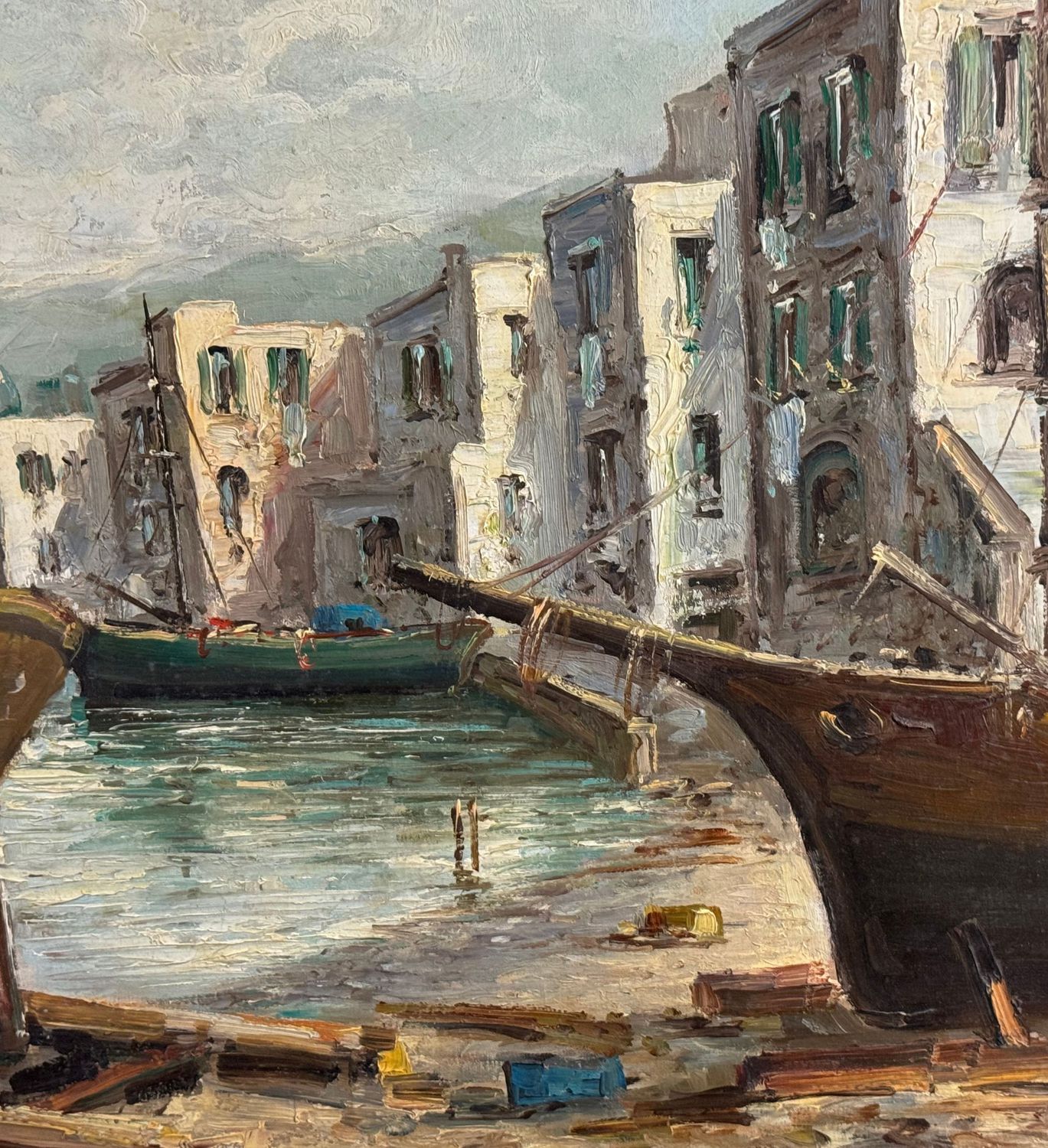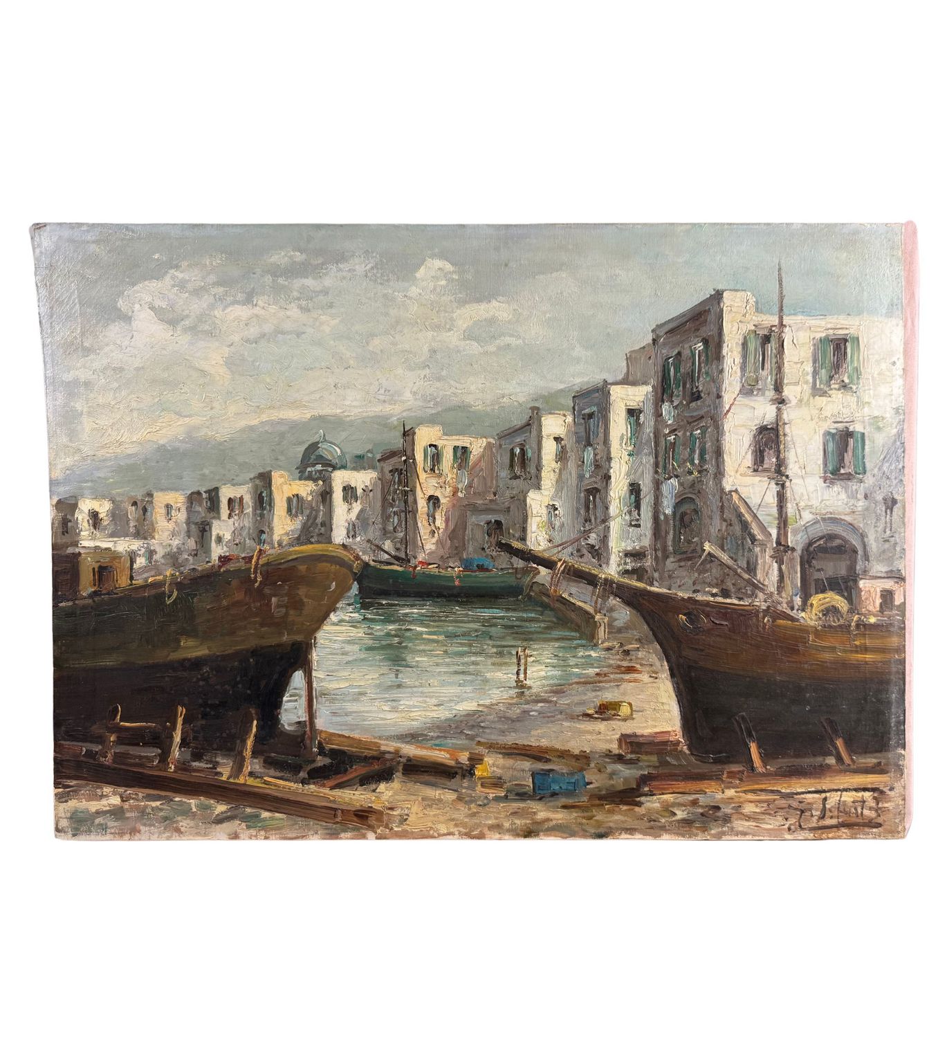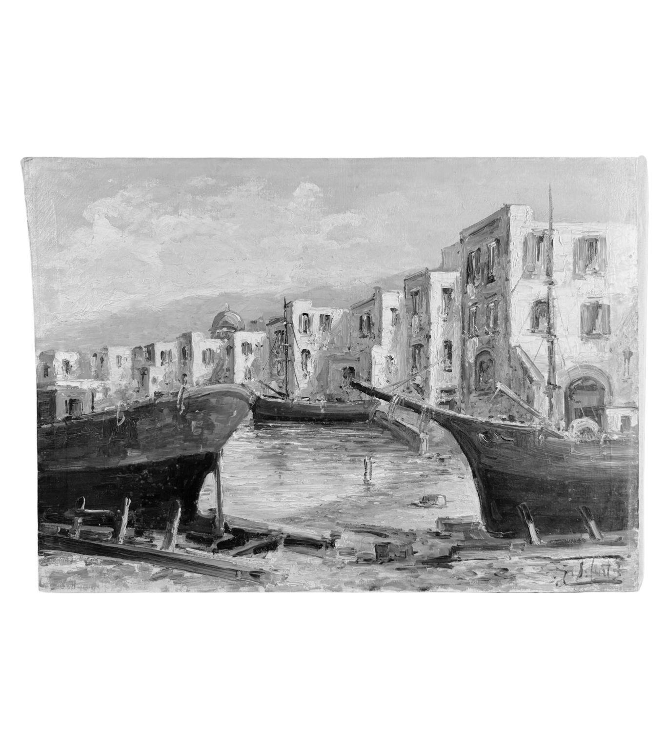 Dipinto olio su tela, periodo XX secolo scuola Italiana, raffigurante Marina con barche. Dimensioni: 70,5x50 cm. Reca firma in basso a destra (Probabile attribuzione a E. Briante). Opera in buone condizioni.