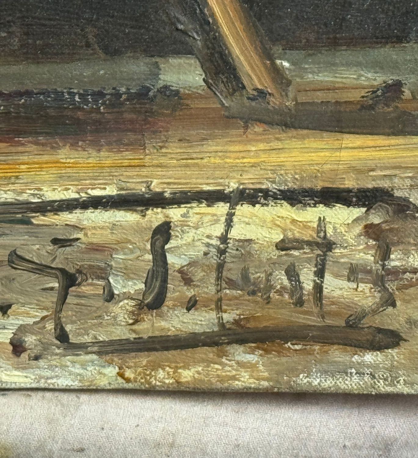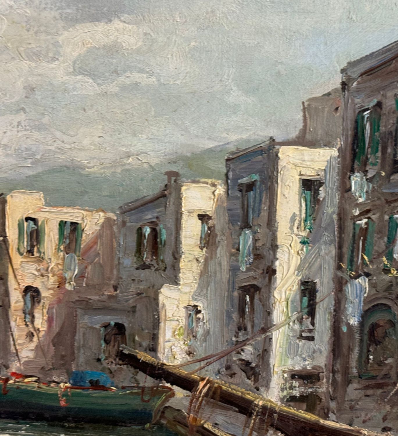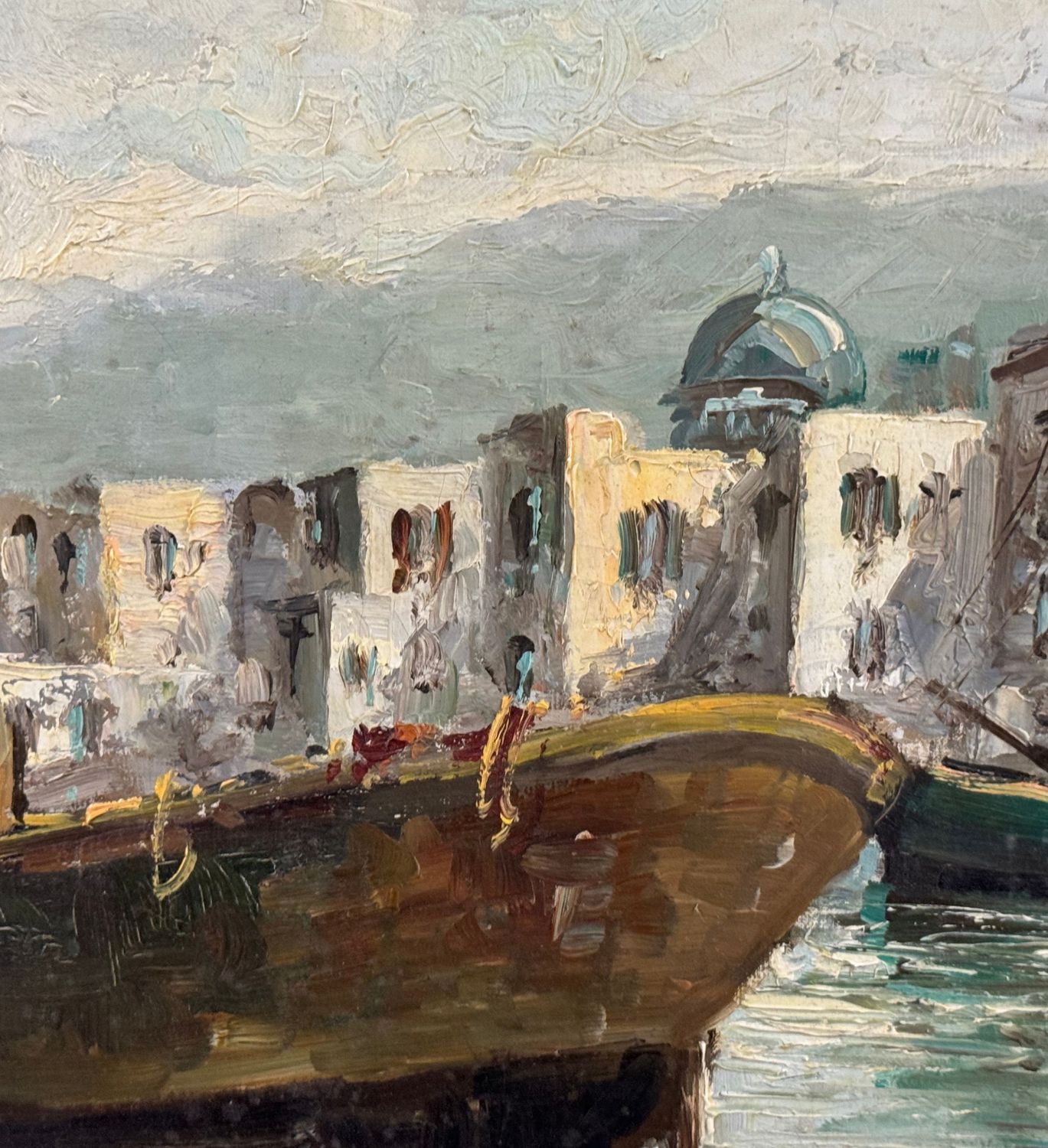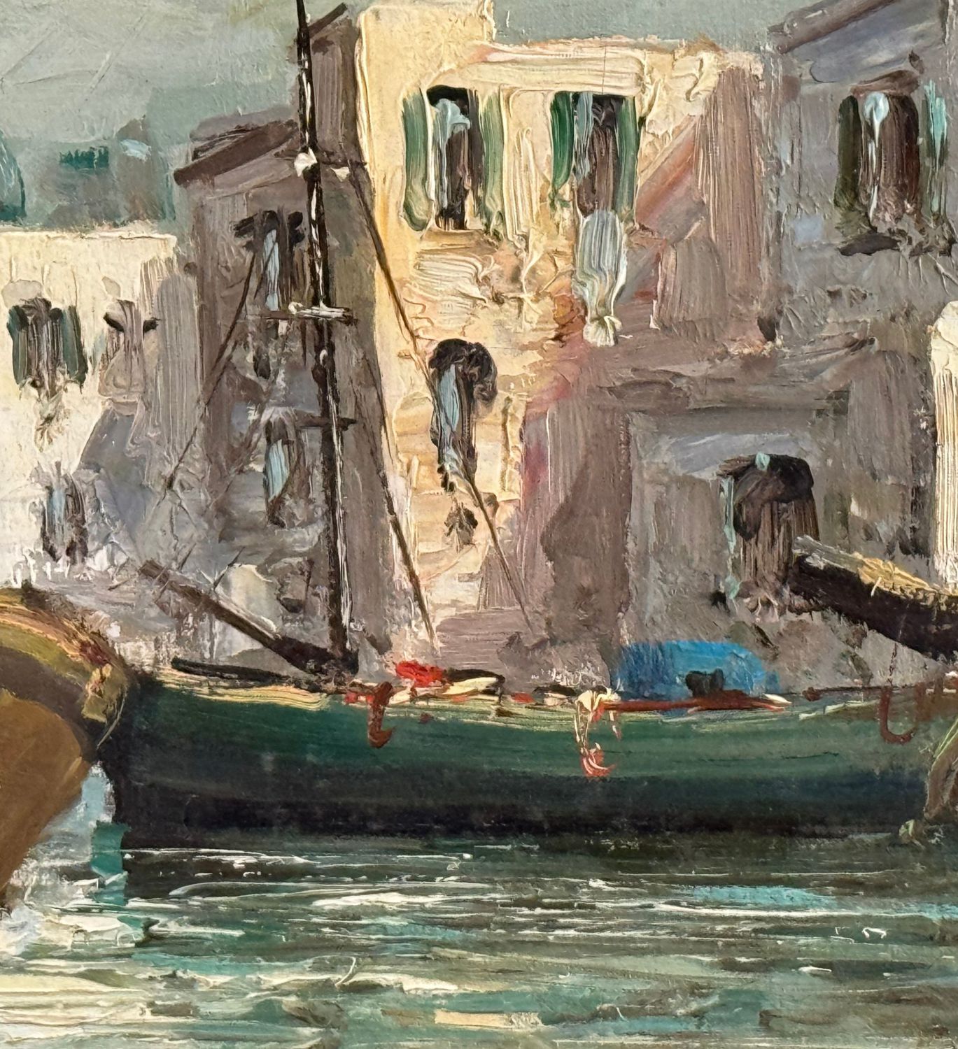 Dipinto olio su tela, periodo XX secolo scuola Italiana, raffigurante Marina con barche. Dimensioni: 70,5x50 cm. Reca firma in basso a destra (Probabile attribuzione a E. Briante). Opera in buone condizioni.