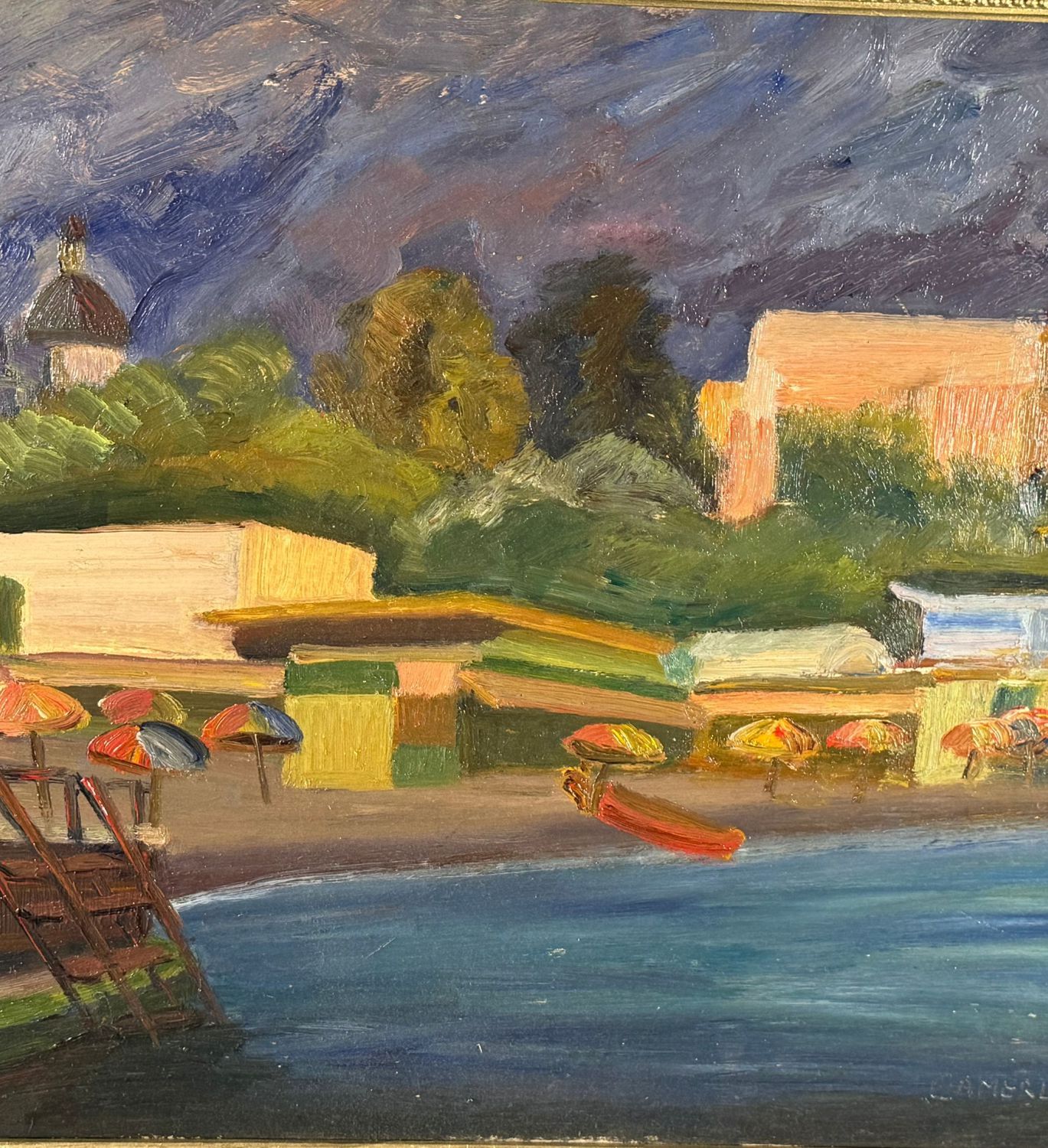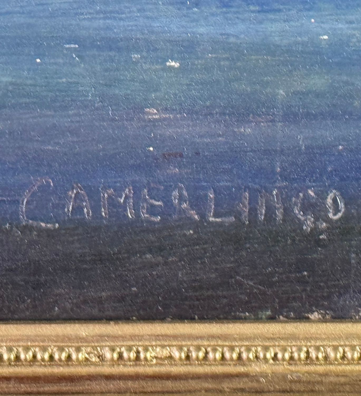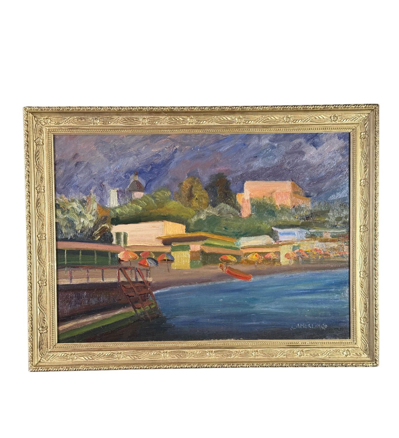 Dipinto olio su tavola, periodo XX secolo scuola Italiana, raffigurante Scorcio di marina. Dimensioni compreso cornice: 80x60 cm. Dimensioni interno cornice: 70x50 cm. Reca firma in basso a destra da Camerlingo. Opera in buone condizioni.