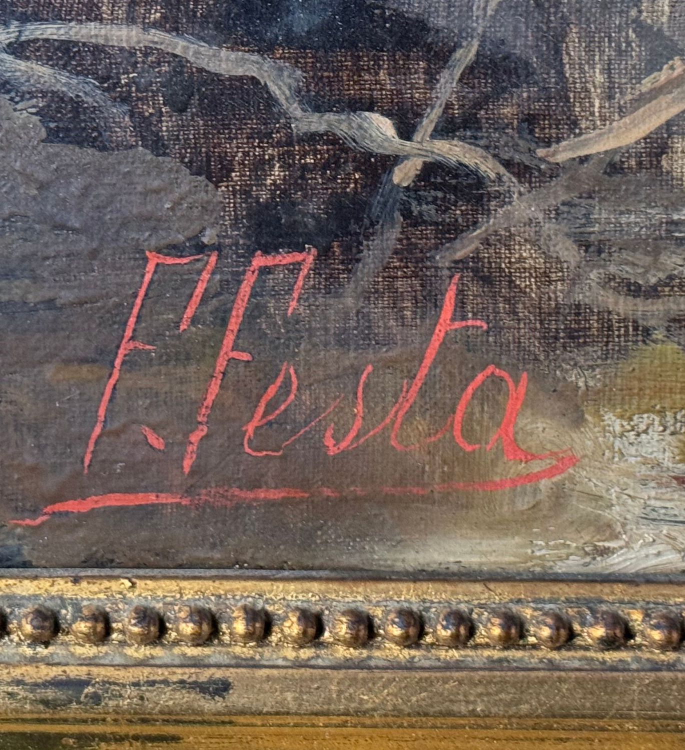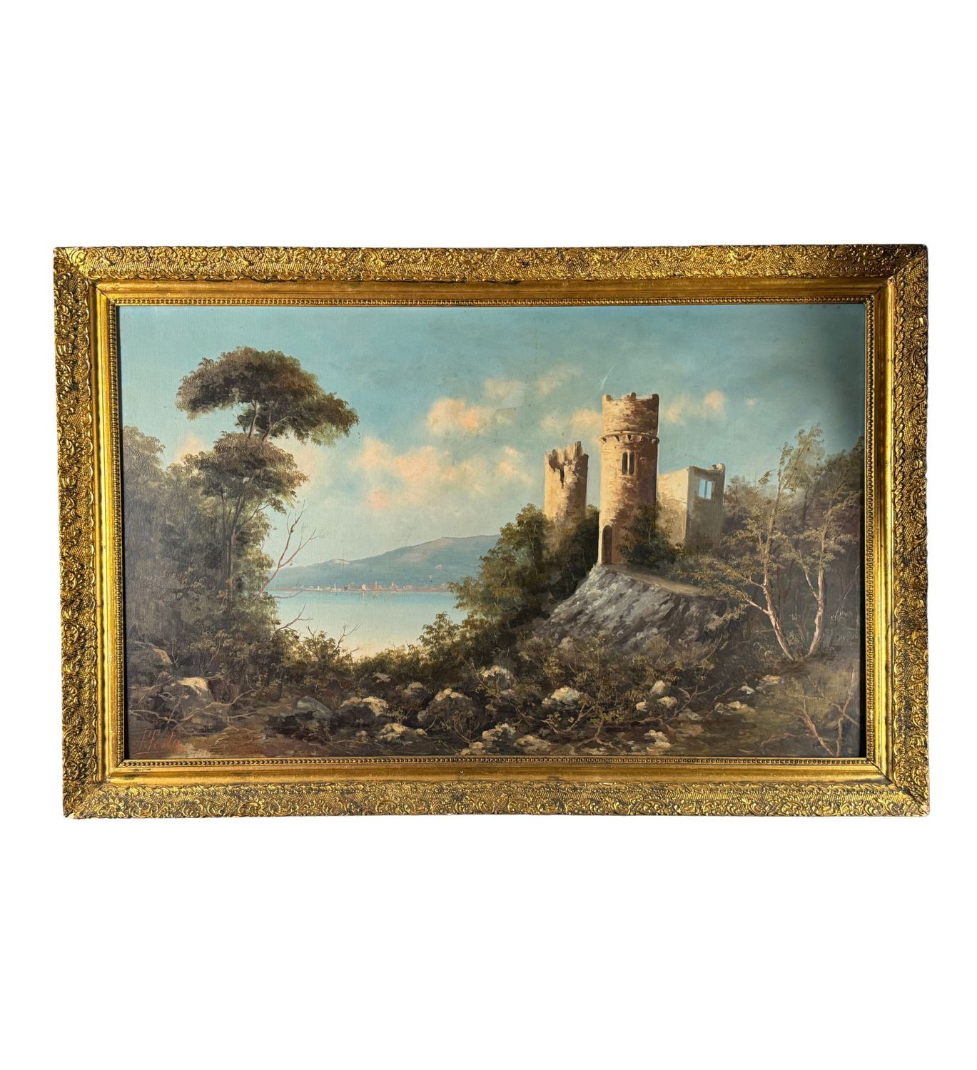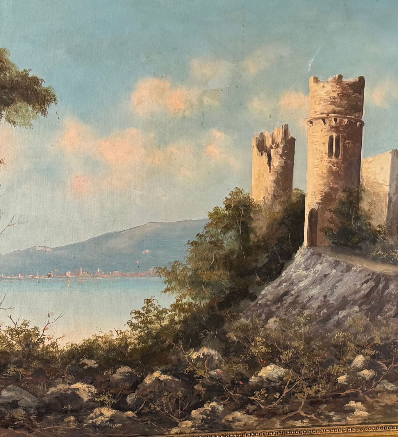 Dipinto olio su tela, periodo XIX/XX secolo scuola Italiana, raffigurante Paesaggio marino con ruderi. Dimensioni compreso cornice: 78x118 cm. Dimensioni interno cornice: 64x105 cm. Reca firma in basso a sinistra F. Festa. Opera in buone condizioni.