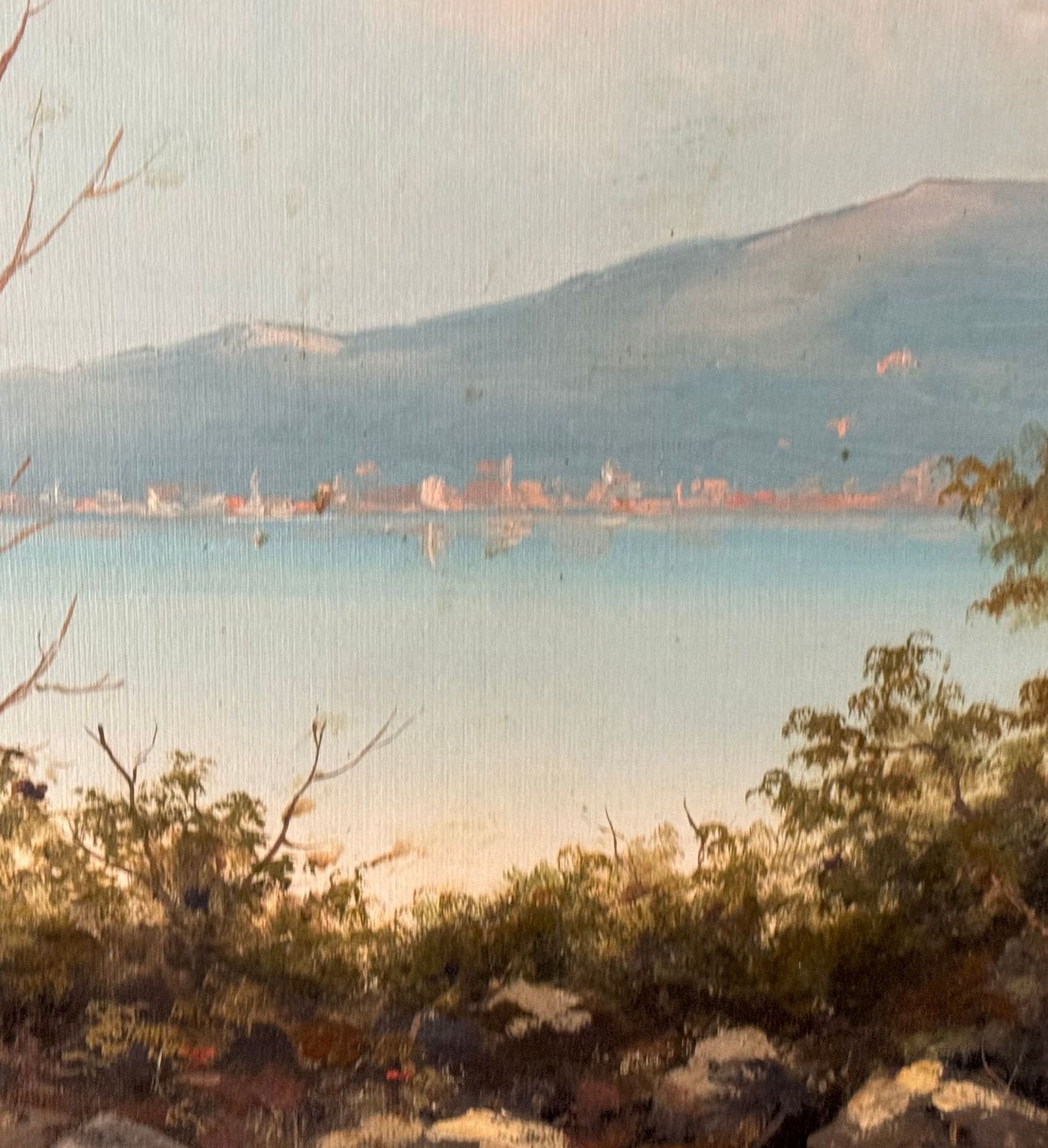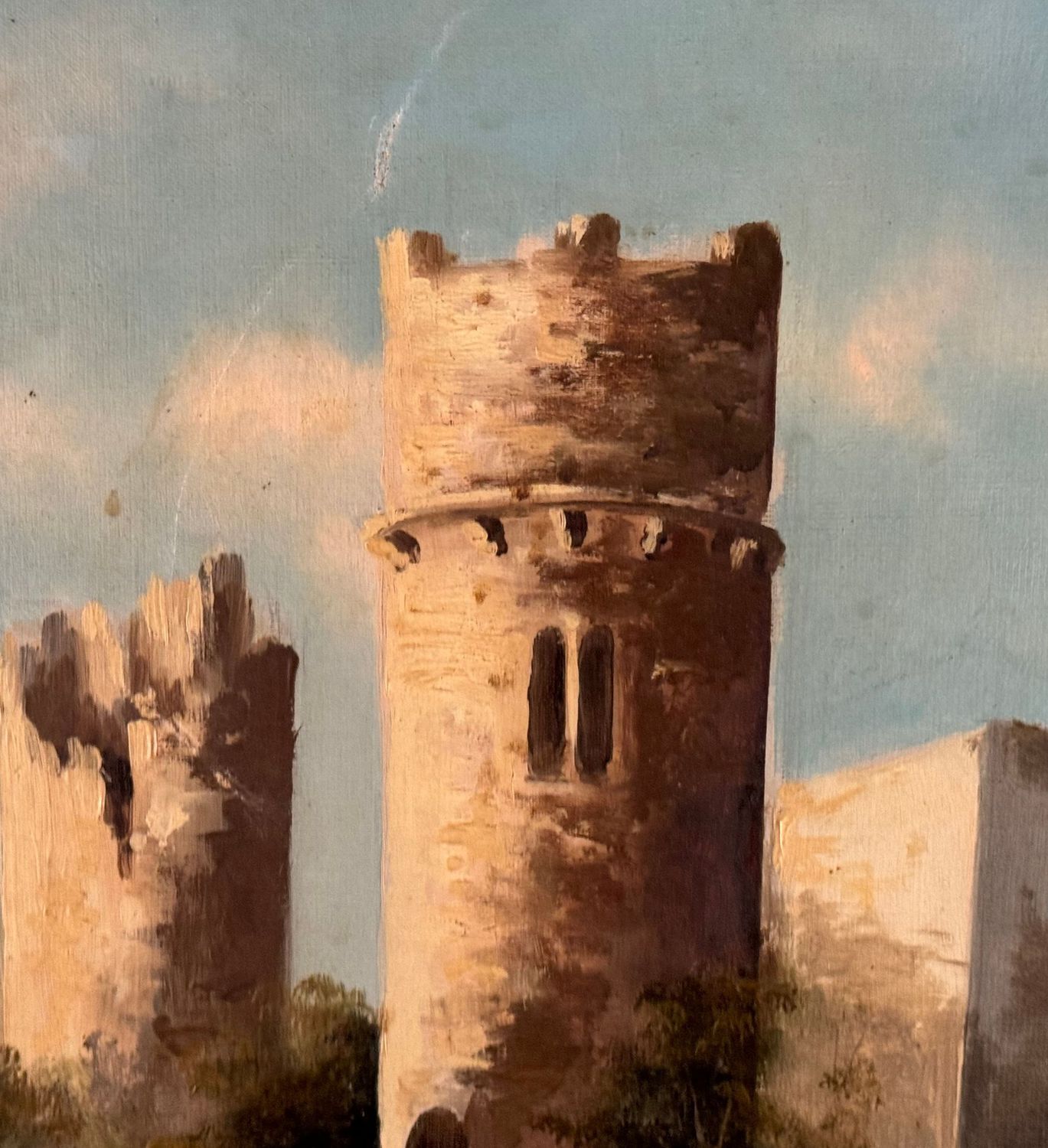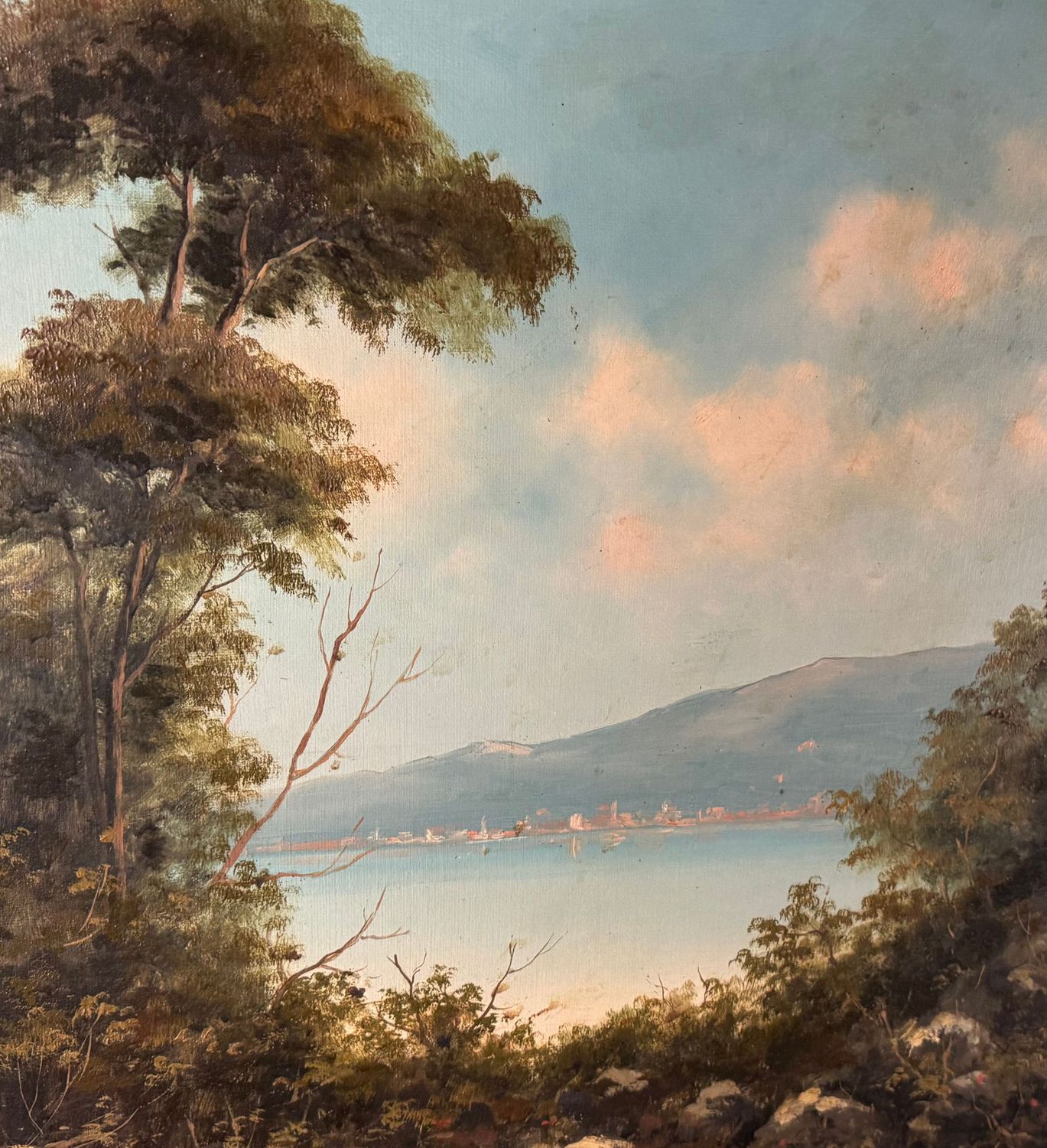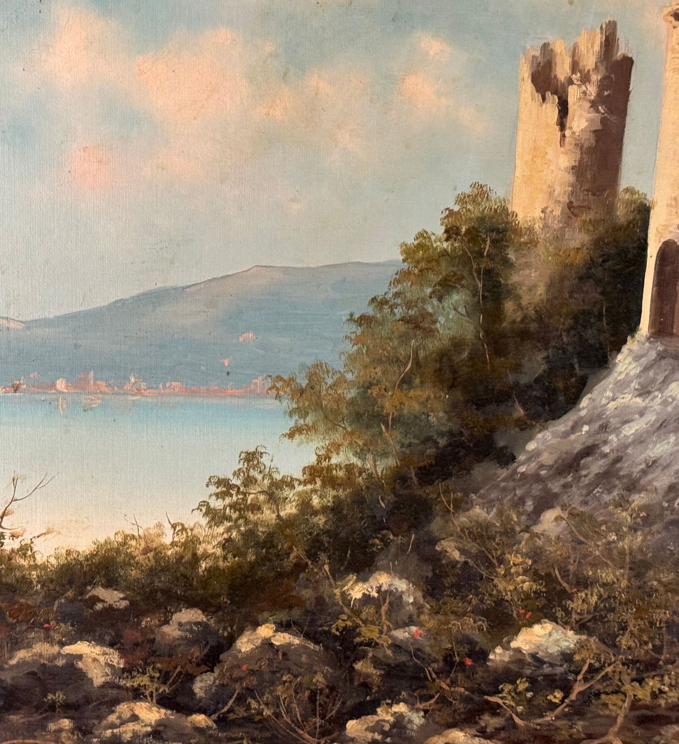 Dipinto olio su tela, periodo XIX/XX secolo scuola Italiana, raffigurante Paesaggio marino con ruderi. Dimensioni compreso cornice: 78x118 cm. Dimensioni interno cornice: 64x105 cm. Reca firma in basso a sinistra F. Festa. Opera in buone condizioni.
