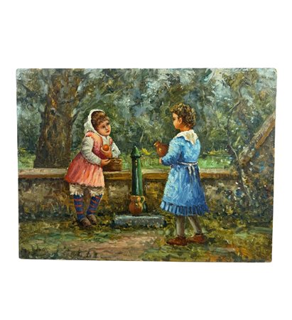 Dipinto olio su tavola, periodo XX secolo scuola Italiana, raffigurante Bambine alla fontana. Dimensioni: 40x30 cm. Da artista anonimo. Opera in buone condizioni.