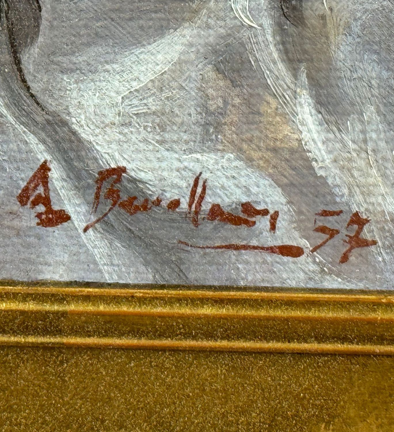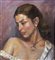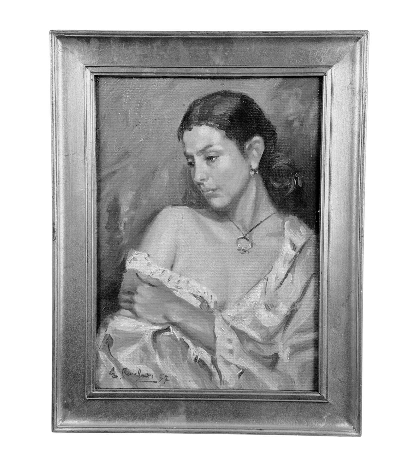 Dipinto olio su tela applicata su pannello, periodo XX secolo scuola italiana, raffigurante Ritratto di donna. Dimensioni compreso cornice: 36x46 cm. Dimensioni interno cornice: 26x37 cm. Reca firma in basso a sinistra da artista non identificato. Opera in buone condizioni.