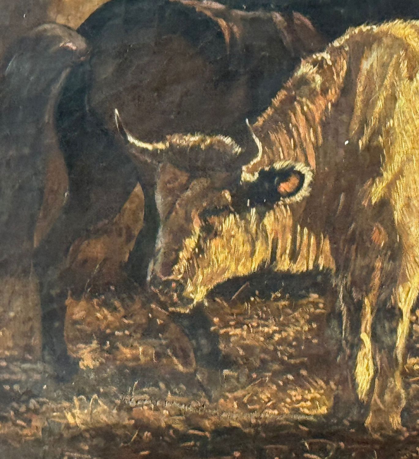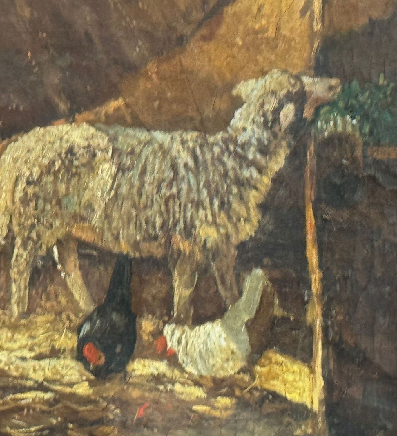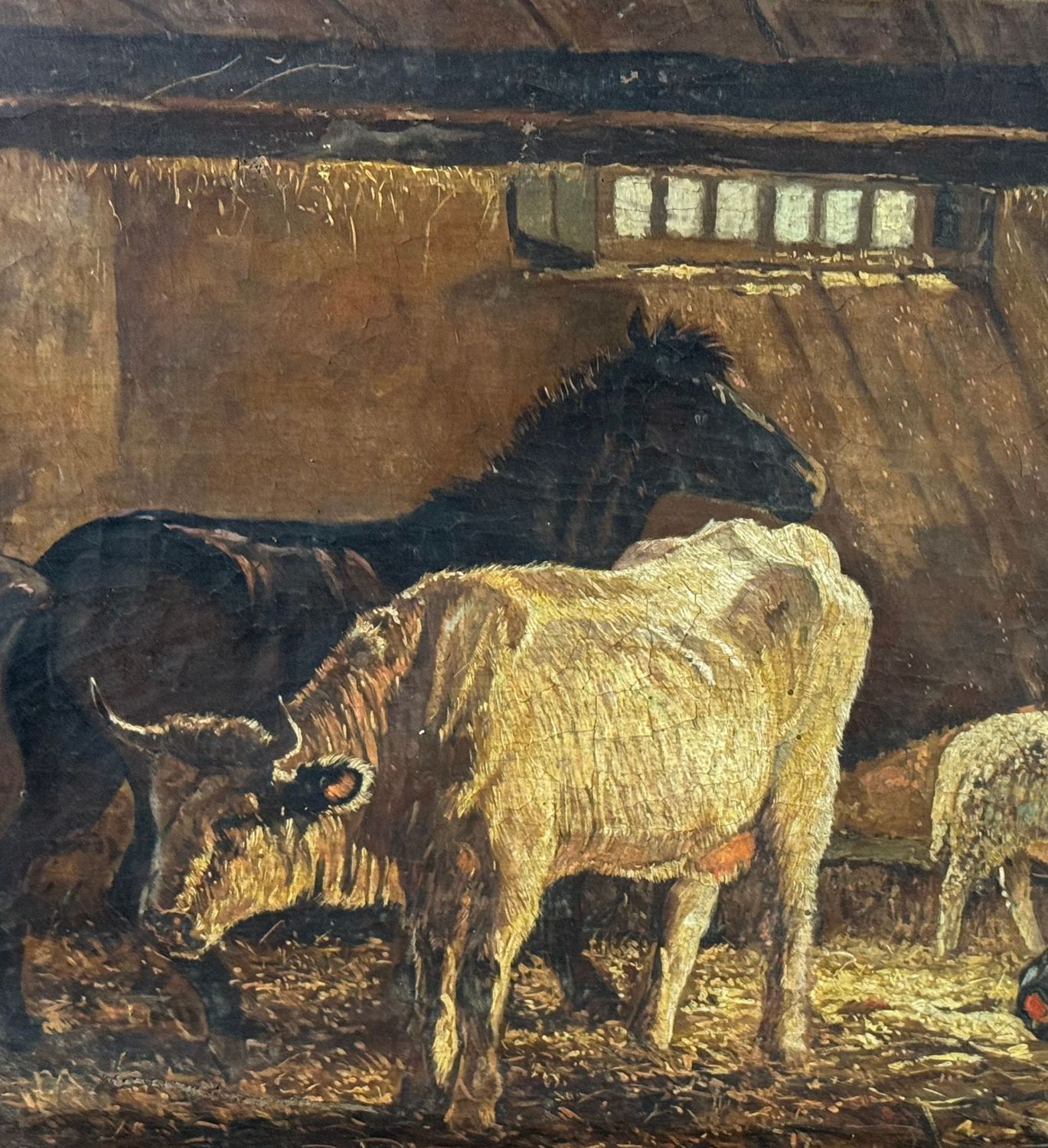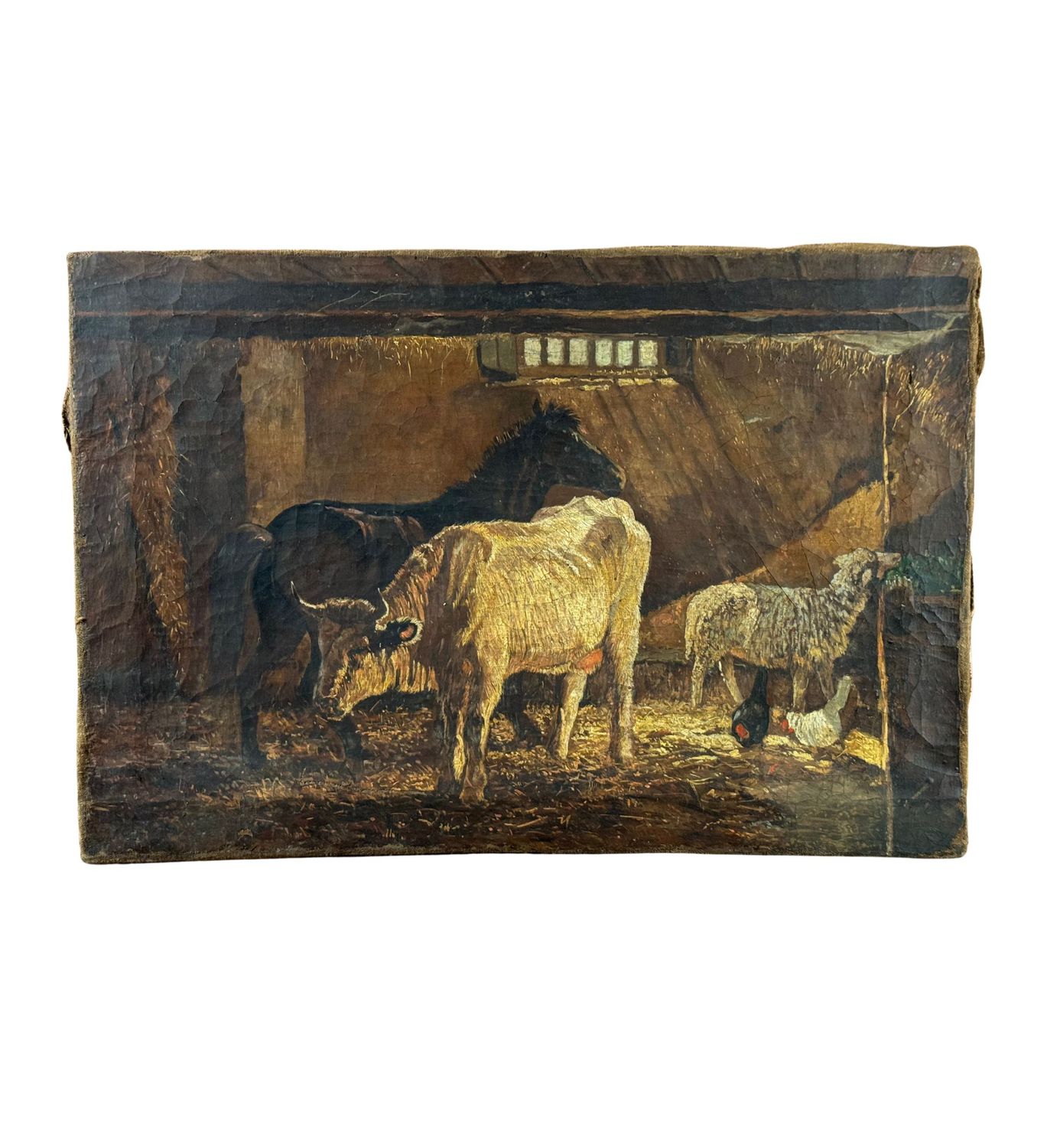Dipinto olio su tela, periodo XIX secolo scuola italiana, raffigurante Stalla con gregge. Dimensioni: 56,5x38,5 cm. Da artista anonimo. Opera in discrete condizioni.
