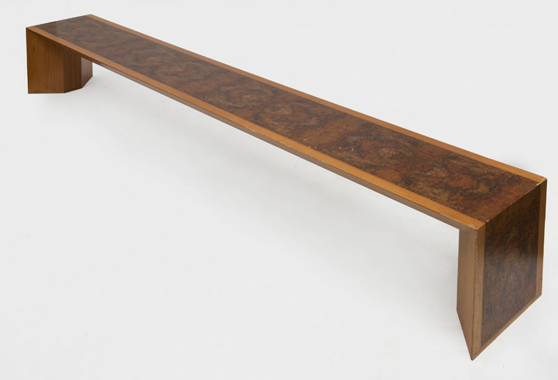 Guido Pietropoli (Rovigo 1945) - Grande panca in legno filettato e radica, esecuzione ebanisteria Lino Contin, Thiene, 1989. Pezzo unico su disegno (cm 330x45x45) (difetti)