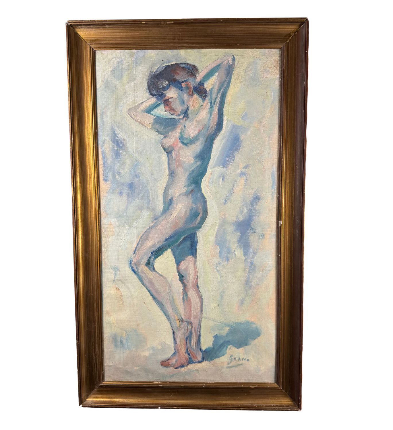 Dipinto olio su tela, periodo XX secolo scuola italiana, raffigurante Nudo di donna. Dimensioni compreso cornice: 60,5x102 cm. Dimensioni interno cornice: 49x89 cm. Reca frima in basso a destra da artista non identificato. Opera in buone condizioni.