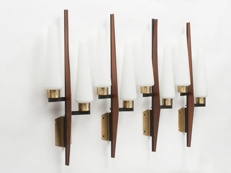 Gruppo di quattro lampade da parete a due luci, con struttura in ferro verniciato, inserti in legno, portalampada in lamina di ottone e paralumi in vetro lattimo acidato. Produzione italiana anni 60 del sec XX (difetti)