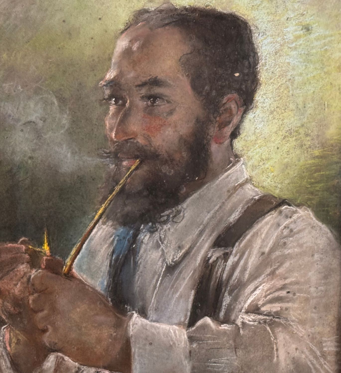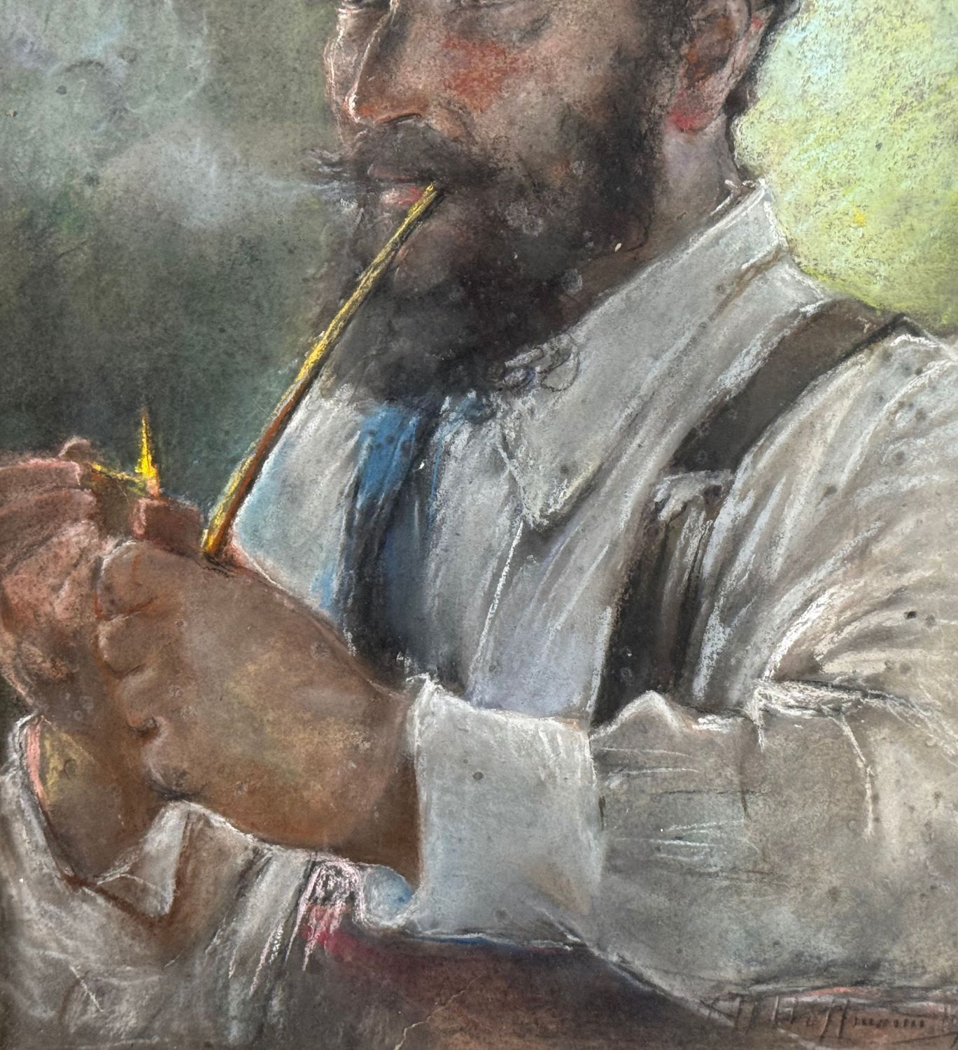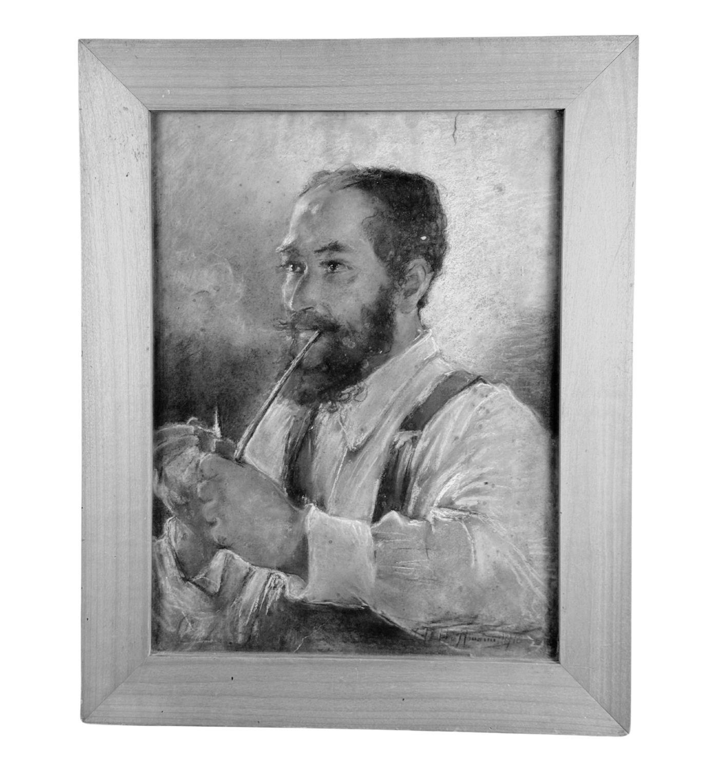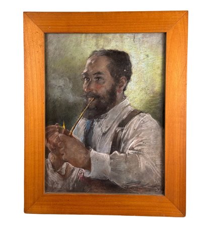Dipinto tecnica mista su cartoncino, periodo XX secolo scuola Italiana, raffigurante Ritratto di uomo con pipa. Dimensioni compreso cornice: 56x69,5 cm. Dimensioni interno cornice: 42x56 cm. Reca firma in basso a destra da artista non identificato. Opera in buone condizioni.