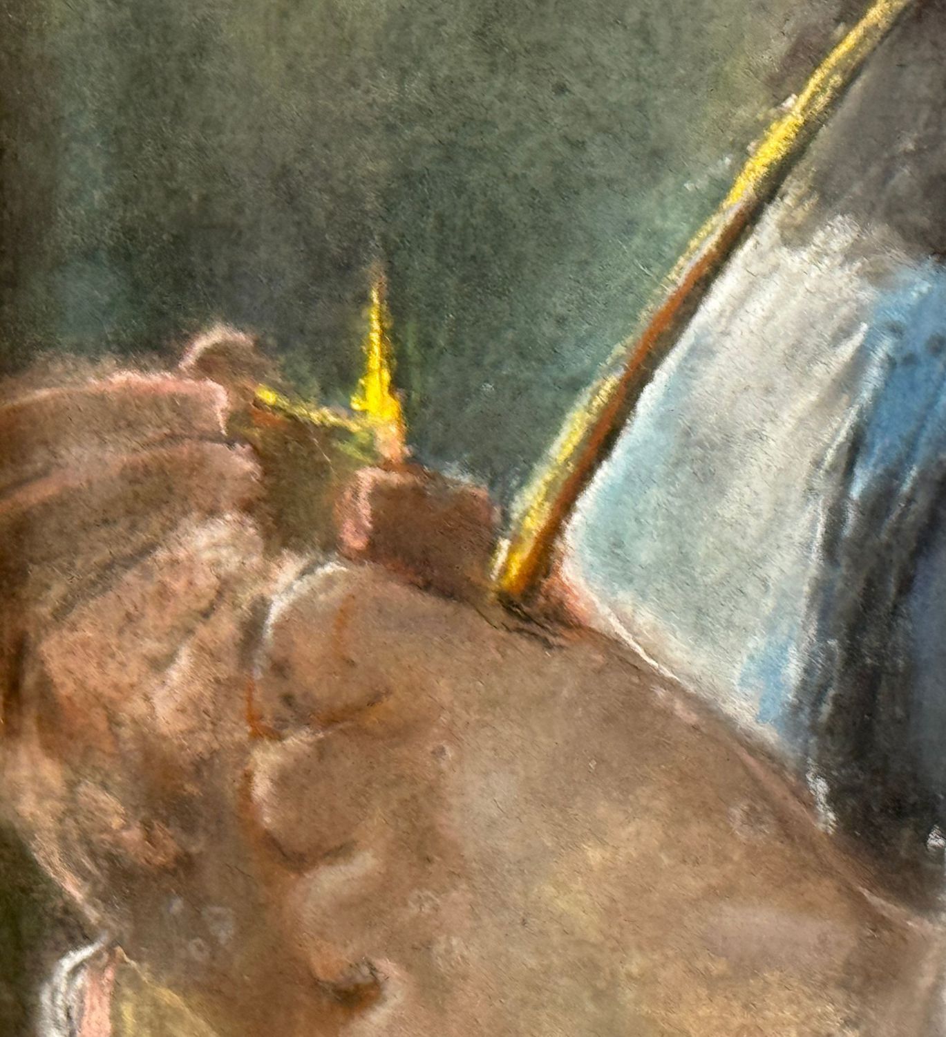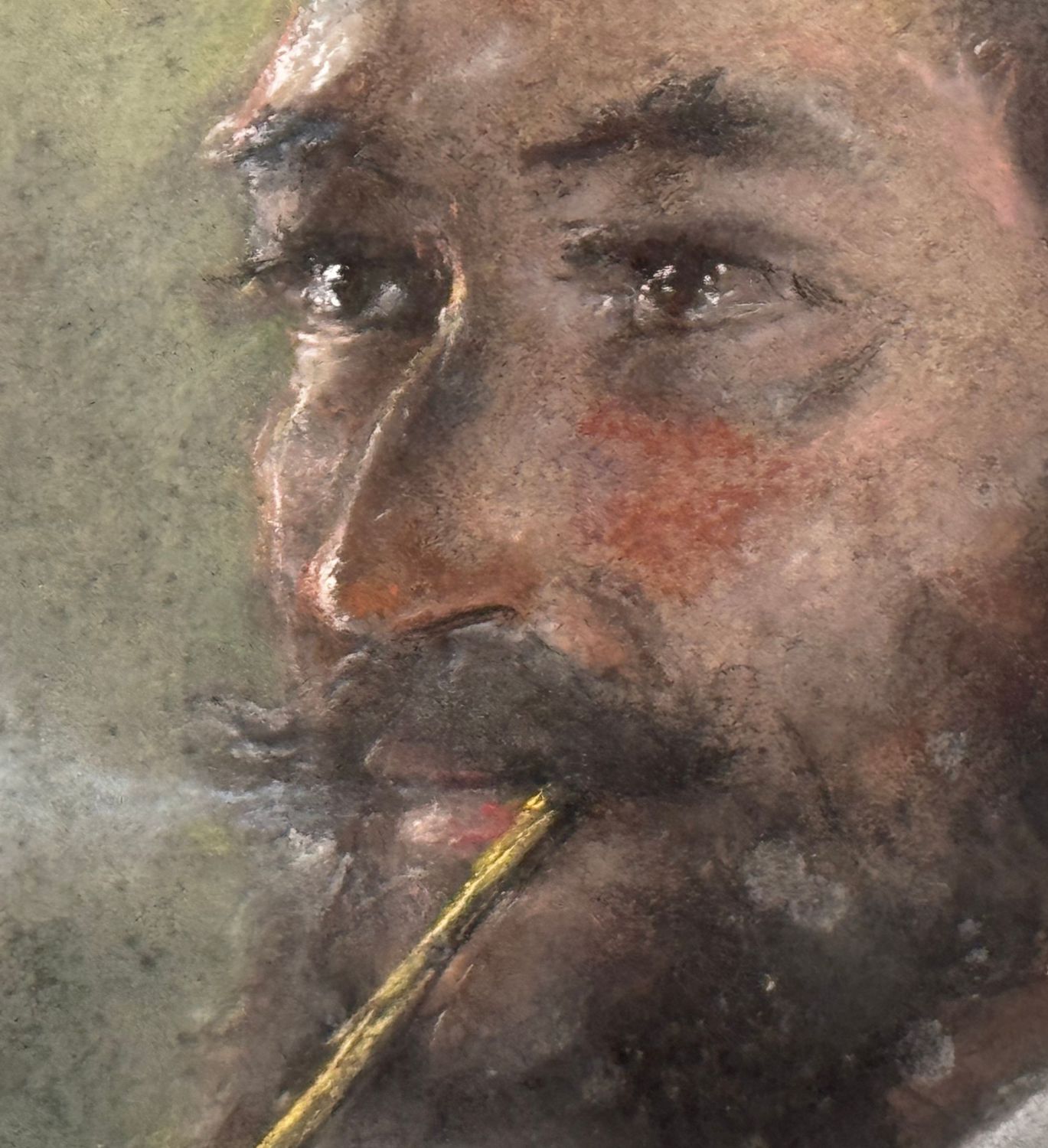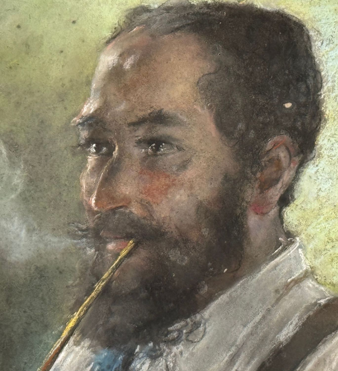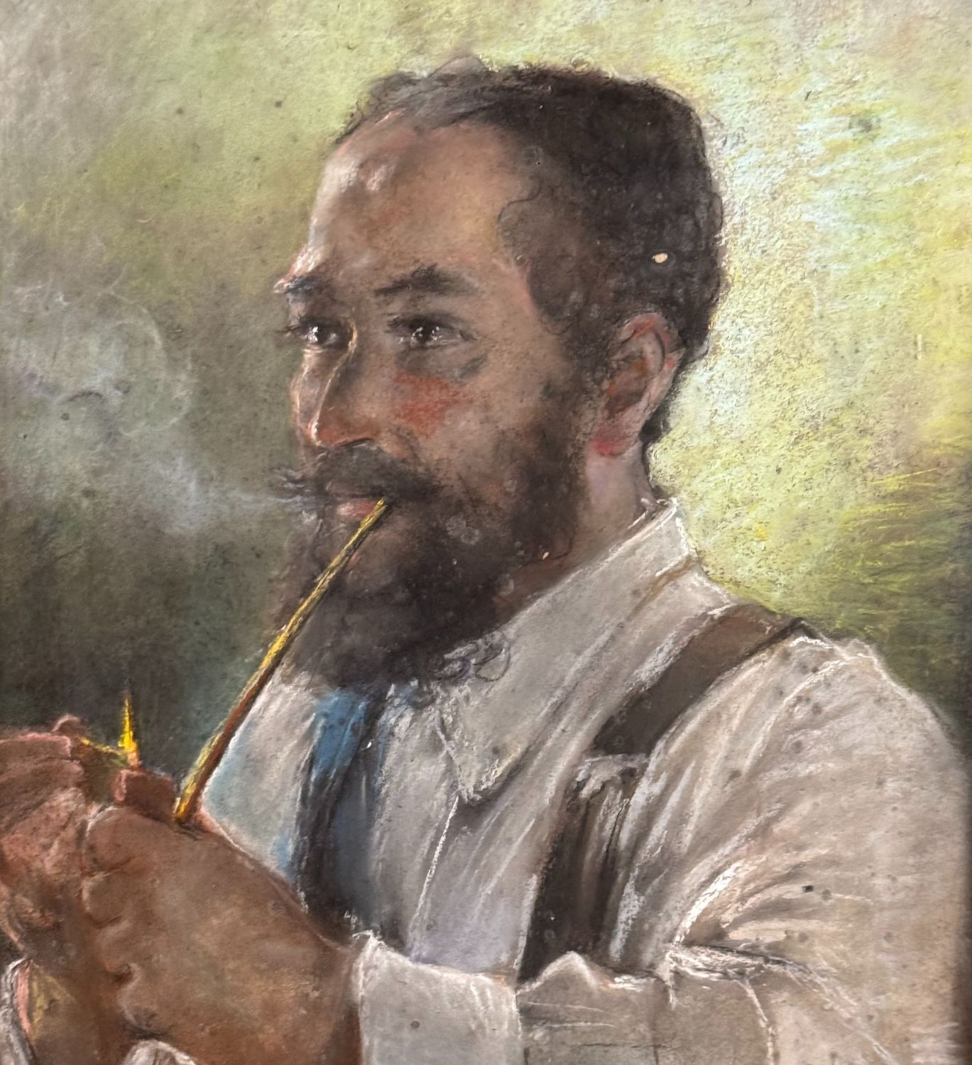 Dipinto tecnica mista su cartoncino, periodo XX secolo scuola Italiana, raffigurante Ritratto di uomo con pipa. Dimensioni compreso cornice: 56x69,5 cm. Dimensioni interno cornice: 42x56 cm. Reca firma in basso a destra da artista non identificato. Opera in buone condizioni.