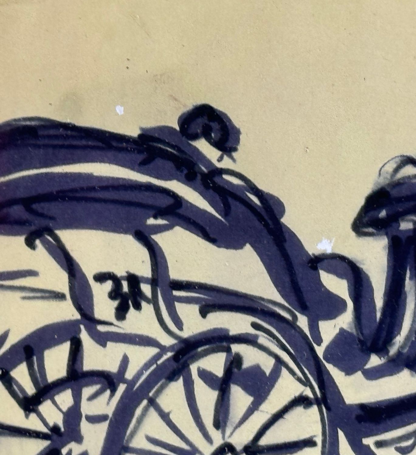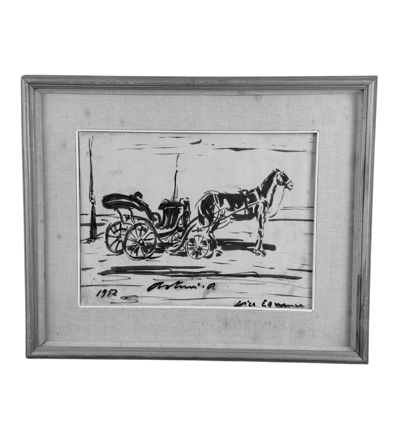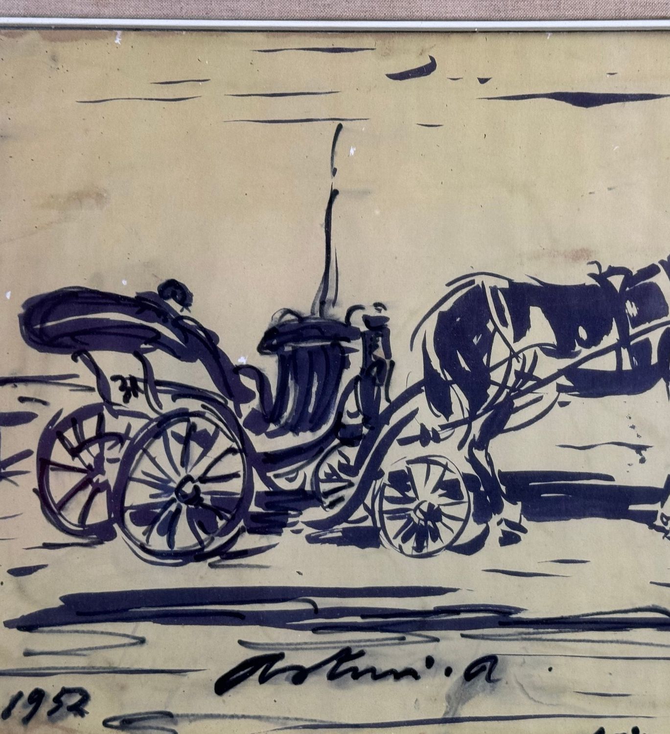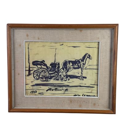 Acquerello su cartoncino, periodo XX secolo scuola Italiana, raffigurante Carrozza con cavallo. Dimensioni compreso cornice: 56,5x46,50 cm. Dimensioni interno cornice: 38,5x29 cm. Reca firma in basso Antonio Asturi (1904 - 1986). Opera in buone condizioni.
