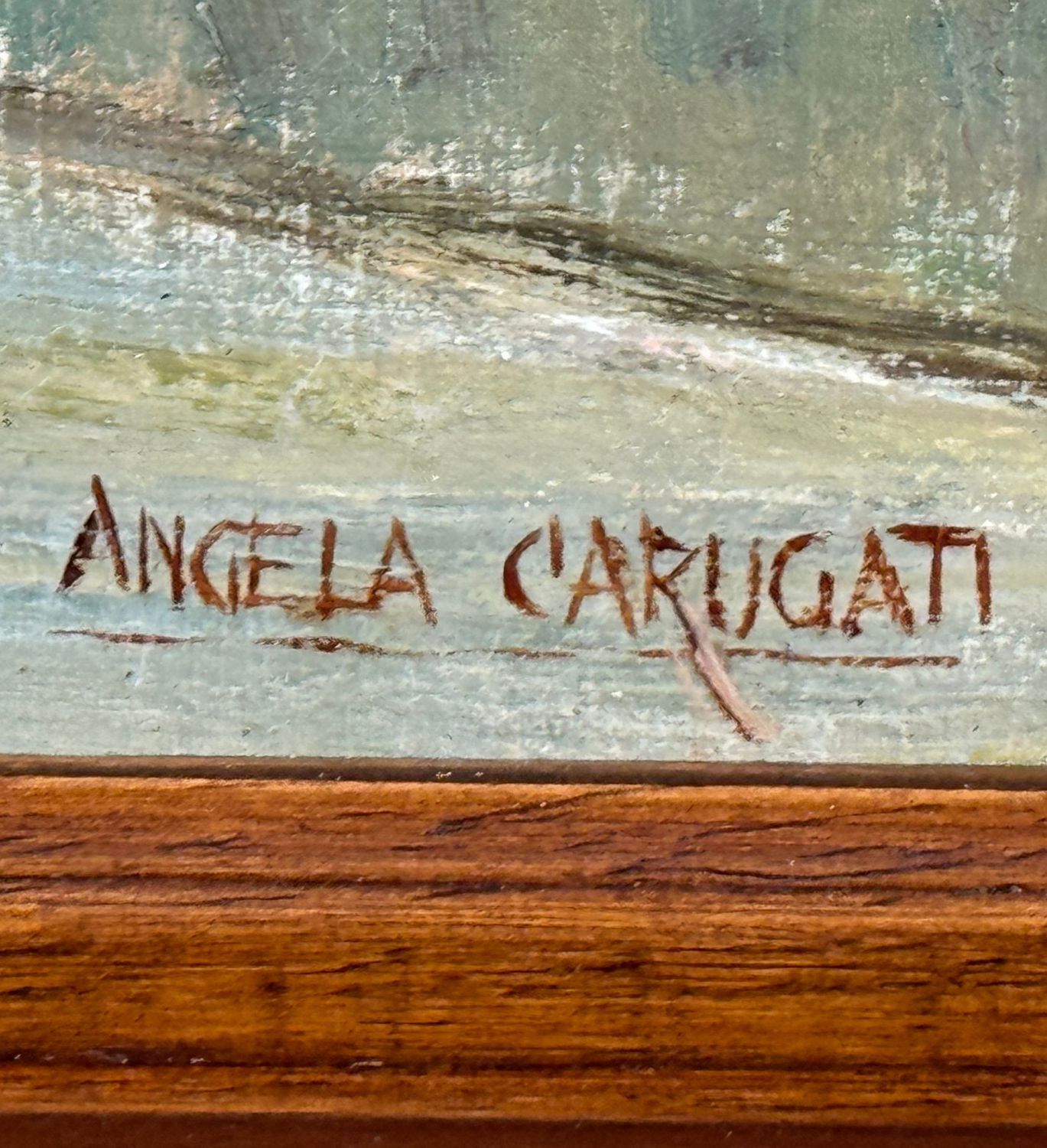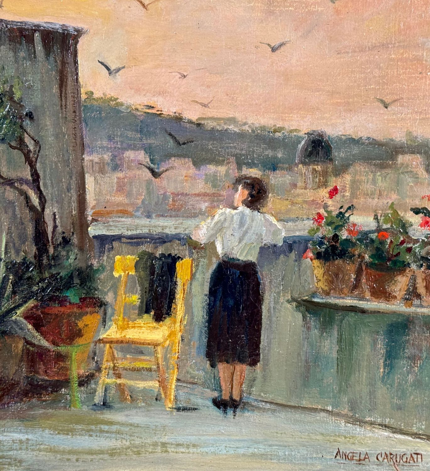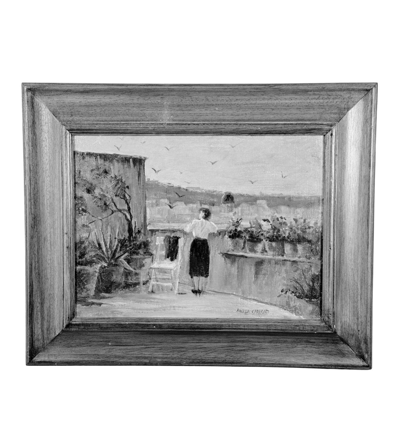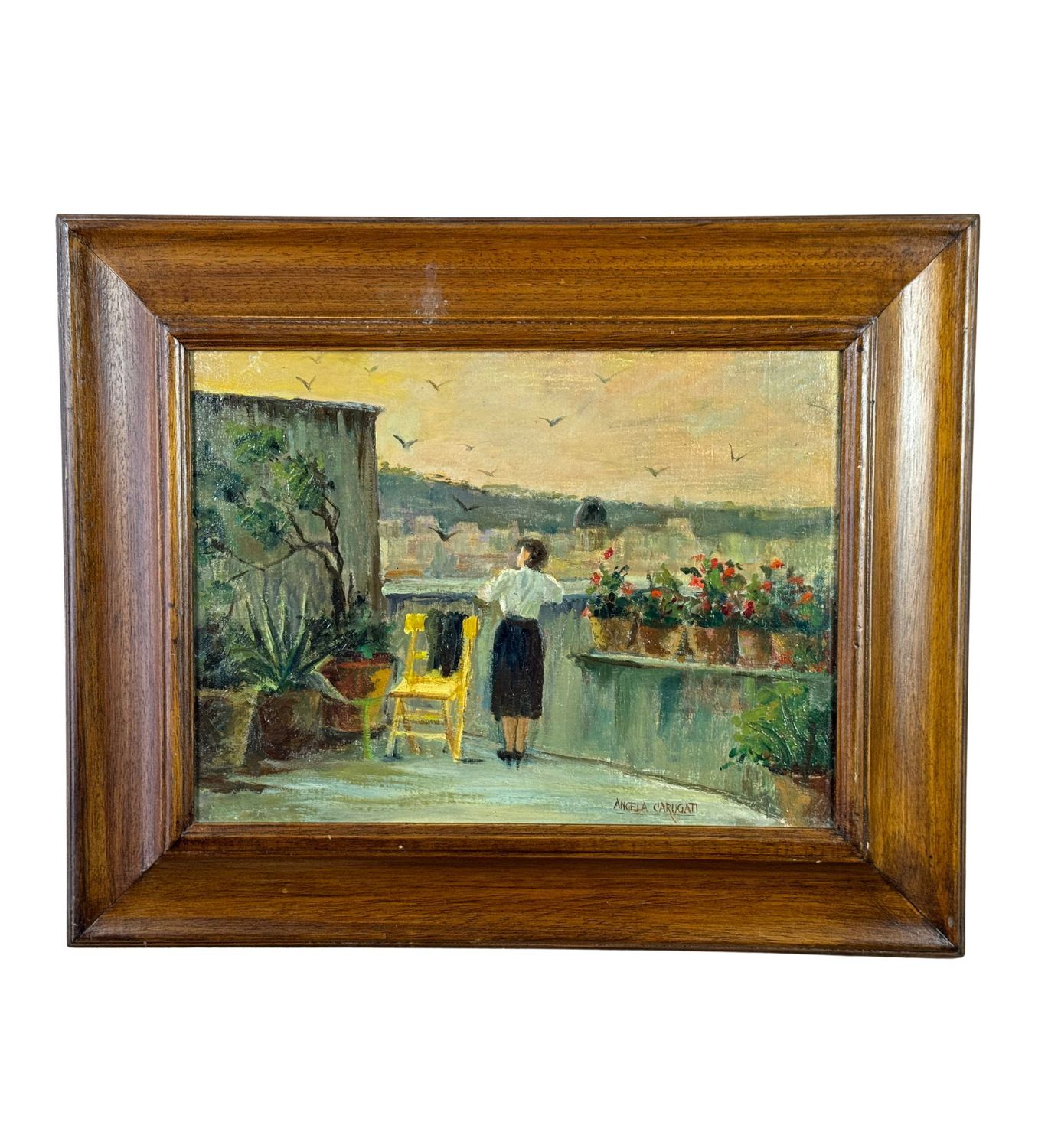 Dipinto olio su tela, periodo XX secolo scuola Italiana, raffigurante Donna in terrazza. Dimensioni compreso cornice: 56,5x46 cm. Dimensioni interno cornice: 41x31 cm. Reca firma in basso a destra da Angela Carugati (1881 - 1977). Opera in buone condizioni.