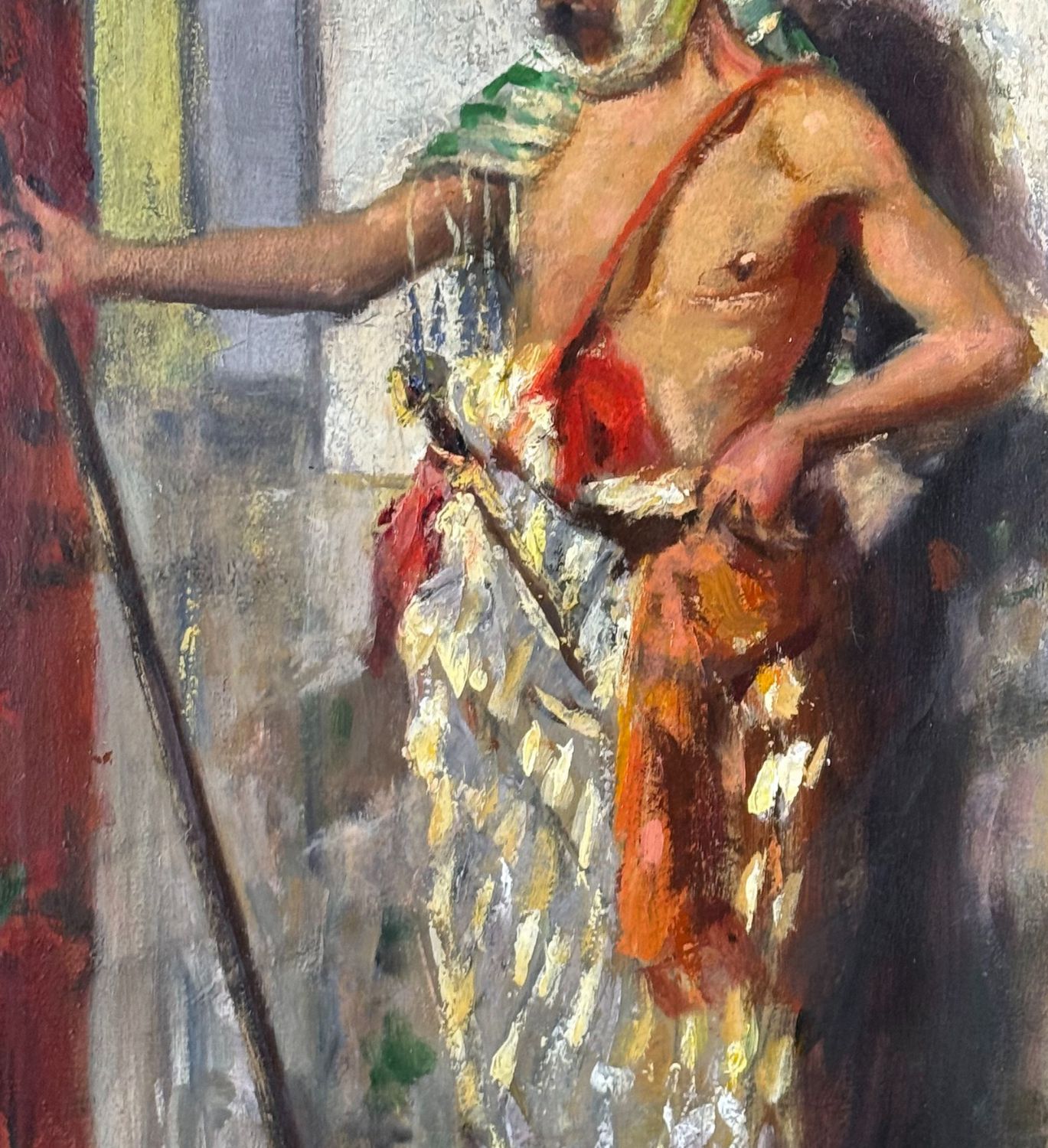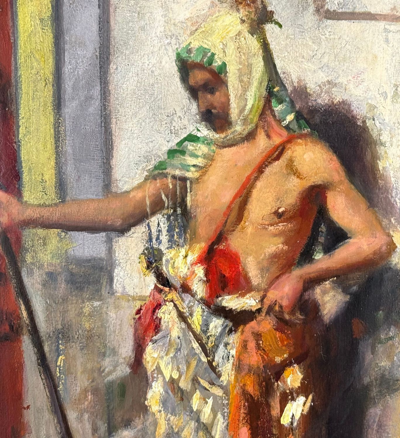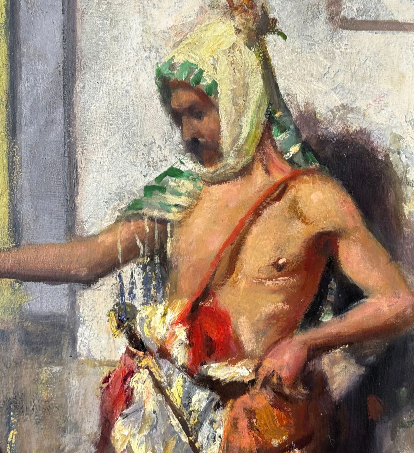 Dipinto olio su tela, periodo XX secolo, scuola Italiana, raffigurante Personaggio arabo. Dimensioni: 60x30 cm. Reca firma in basso a destra da artista non identificato. Opera in buone condizioni.