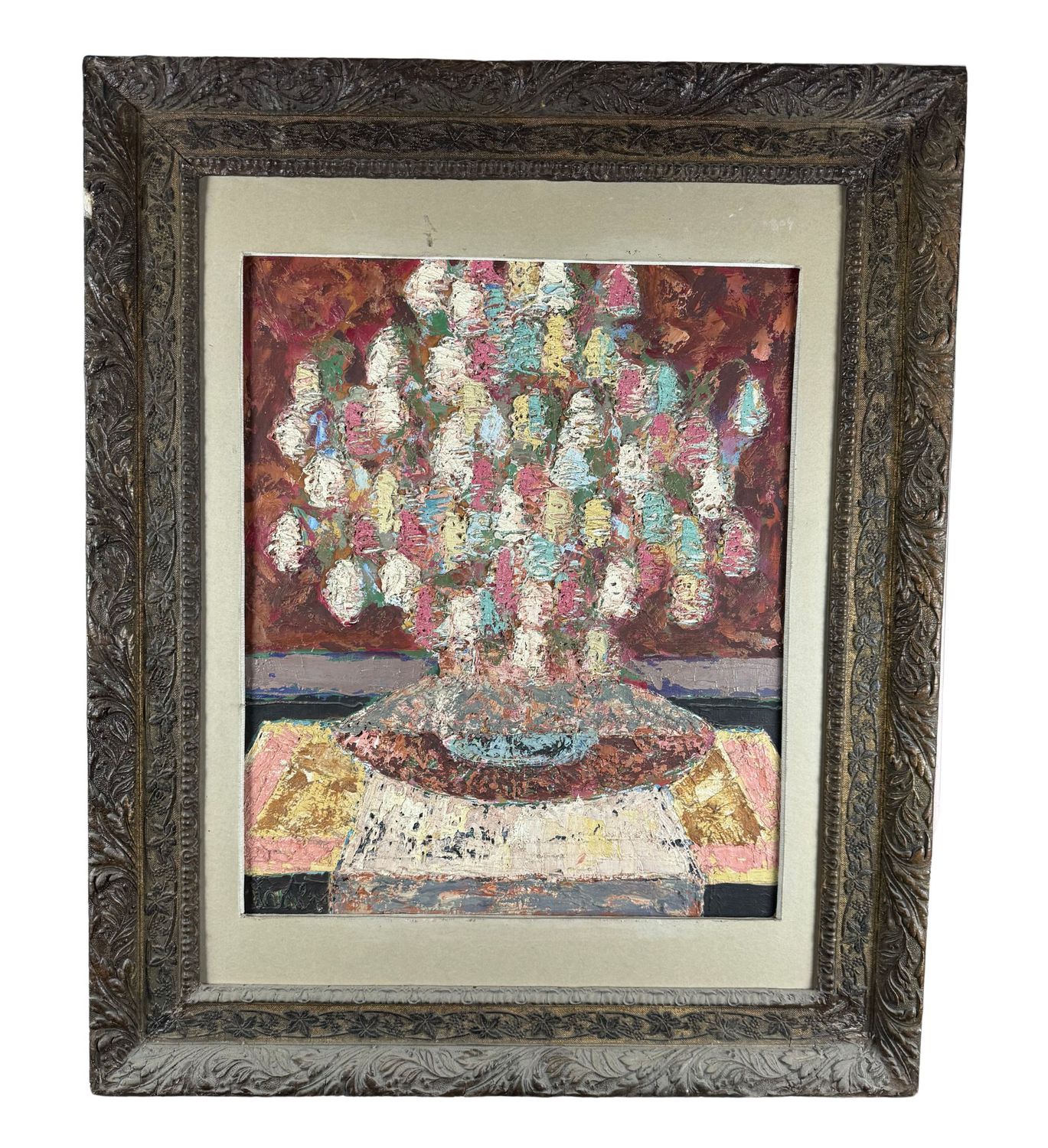 Dipinto olio su tela, periodo XX secolo scuola Italiana, raffigurante Fiori. Dimensioni compreso cornice: 73x88 cm. Dimensioni interno cornice: 50x70 cm. Reca firma in basso a sinistra e sul retro da Péter Prokop. Opera in buone condizioni e ricco di materia pittorica.