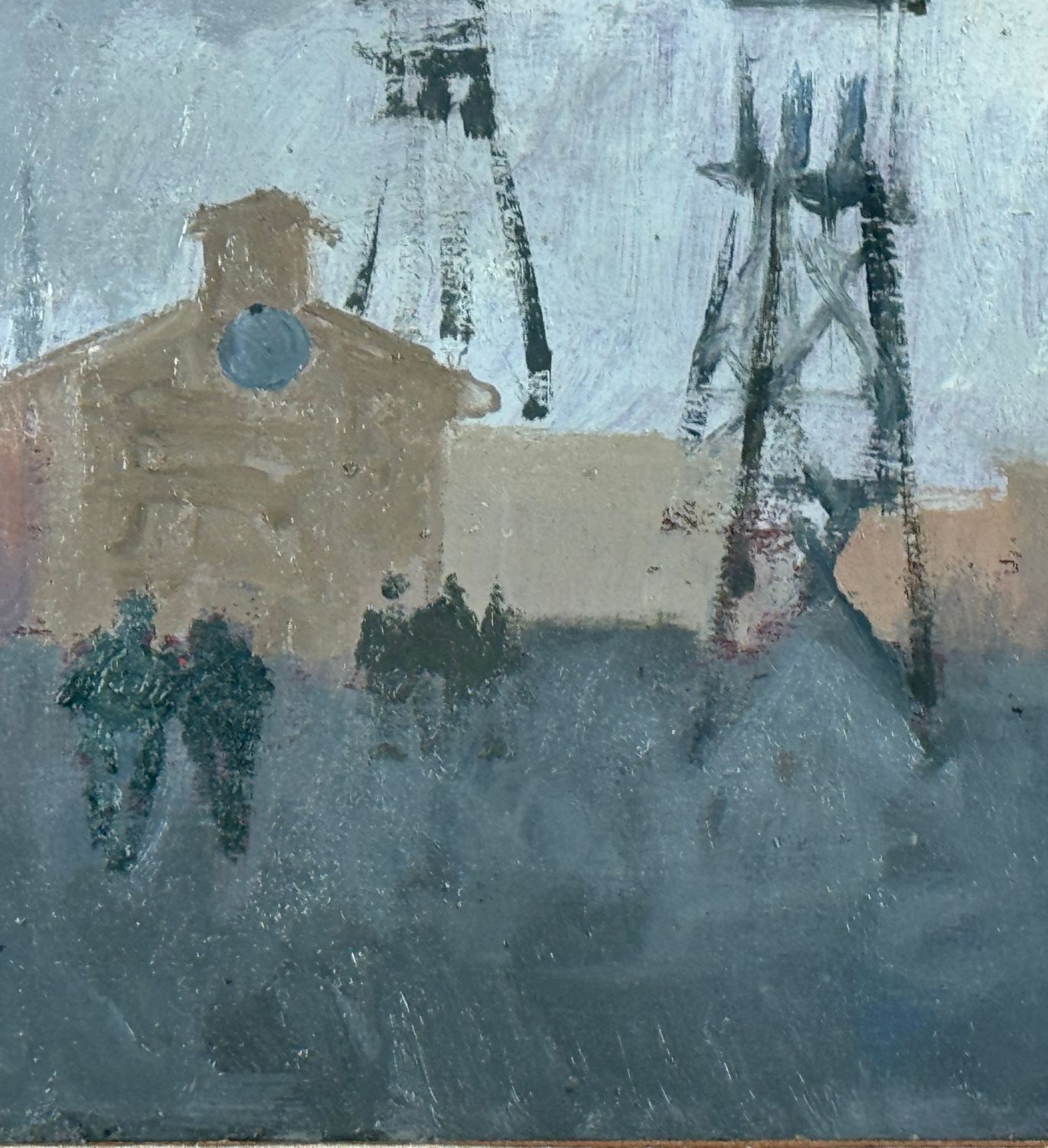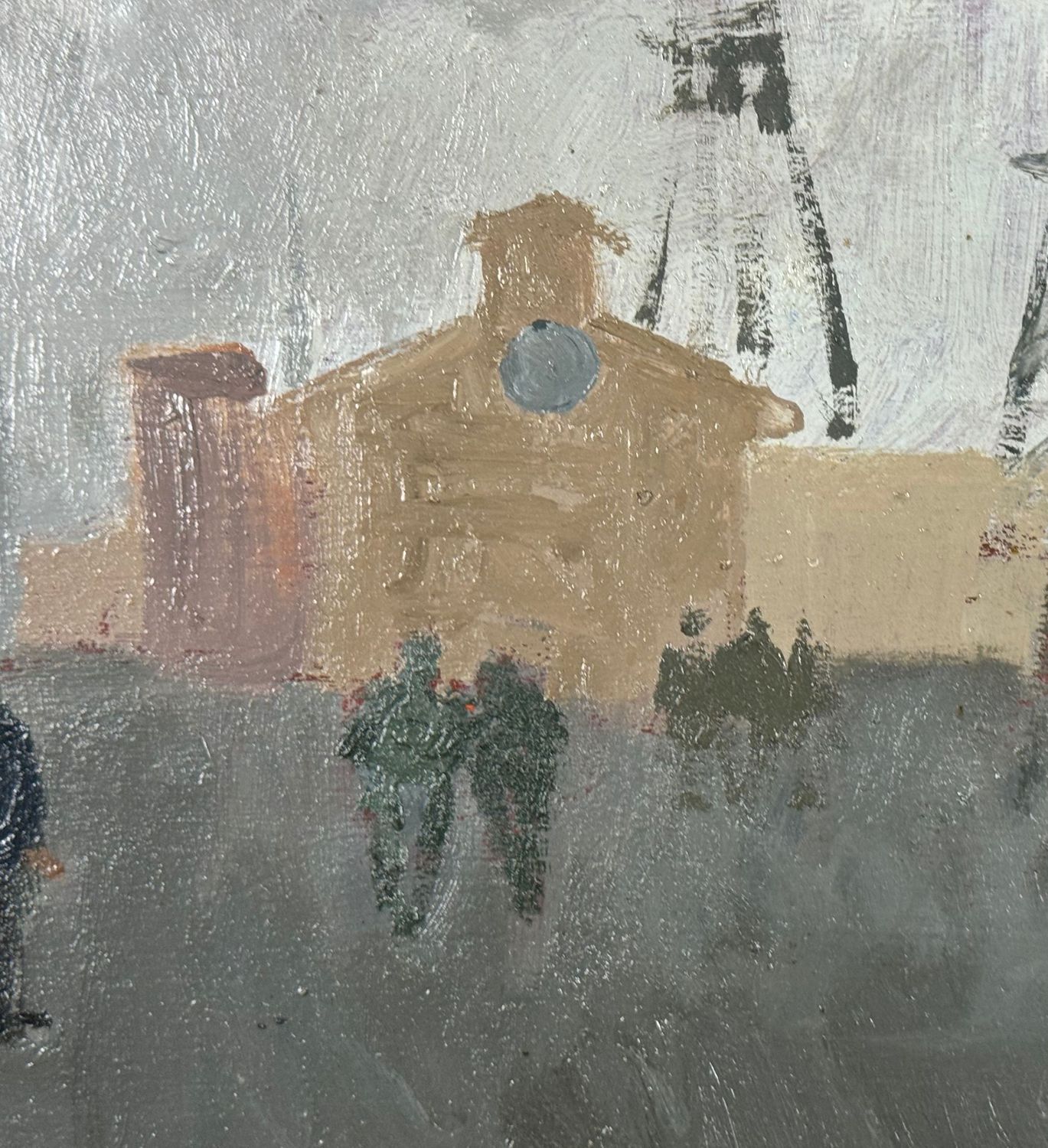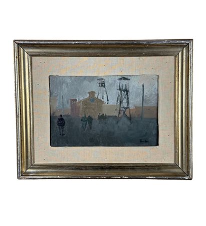 Dipinto olio su tavola, periodo XX secolo scuola Italiana, raffigurante Ingresso in fabbrica. Dimensioni compreso cornice: 48x38 cm. Dimensioni interno cornice: 31x21 cm. Reca firma in basso a destra da artista non identificato. Opera in buone condizioni.