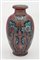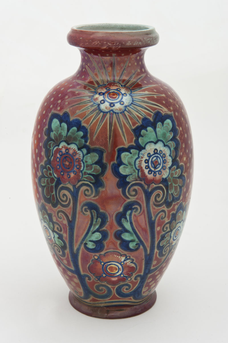 Galileo Chini (Firenze 1873 - 1956) - Vaso in ceramica decorata a smalti policromi e lustri metallici con motivi floreali e geometrici nei toni del blu, verde acqua, rosso e ocra. Fornaci San Lorenzo, 1920 ca. Marcato in blu sotto la base “Chini e co. / Mugello (Italia)” con monogramma della grata cerchiata e numerale “423/2618” (h cm 25,5)
