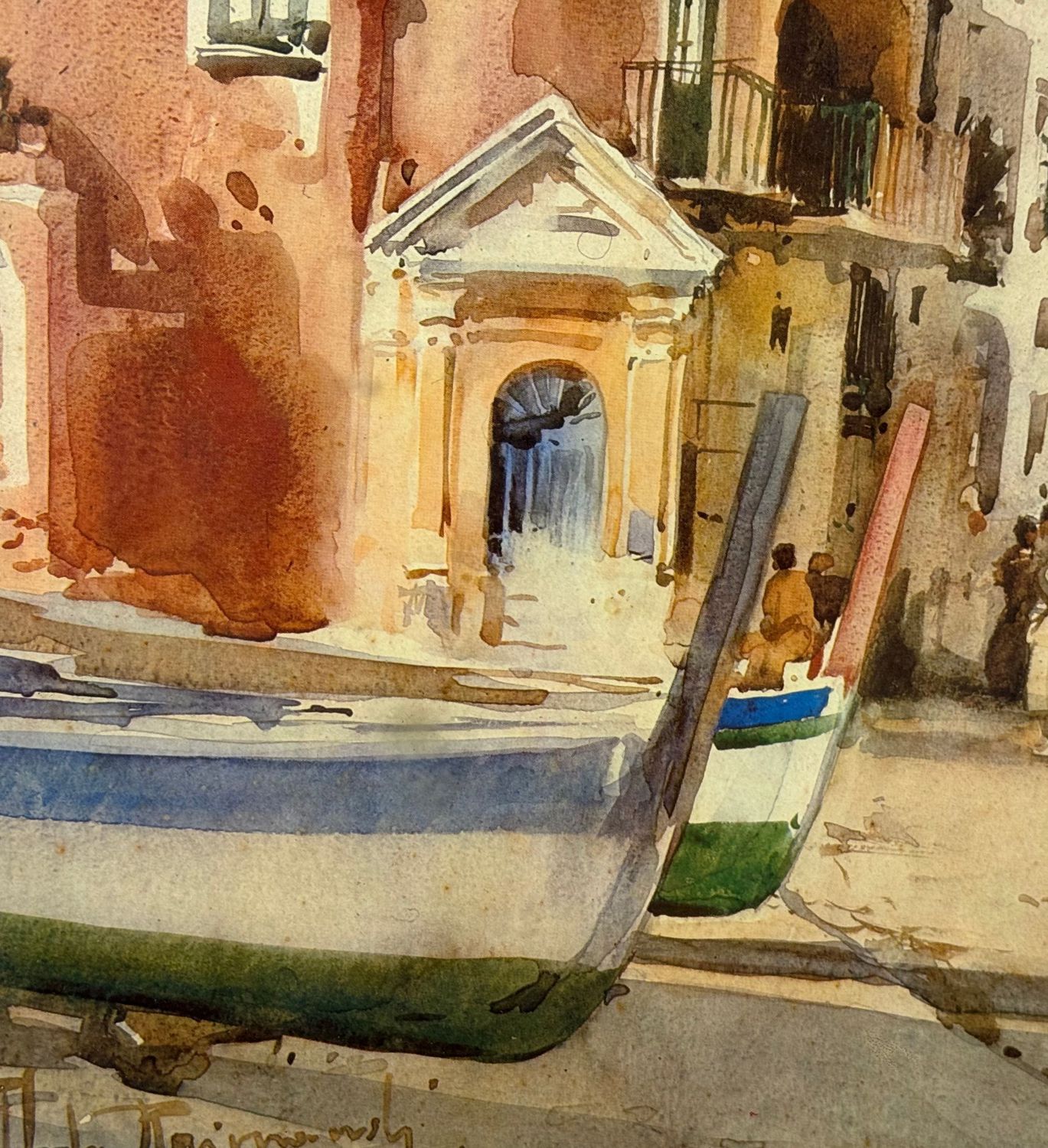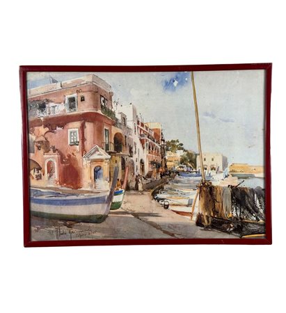 Tecnica mista su carta, periodo XX secolo scuola Italiana, raffigurante Marina di Capri. Dimensioni: 56x40 cm. Reca firma in basso a sinistra da artista non identificato. Opera in buone condizioni.