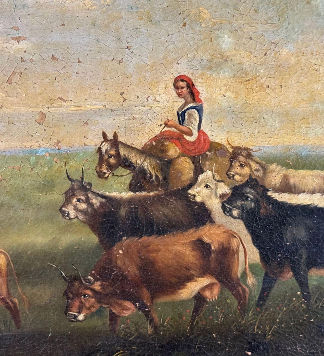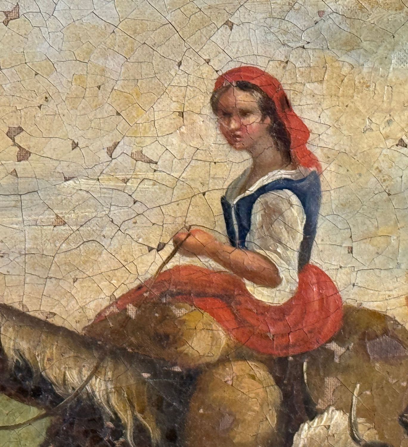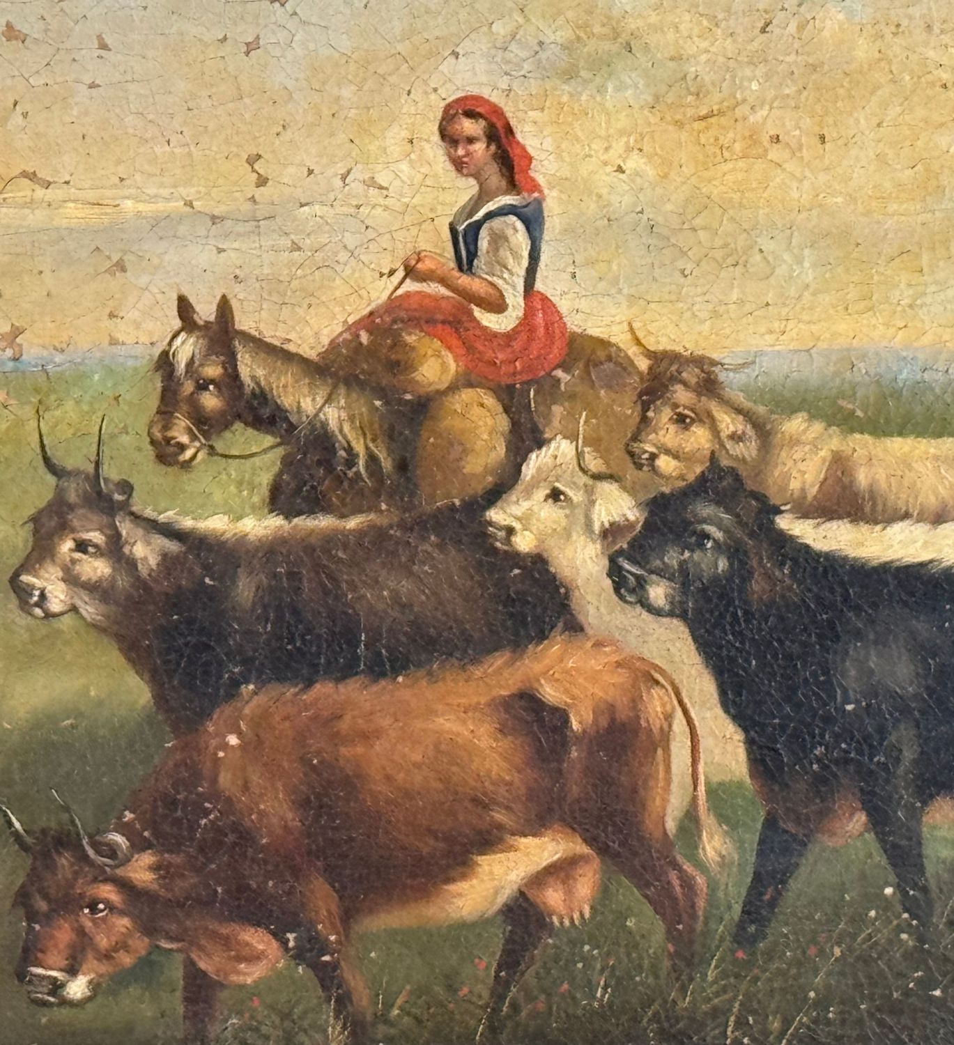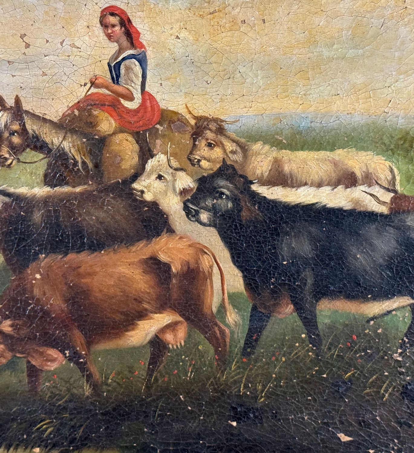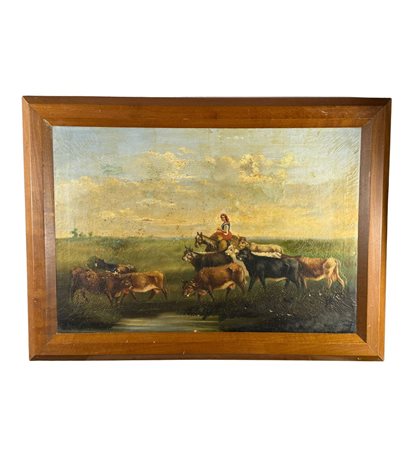 Dipinto olio su tela, periodo XIX secolo scuola Napoletana, raffigurante Contadine con gregge. Dimensioni compreso cornice: 89x84 cm. Dimensioni interno cornice: 76x52 cm. Da artista anonimo. Opera in discrete condizioni.