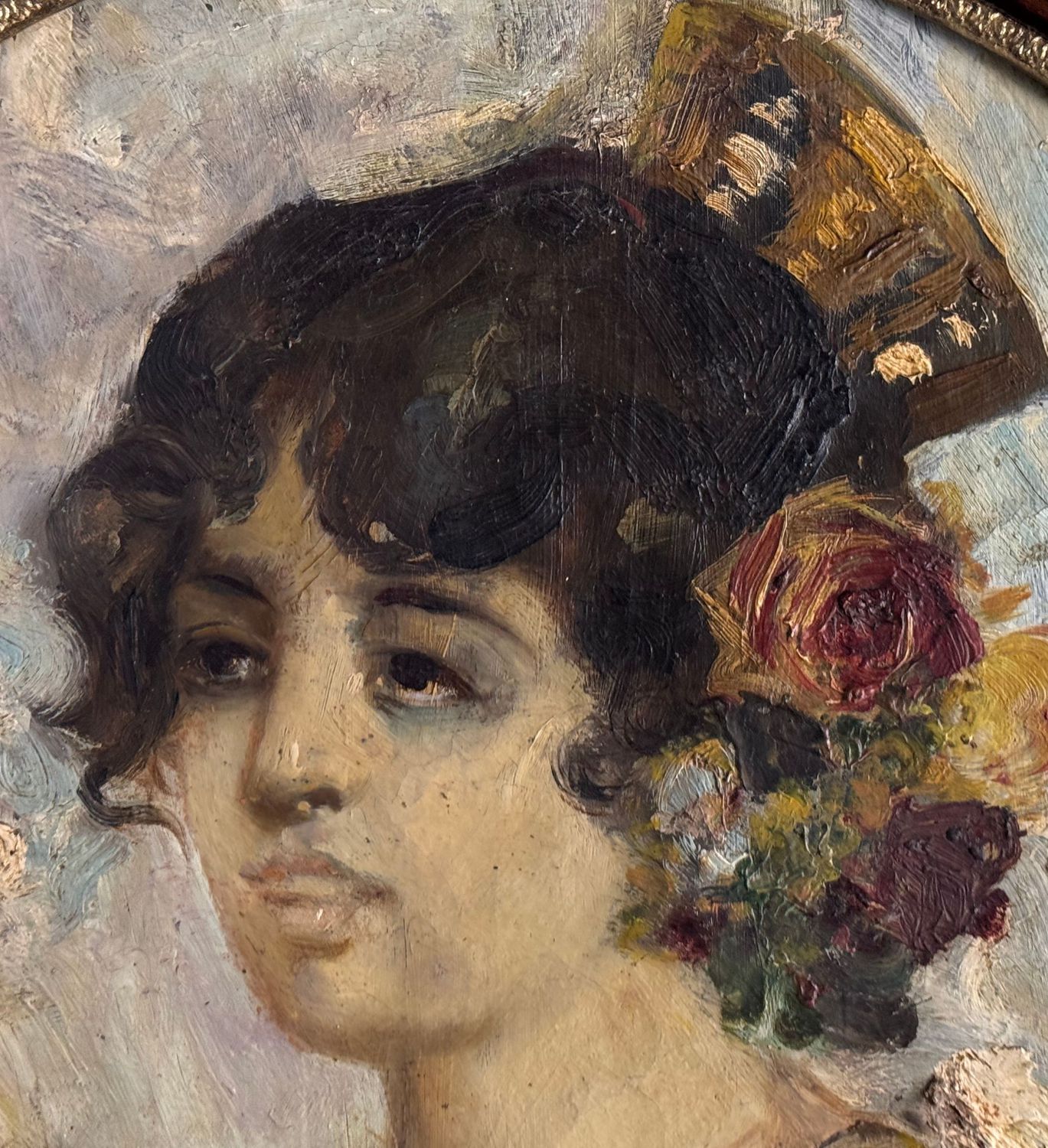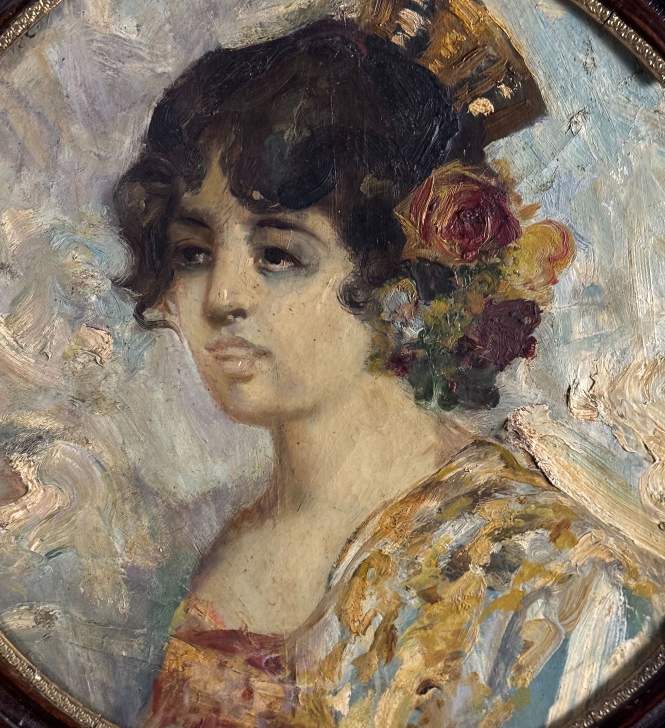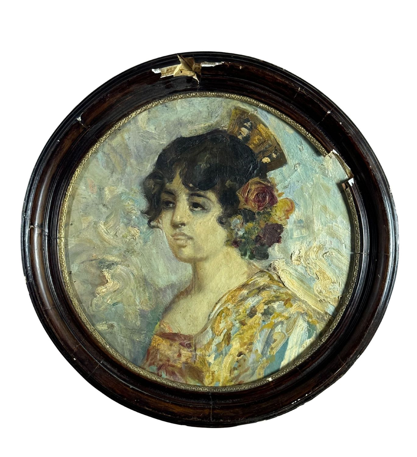 Dipinto olio su pannello di forma tonda, periodo XX secolo scuola Napoletana, raffigurante Ritratto di giovane donna. Dimensioni compreso cornice: 64x64 cm. Dimensioni interno cornice: 50x50 cm. Da artista anonimo. Opera in buone condizioni con lievi segni di vissuto come da foto allegate. Cornice difetti e mancanze.