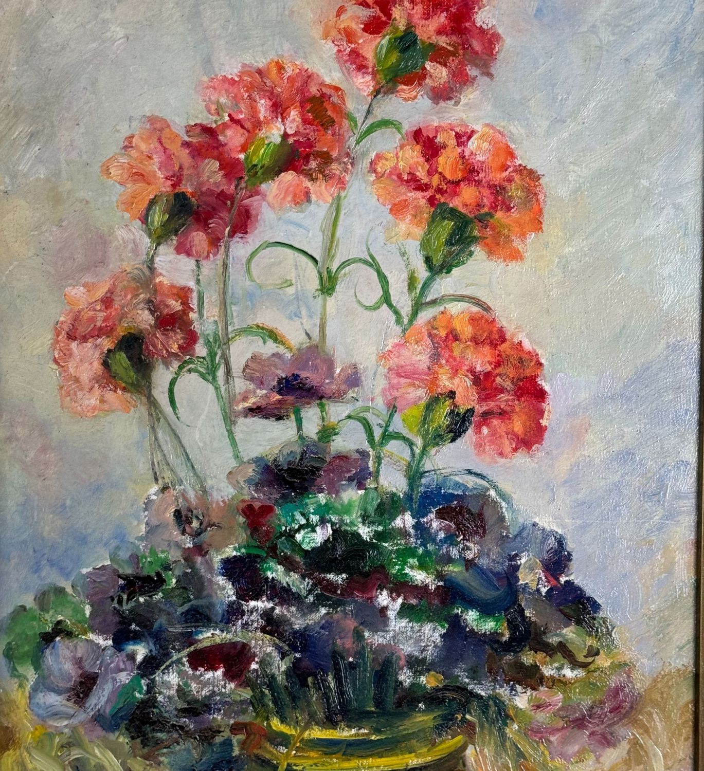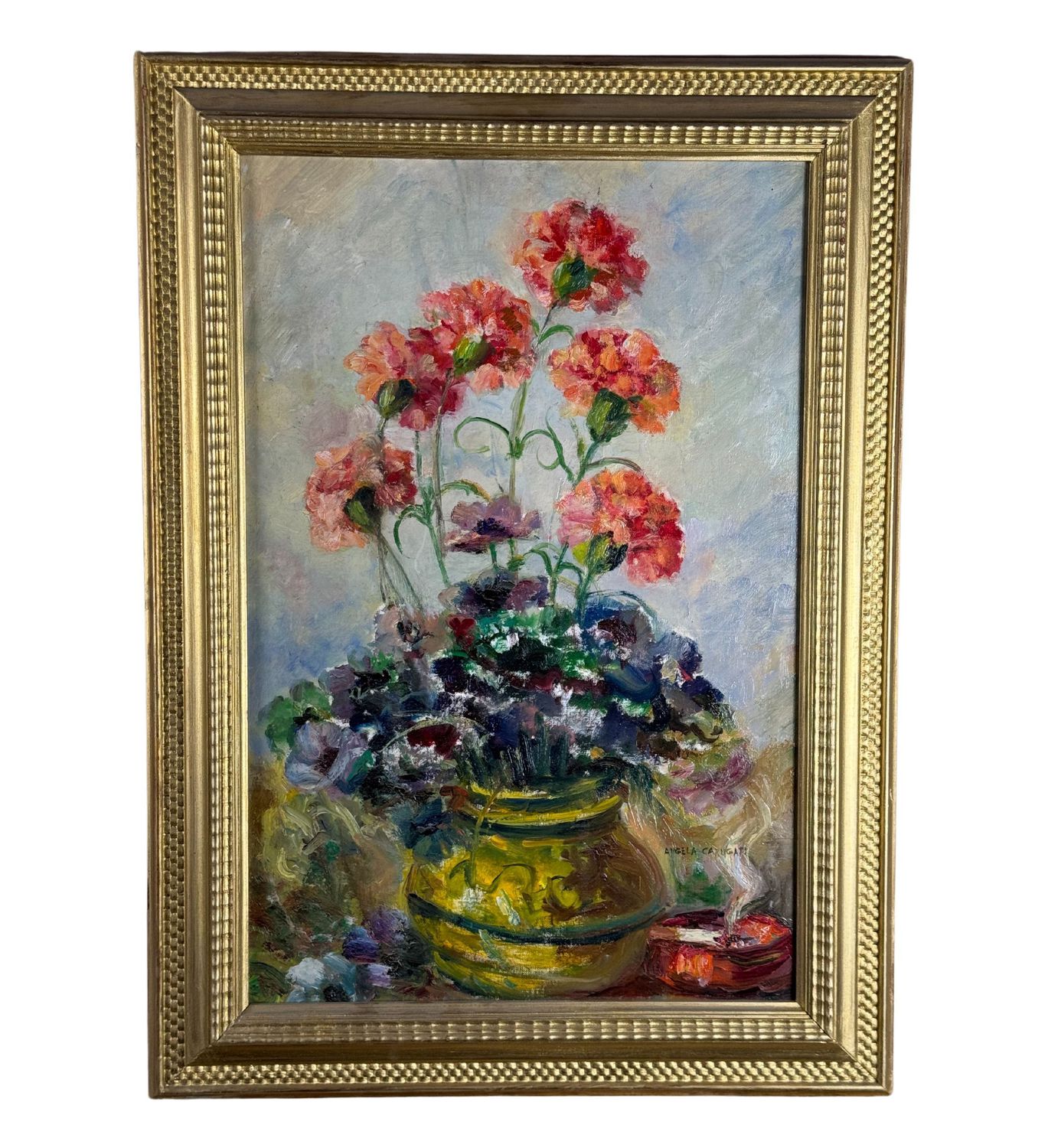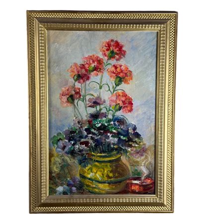 Dipinto olio su cartoncino, periodo XX secolo scuola Italiana, raffigurante Vaso con fiori. Dimensioni compreso cornice: 52x71 cm. Dimensioni interno cornice: 40x60 cm. Reca firma in basso a destra da Angela Carugati. Opera in buone condizioni.