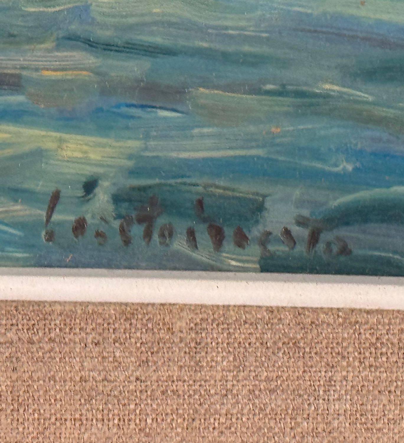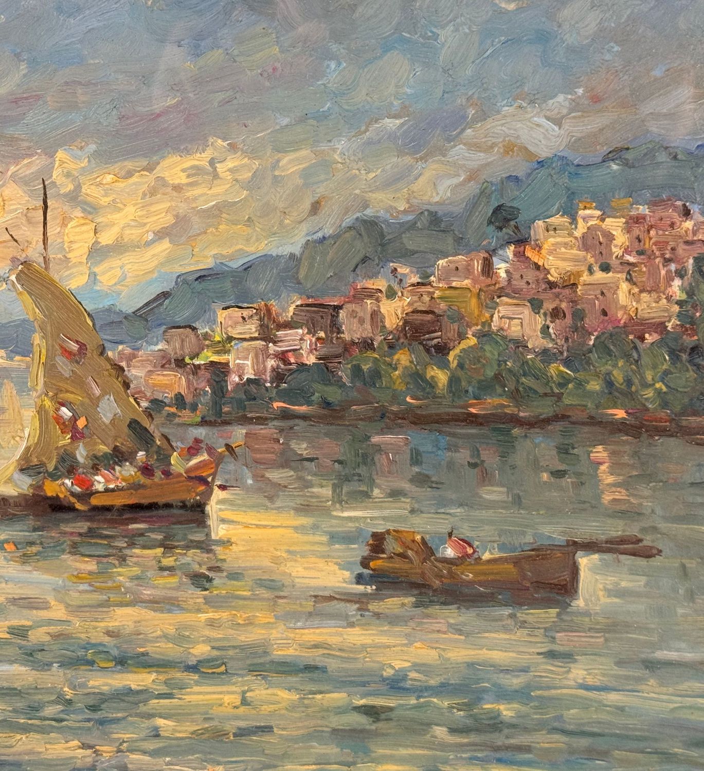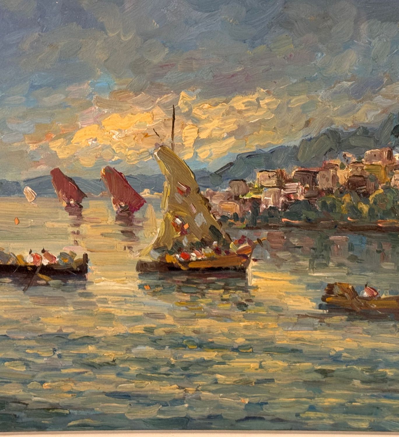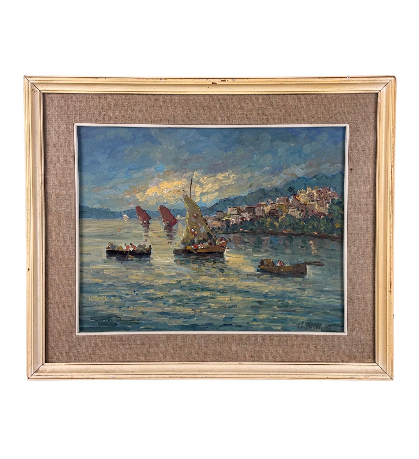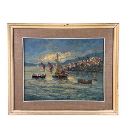 Dipinto olio su pannello, periodo XX secolo scuola Italiana, raffigurante Scorcio di marina con barche. Dimensioni compreso cornice: 48x40 cm. Dimensioni interno cornice: 30x39 cm. Reca firma in basso a destra da artista non identificato. Opera in buone condizioni.