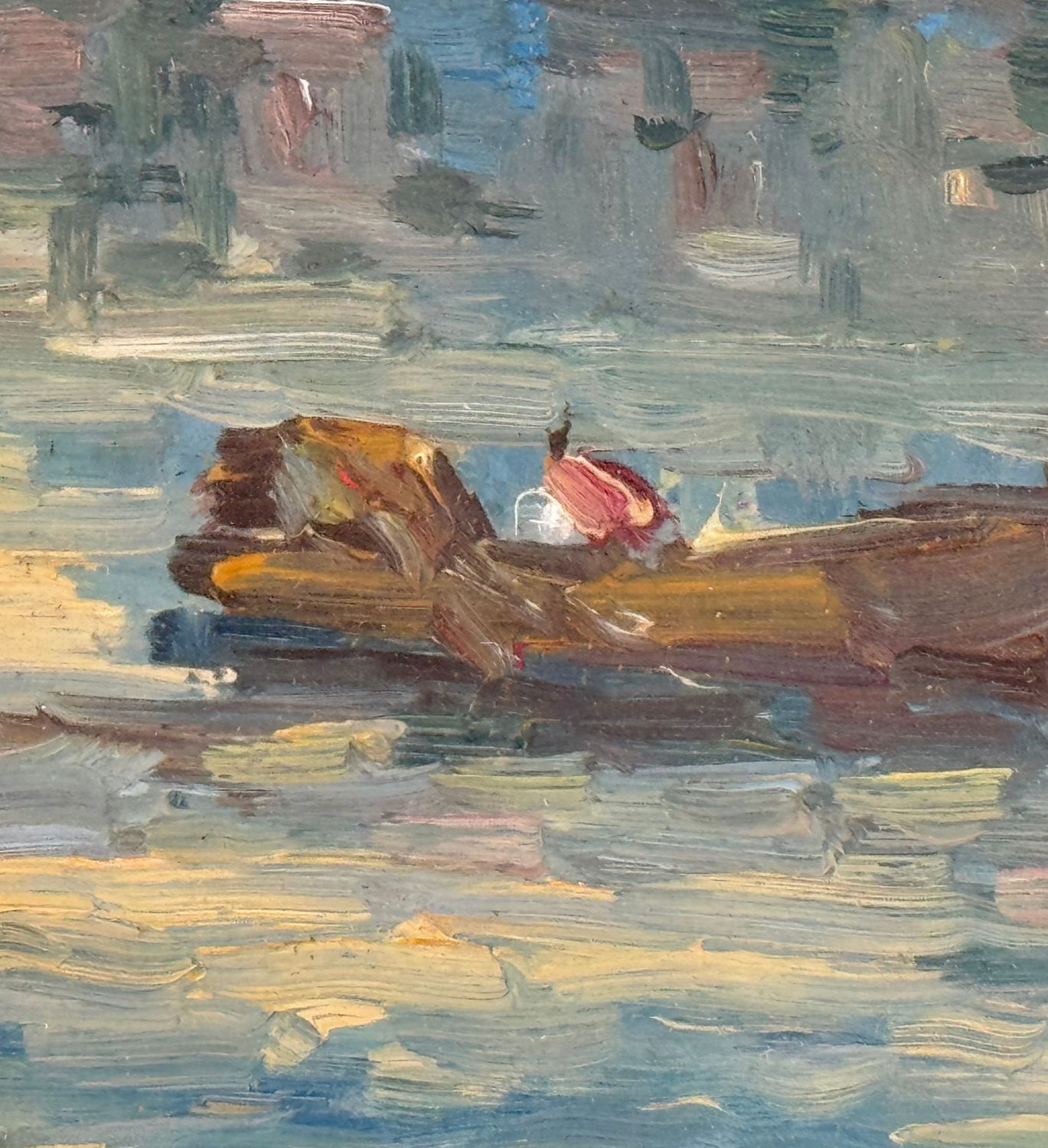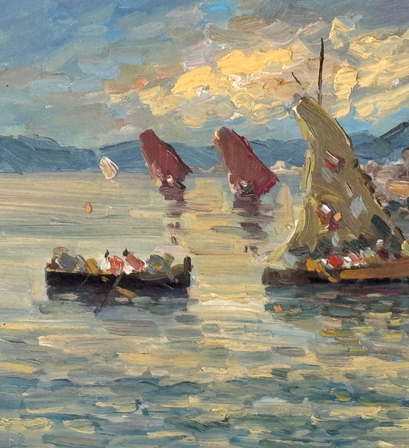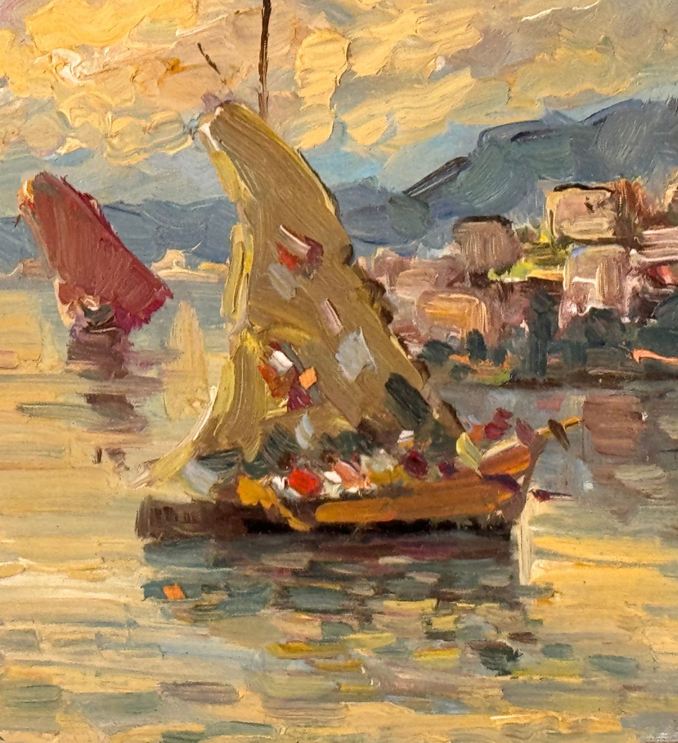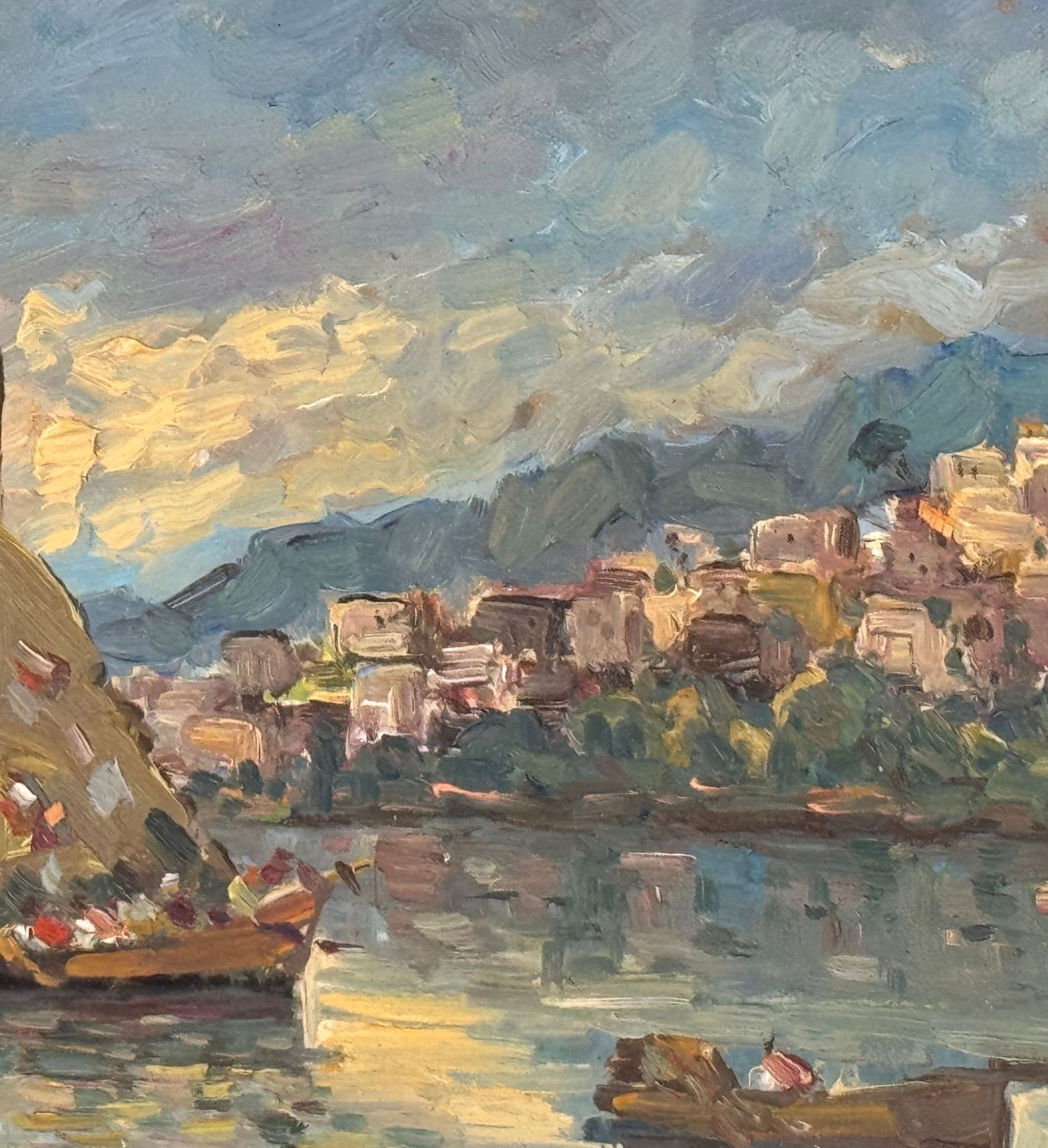 Dipinto olio su pannello, periodo XX secolo scuola Italiana, raffigurante Scorcio di marina con barche. Dimensioni compreso cornice: 48x40 cm. Dimensioni interno cornice: 30x39 cm. Reca firma in basso a destra da artista non identificato. Opera in buone condizioni.