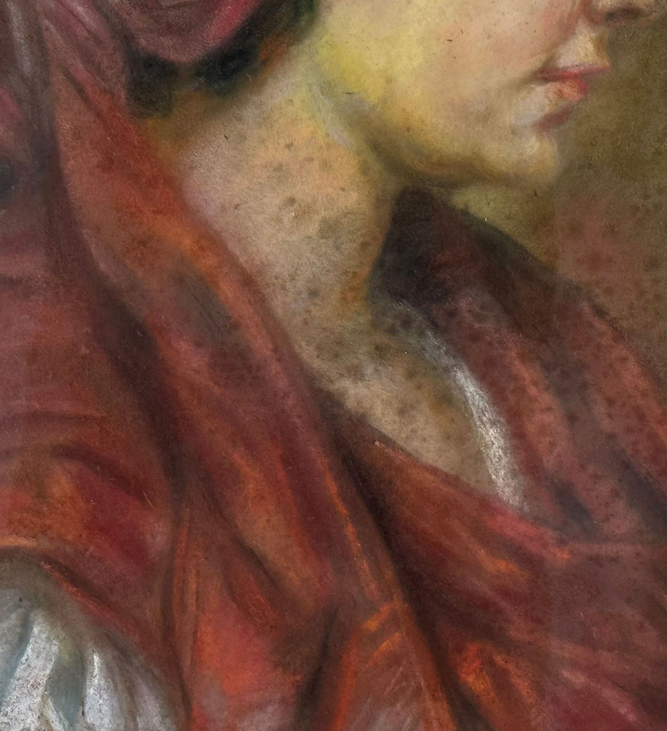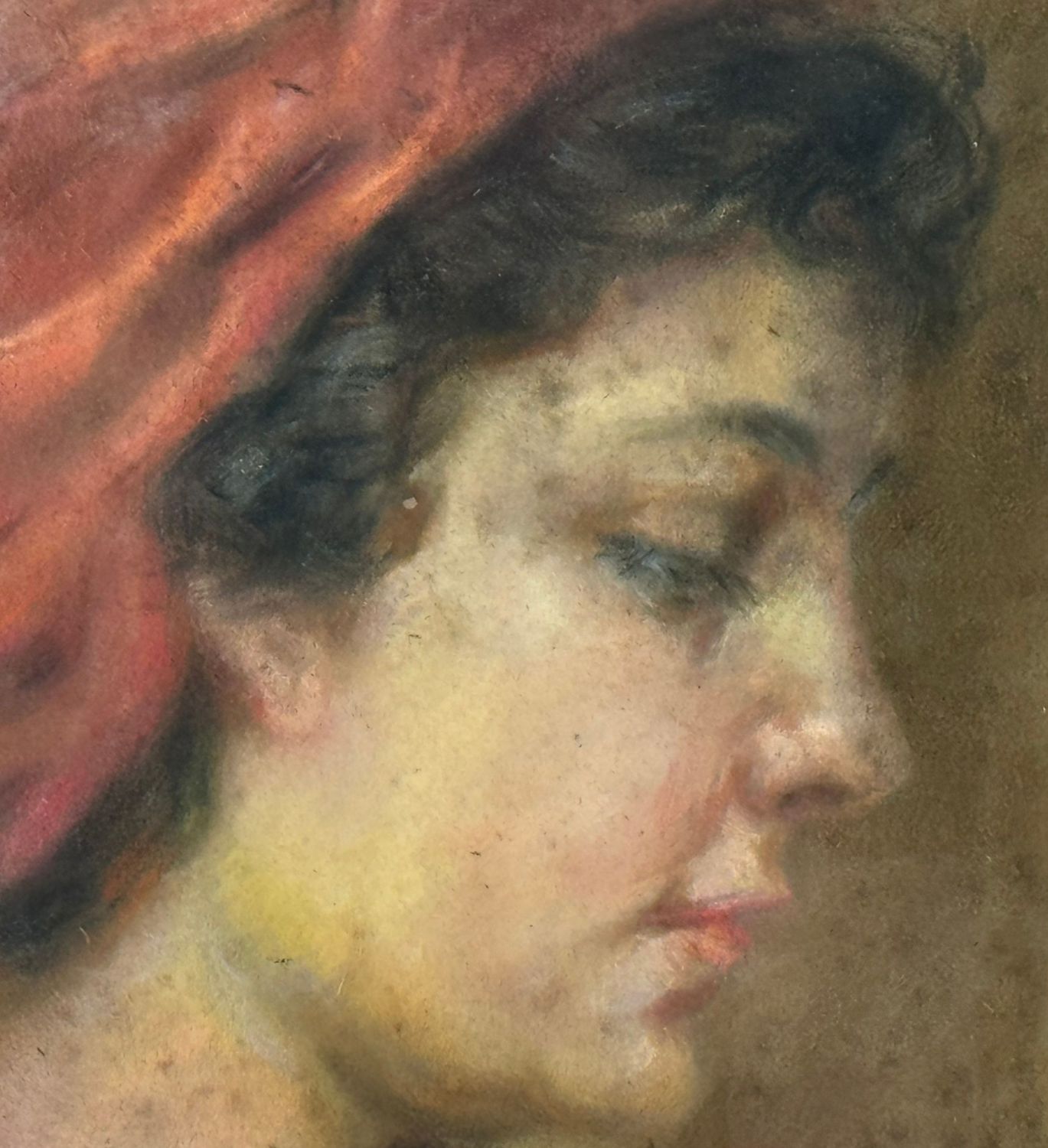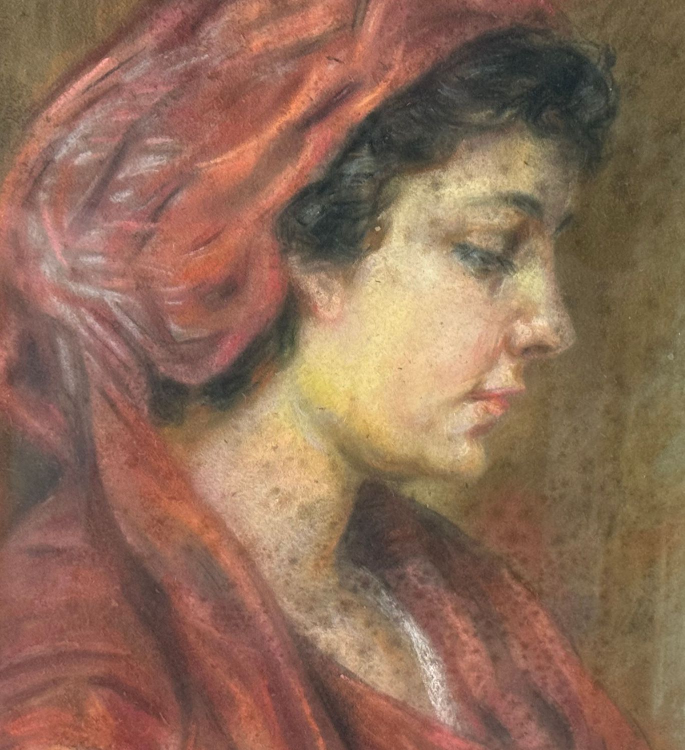 Tecnica mista su cartoncino, acrilico olio e gessetto, periodo XX secolo scuola Italiana, raffigurante Profilo di donna con copricapo. Dimensioni compreso cornice: 50x64 cm. Dimensioni interno cornice: 35x49 cm. Reca firma in alto a sinistra da artista non identificato. Opera in buone condizioni con lievi segni di vissuto come da foto allegate.