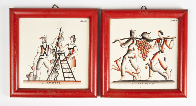 Gio Ponti (Milano 1891 - 1979) - Due piastrelle in terraglia della serie "Vendemmia", decorate in bicromia con i soggetti "il raccolto" e "il trasporto". Manifattura Richard-Ginori S. Cristoforo Milano, 1930 ca. Firmate in alto a destra, marcate al verso in nero con monogramma e numerali "77/600T" e "601T P". In cornice. (cm 14,5x14,5). Bibliografia: Catalogo Ceramiche Moderne d'Arte Richard-Ginori, Milano, 1930, p. 136