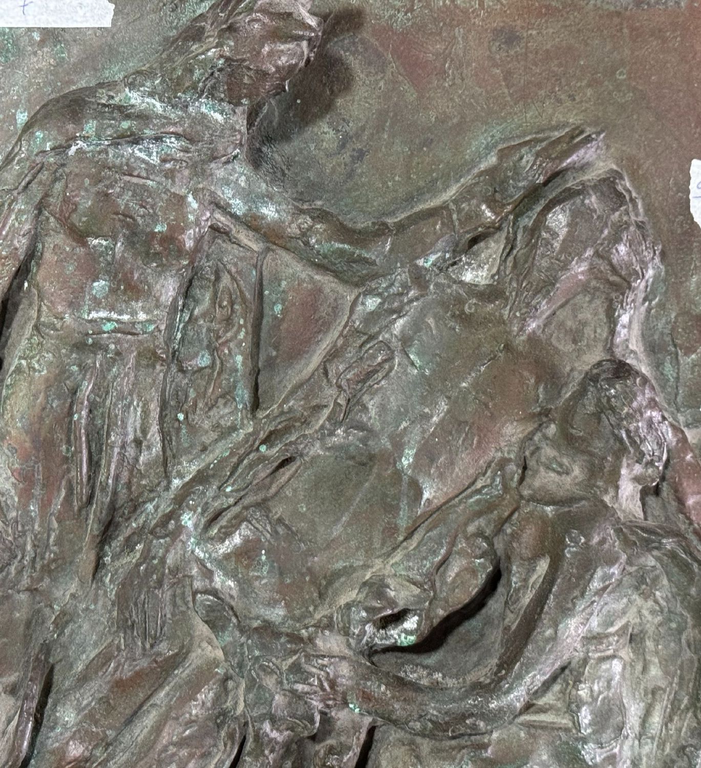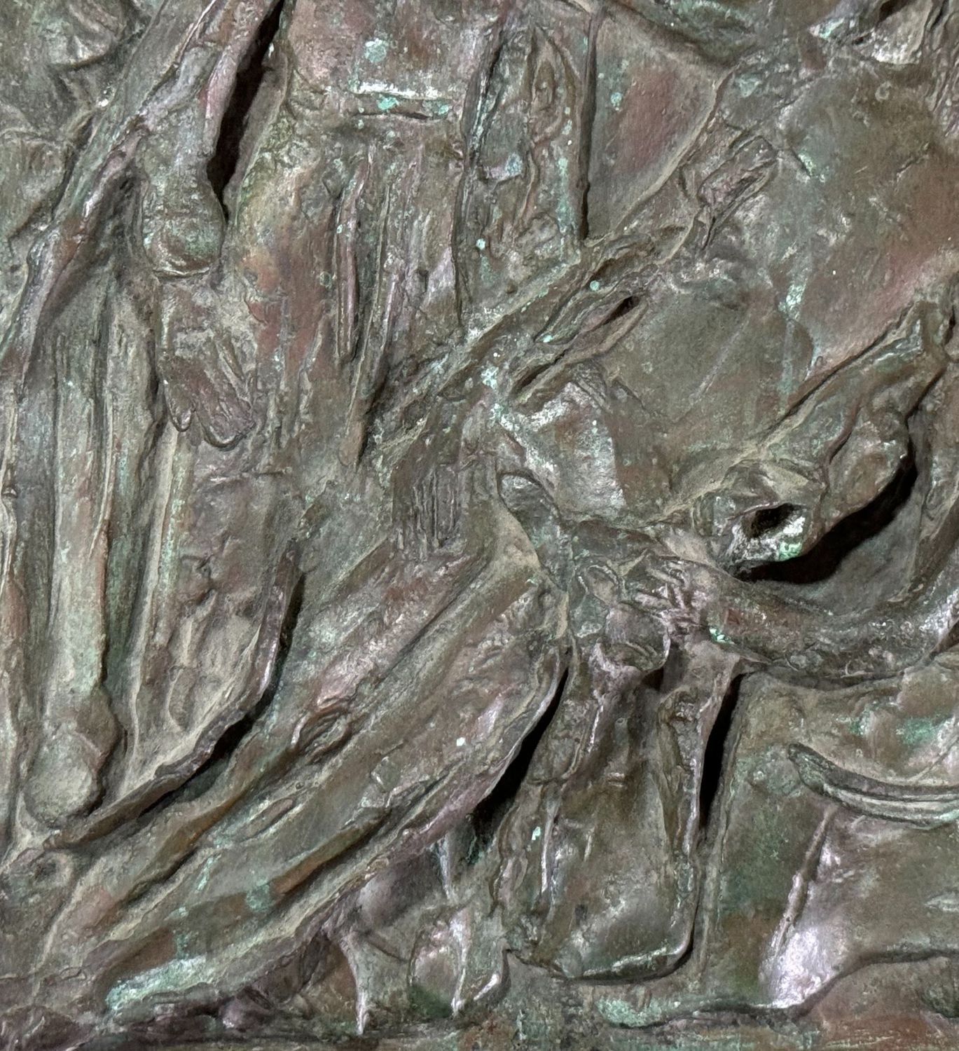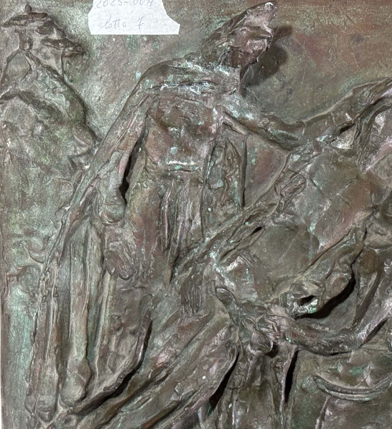 Scultura in arte contemporanea, raffigurante La Morte di Cristo. Dimensioni: h30,5x29,5x8 cm. Scultura in buone condizioni. Reca firma di difficile lettura in alto a destra.