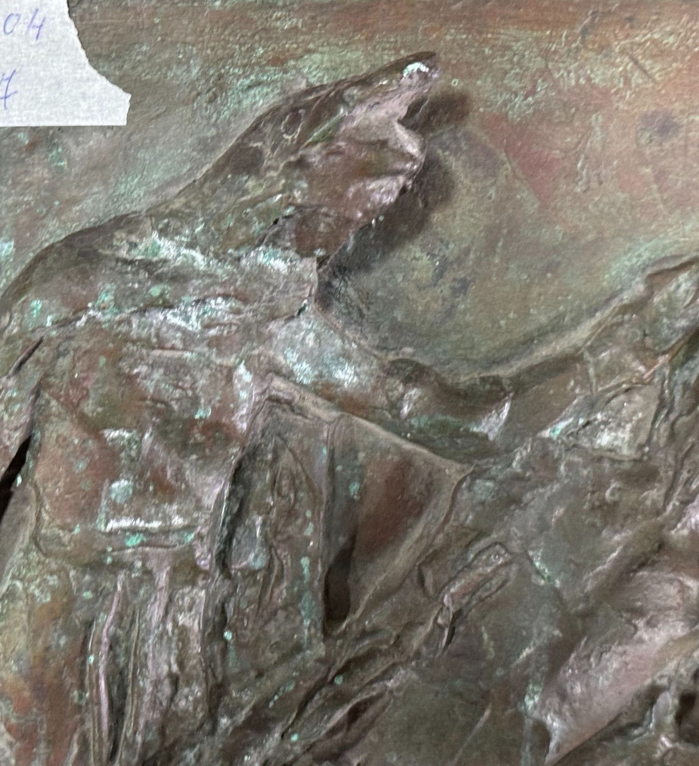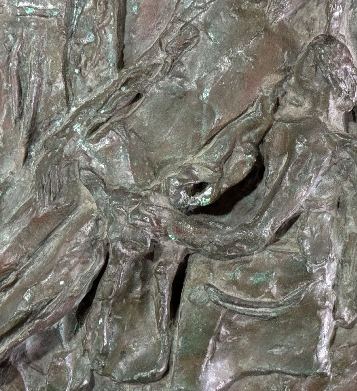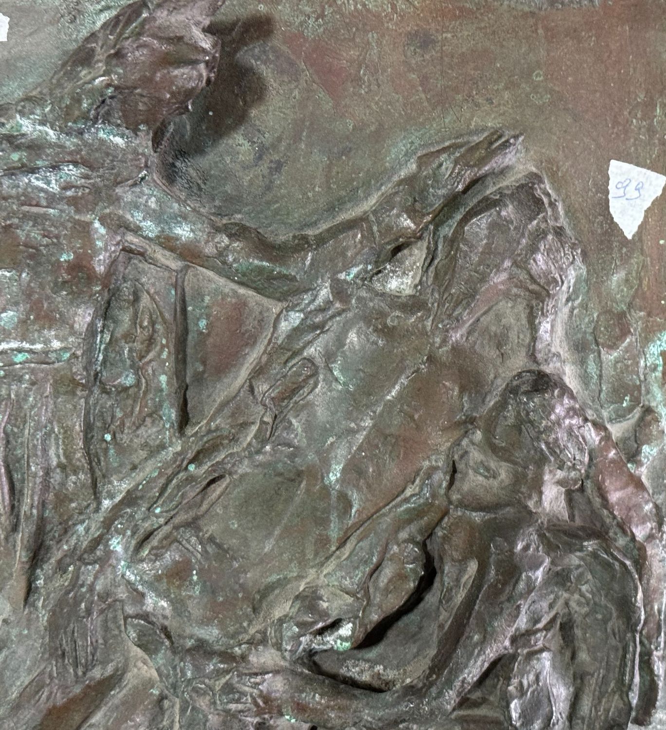 Scultura in arte contemporanea, raffigurante La Morte di Cristo. Dimensioni: h30,5x29,5x8 cm. Scultura in buone condizioni. Reca firma di difficile lettura in alto a destra.