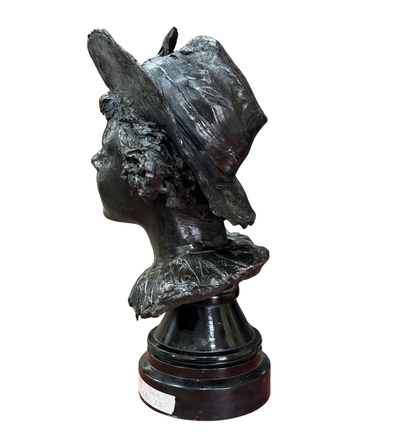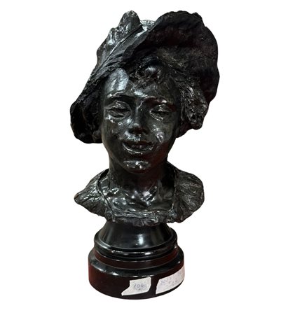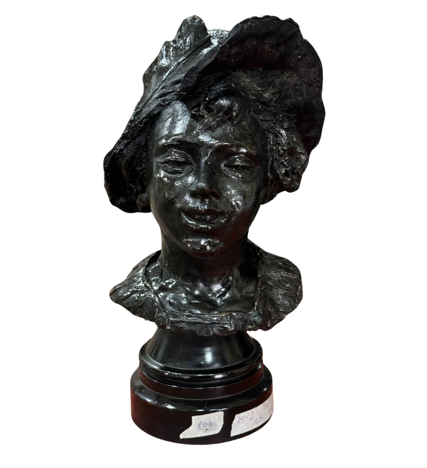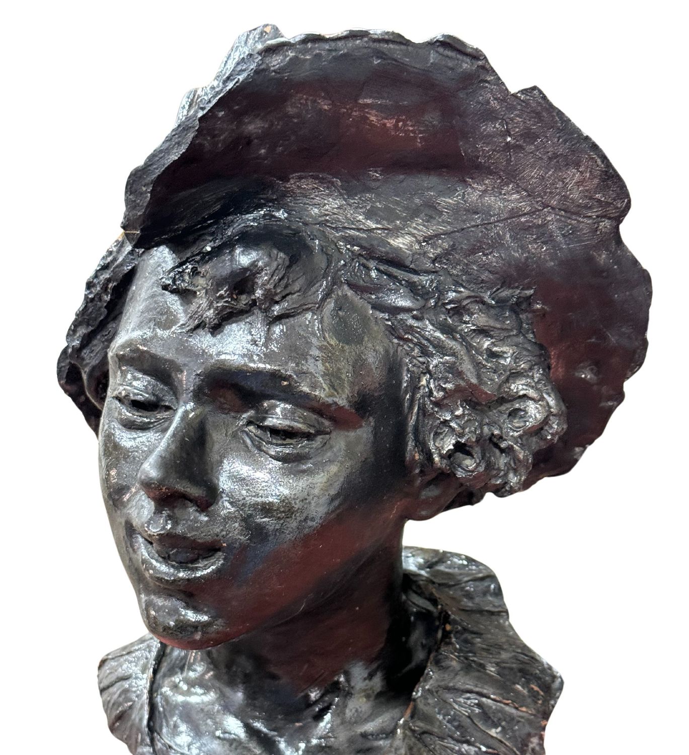 Scultura in terracotta su base in legno, periodo XIX/XX secolo raffigurante Busto di donna con cappello. Dimensioni: h49x20x24 cm. Scultura in buone condizioni con lievi segni di vissuto come da foto allegate. Reca firma da artista non identificato.