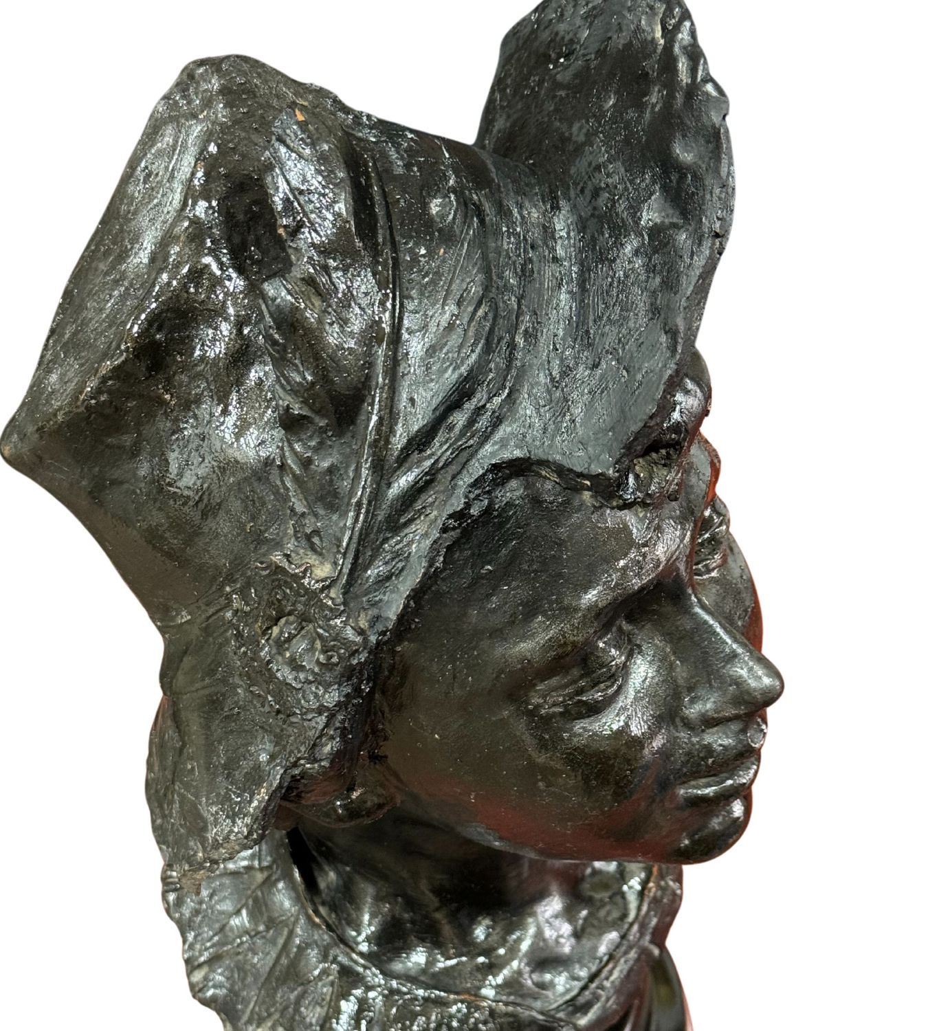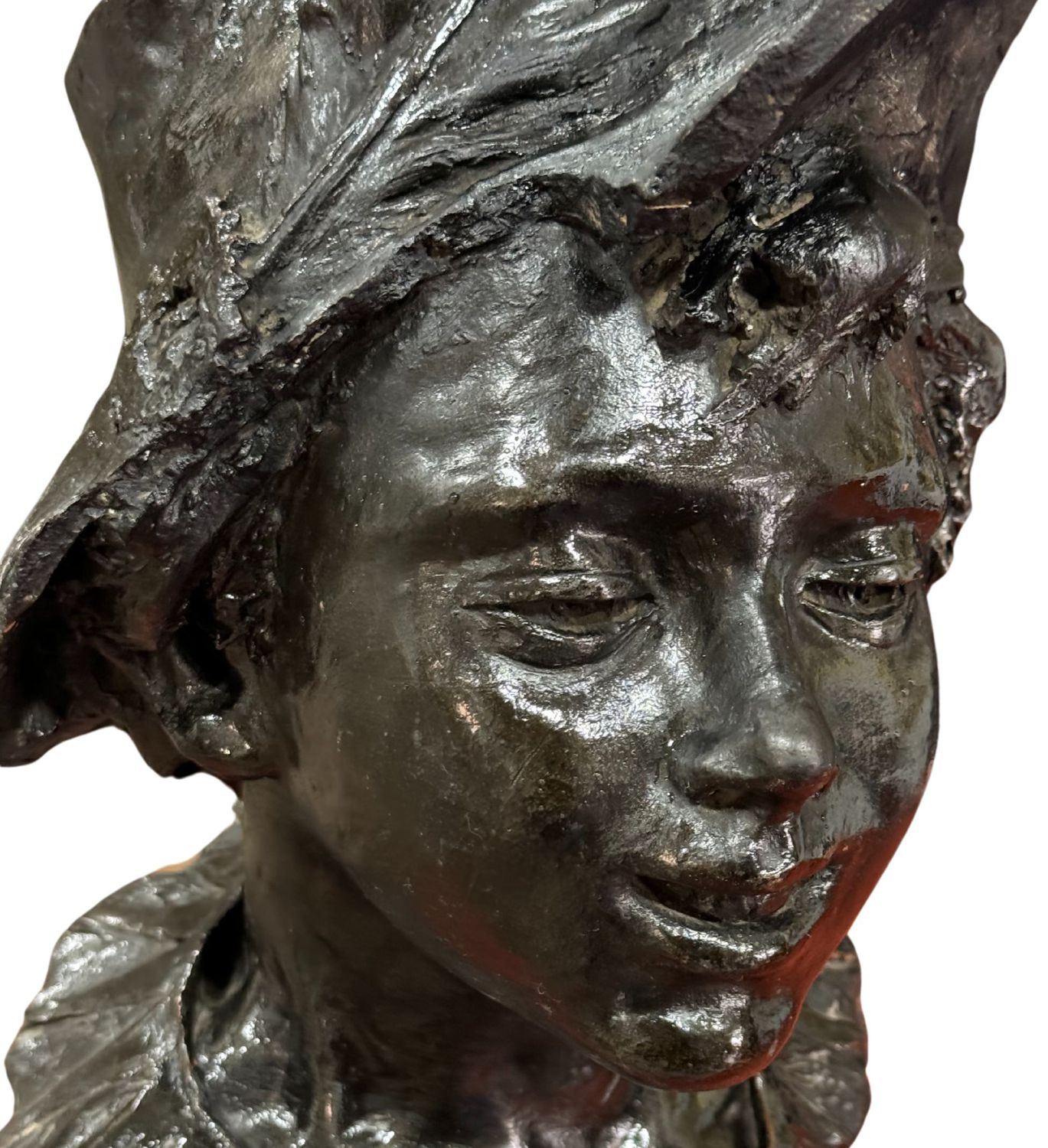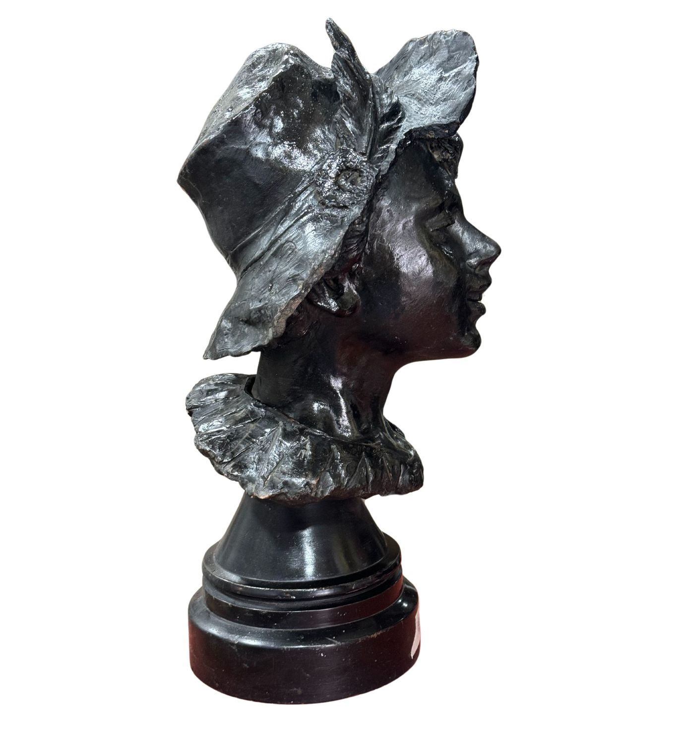 Scultura in terracotta su base in legno, periodo XIX/XX secolo raffigurante Busto di donna con cappello. Dimensioni: h49x20x24 cm. Scultura in buone condizioni con lievi segni di vissuto come da foto allegate. Reca firma da artista non identificato.