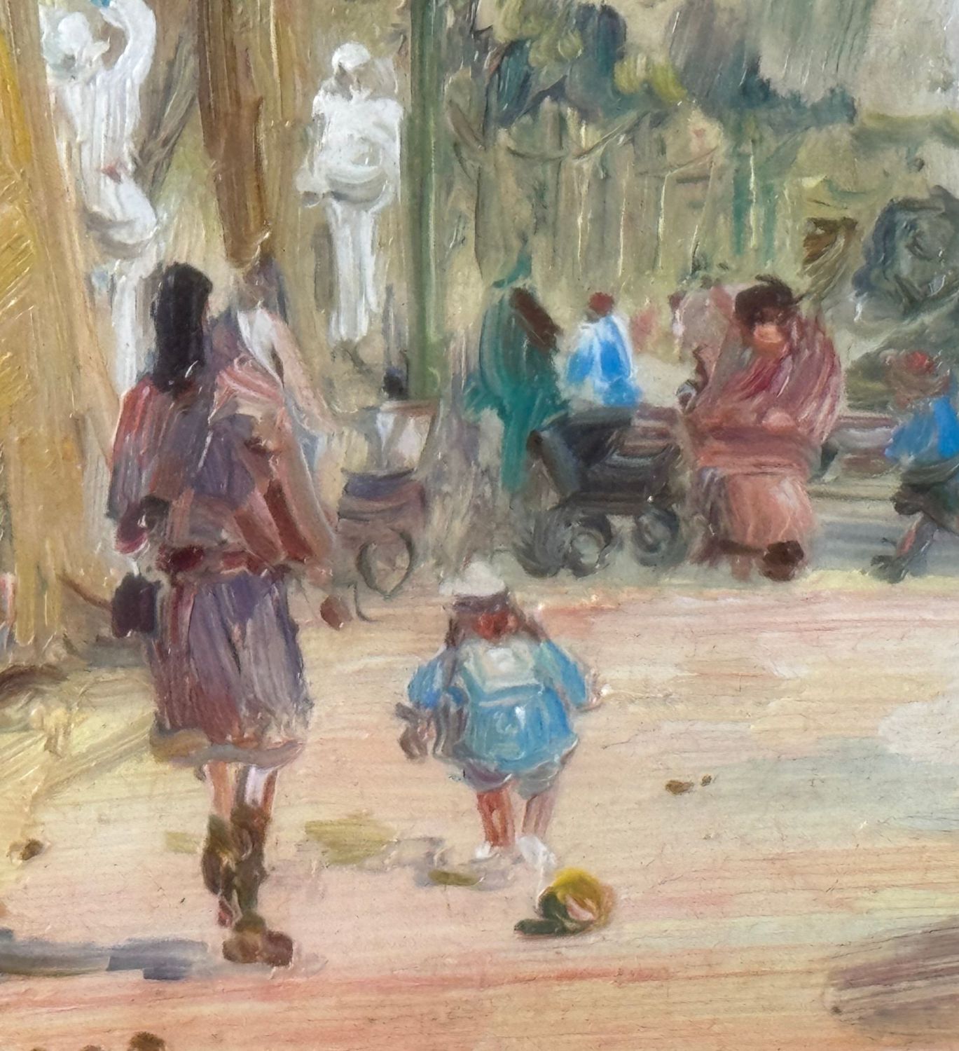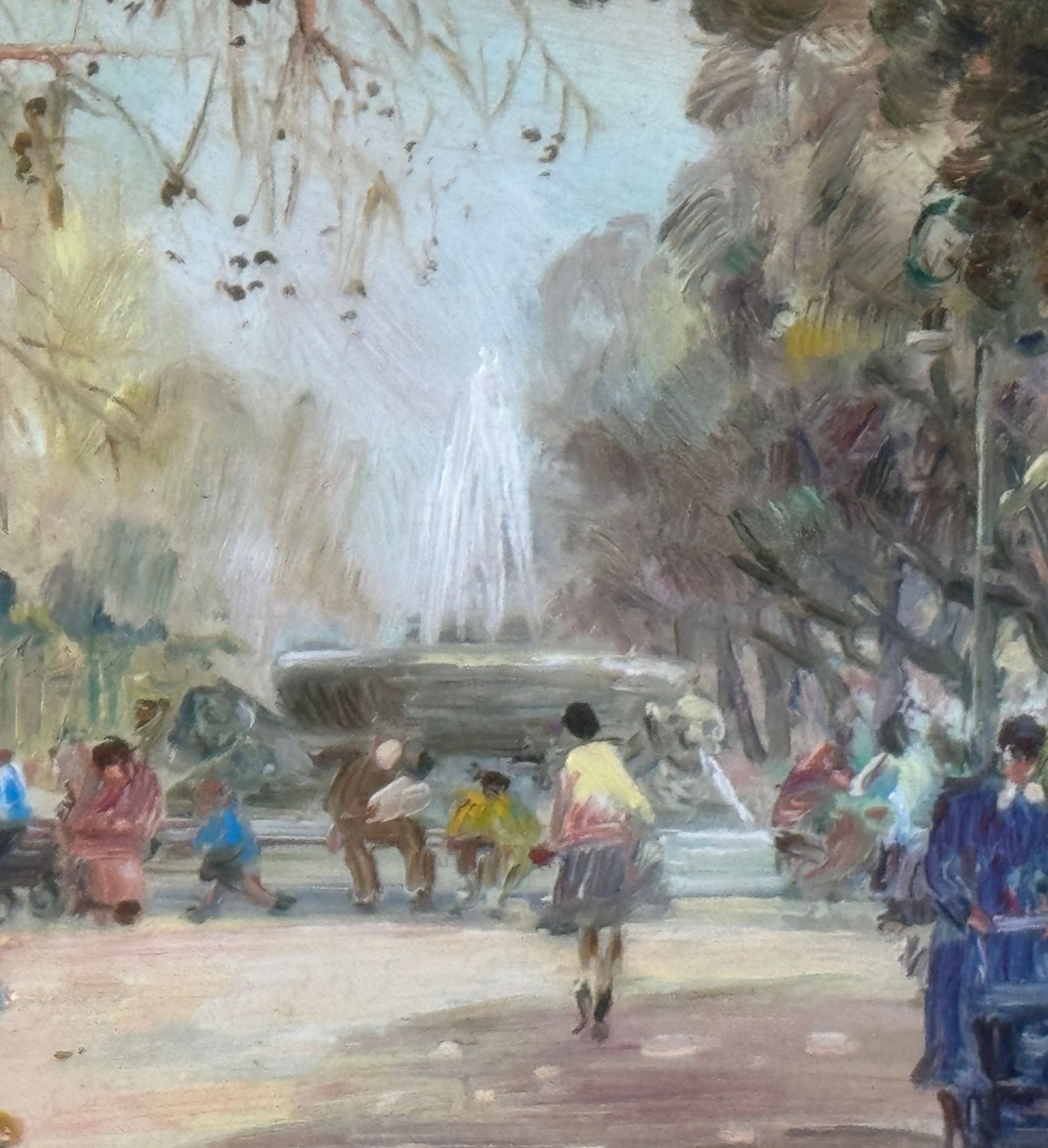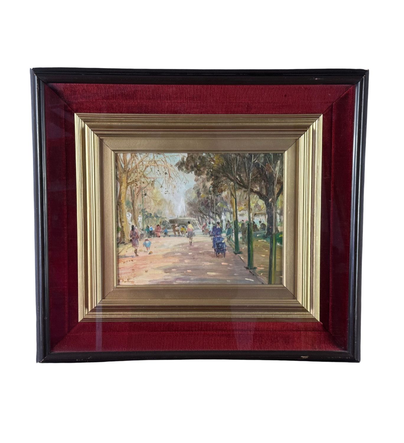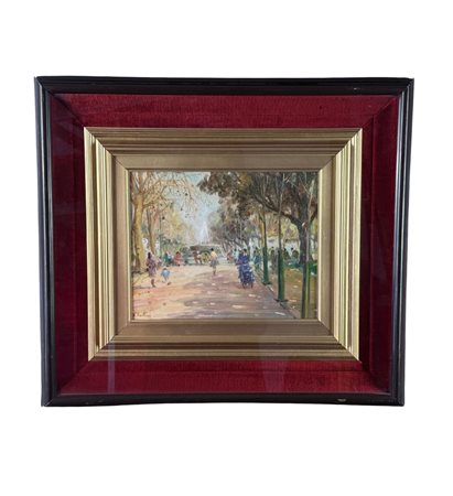 Dipinto olio su tavola, periodo XX secolo, scuola Italiana, raffigurante Personaggi alla Villa Comunale a Napoli. Dimensioni compreso cornice: 55x49 cm. Dimensioni interno cornice: 25x30 cm. Reca firma in basso a sinistra Antonio Martucci. Opera in buone condizioni.