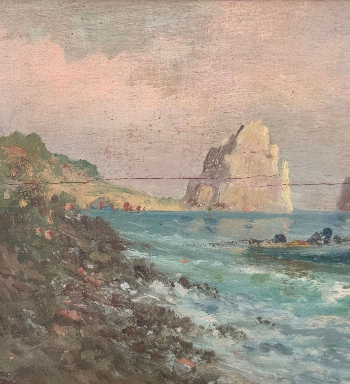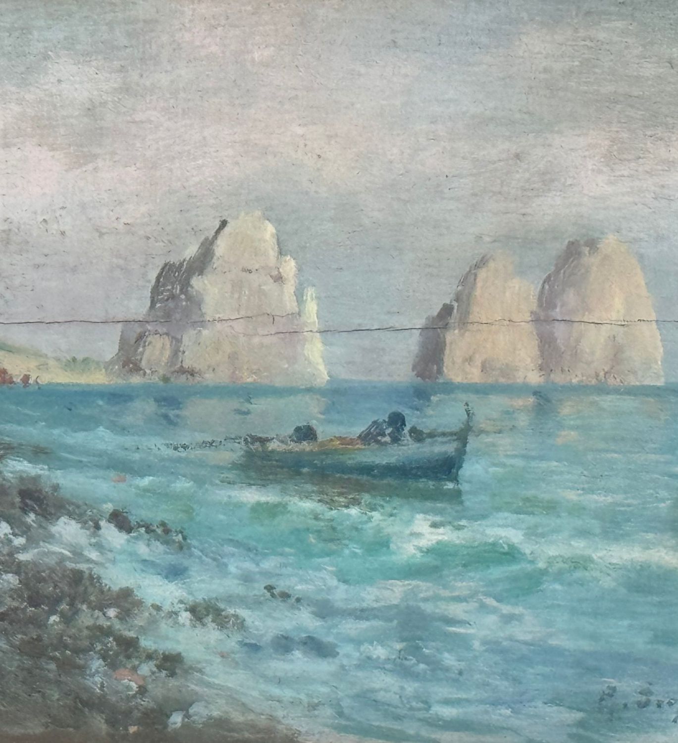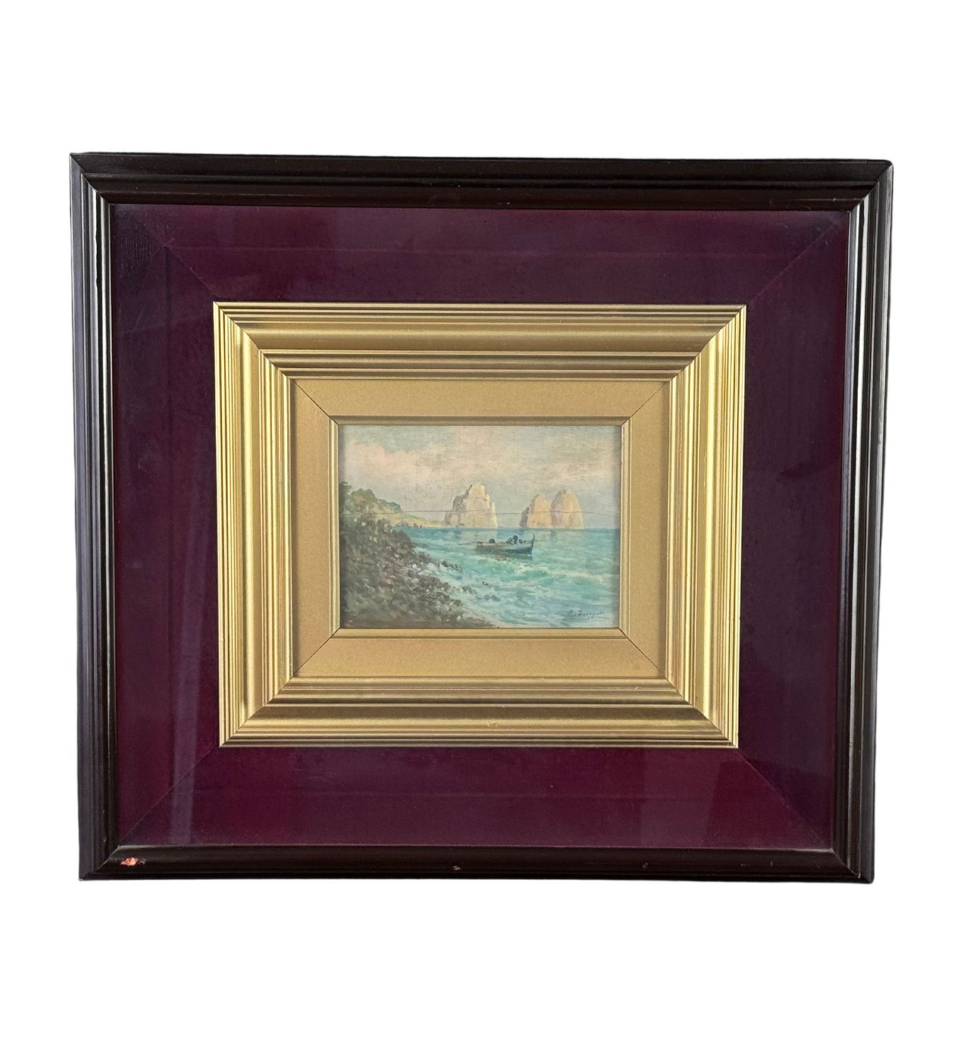 Dipinto olio su cartoncino, periodo XX secolo, scuola Italiana, raffigurante Scorcio di marina a Capri. Dimensioni compreso cornice: 44x40 cm. Dimensioni interno cornice: 11,5x16 cm. Reca firma in basso a destra Scoppa. Opera in buone condizioni con lievi segni di vissuto come da foto allegate.