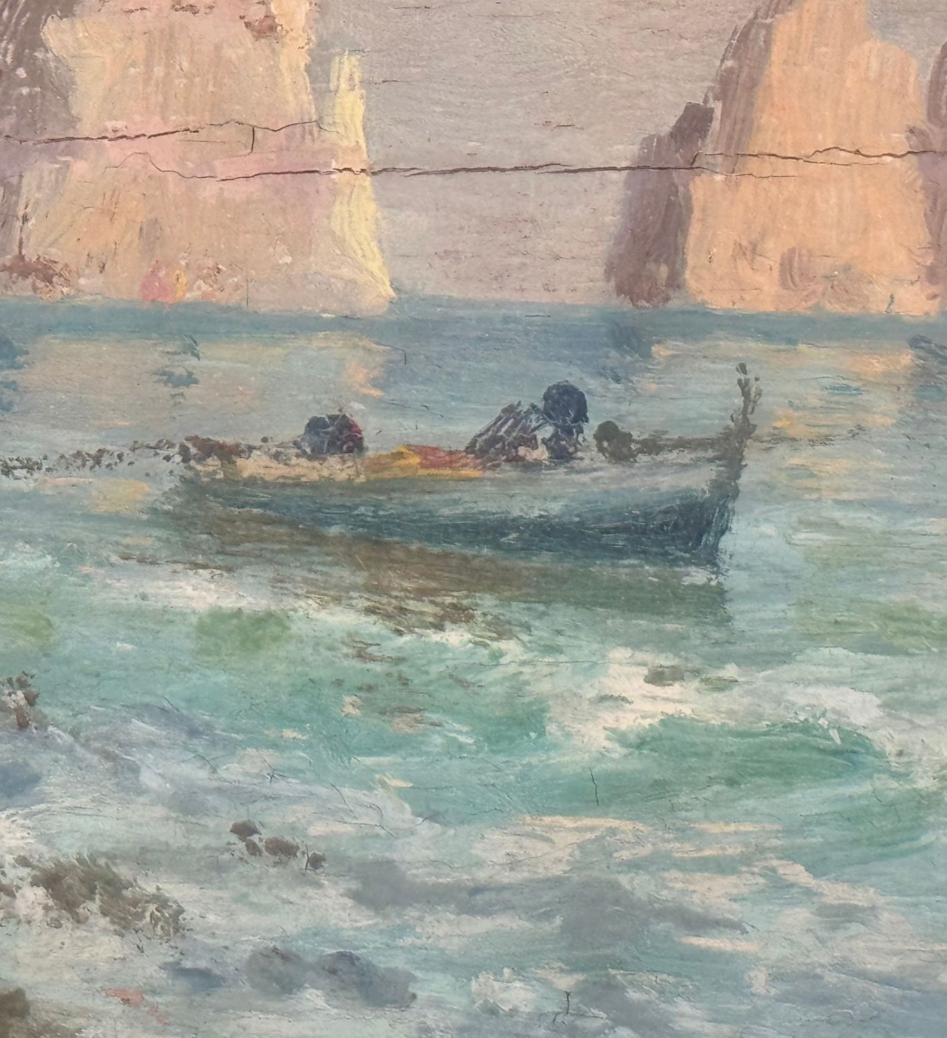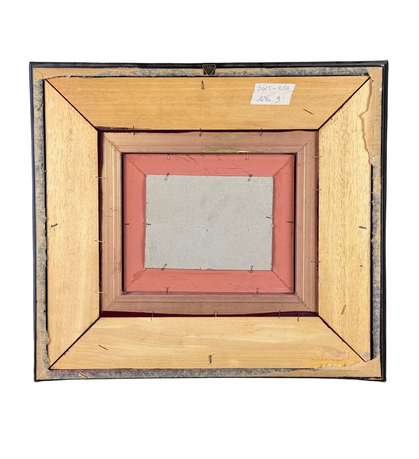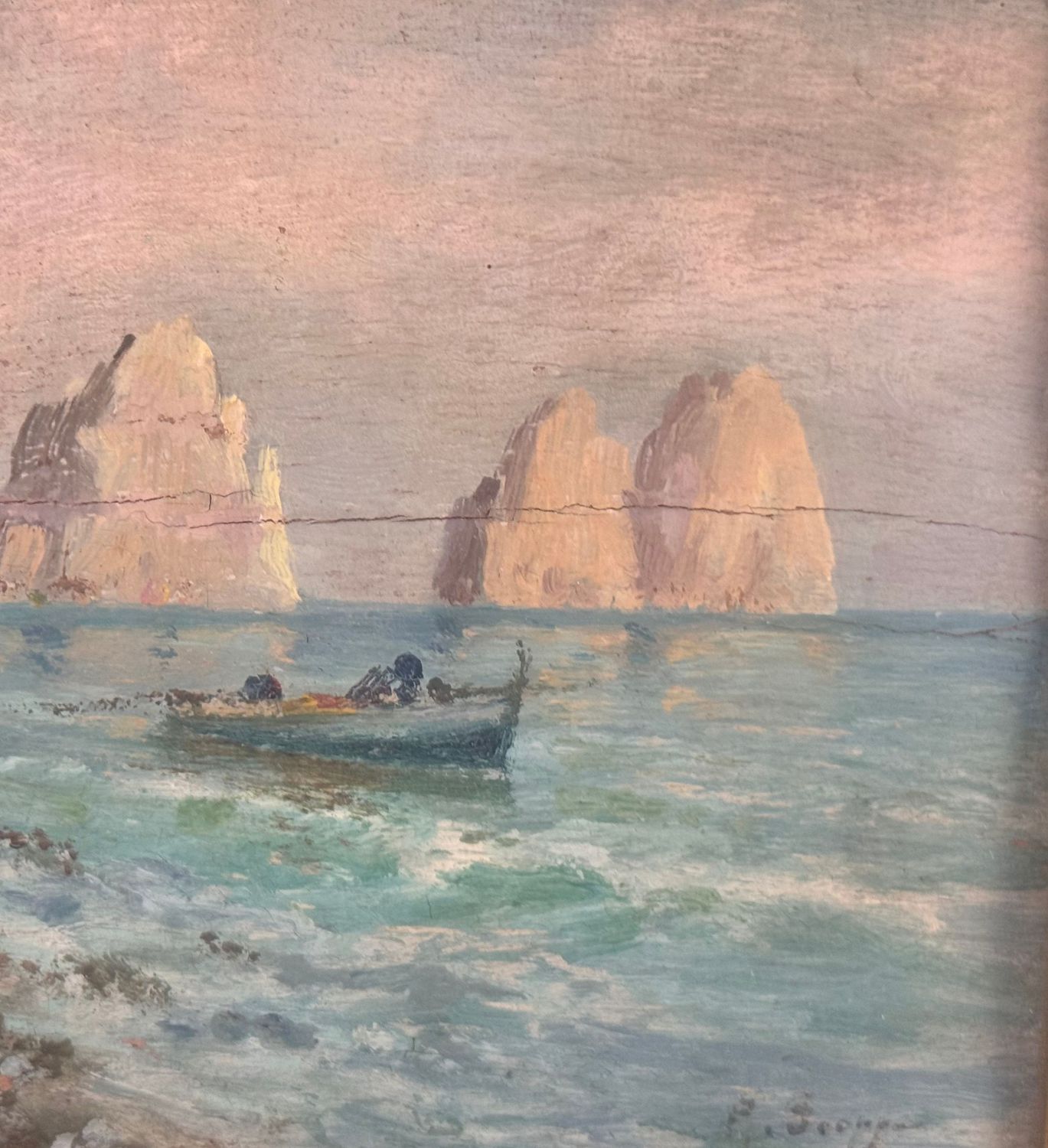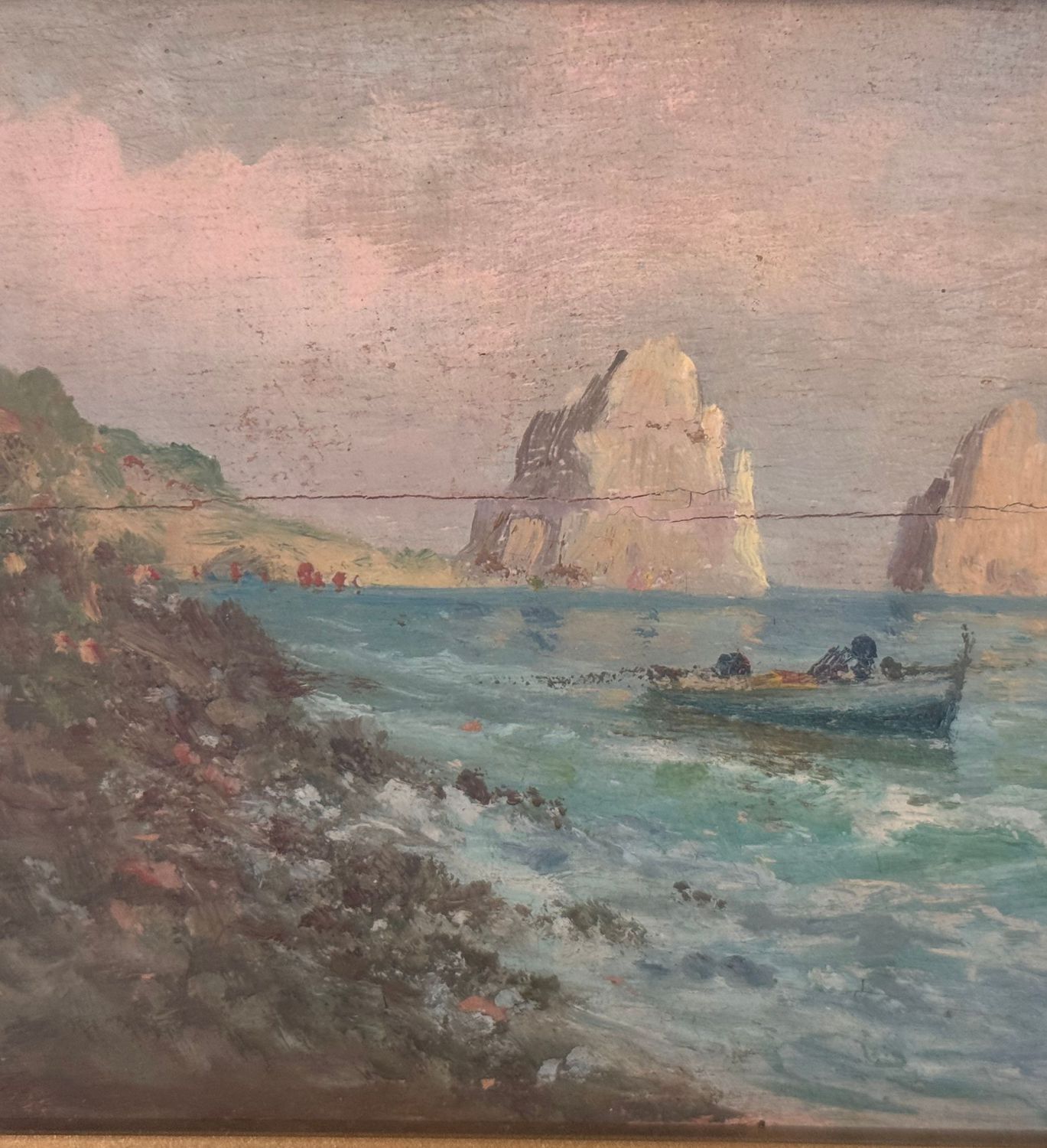 Dipinto olio su cartoncino, periodo XX secolo, scuola Italiana, raffigurante Scorcio di marina a Capri. Dimensioni compreso cornice: 44x40 cm. Dimensioni interno cornice: 11,5x16 cm. Reca firma in basso a destra Scoppa. Opera in buone condizioni con lievi segni di vissuto come da foto allegate.