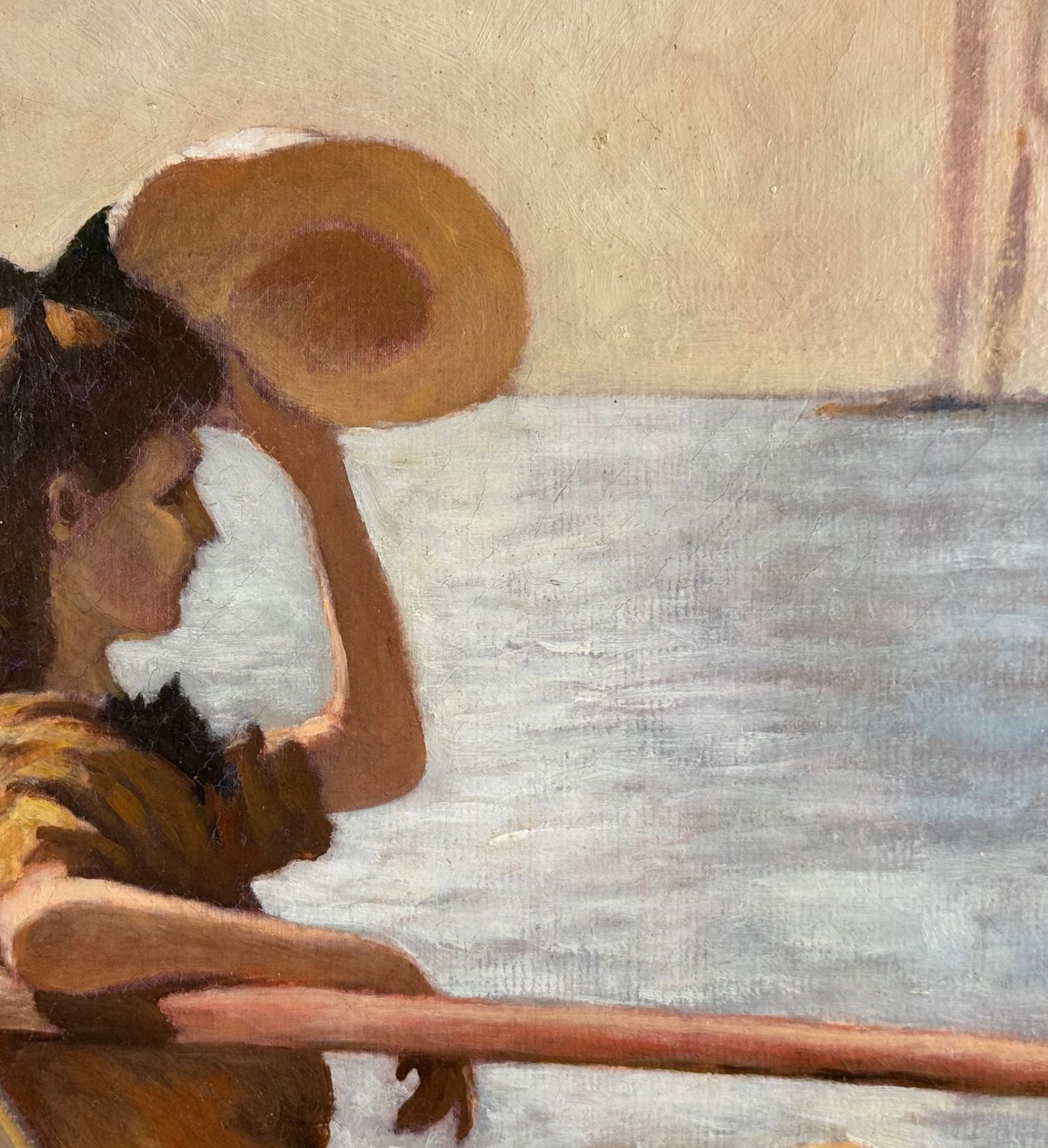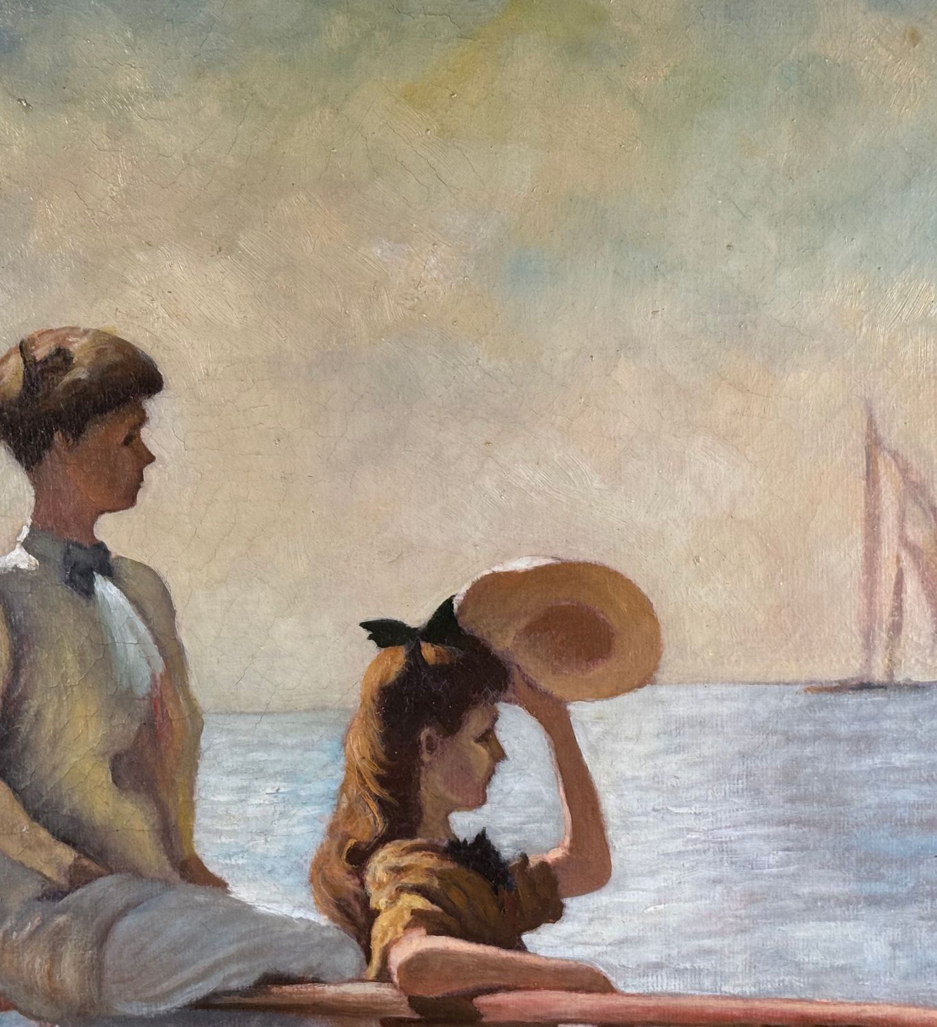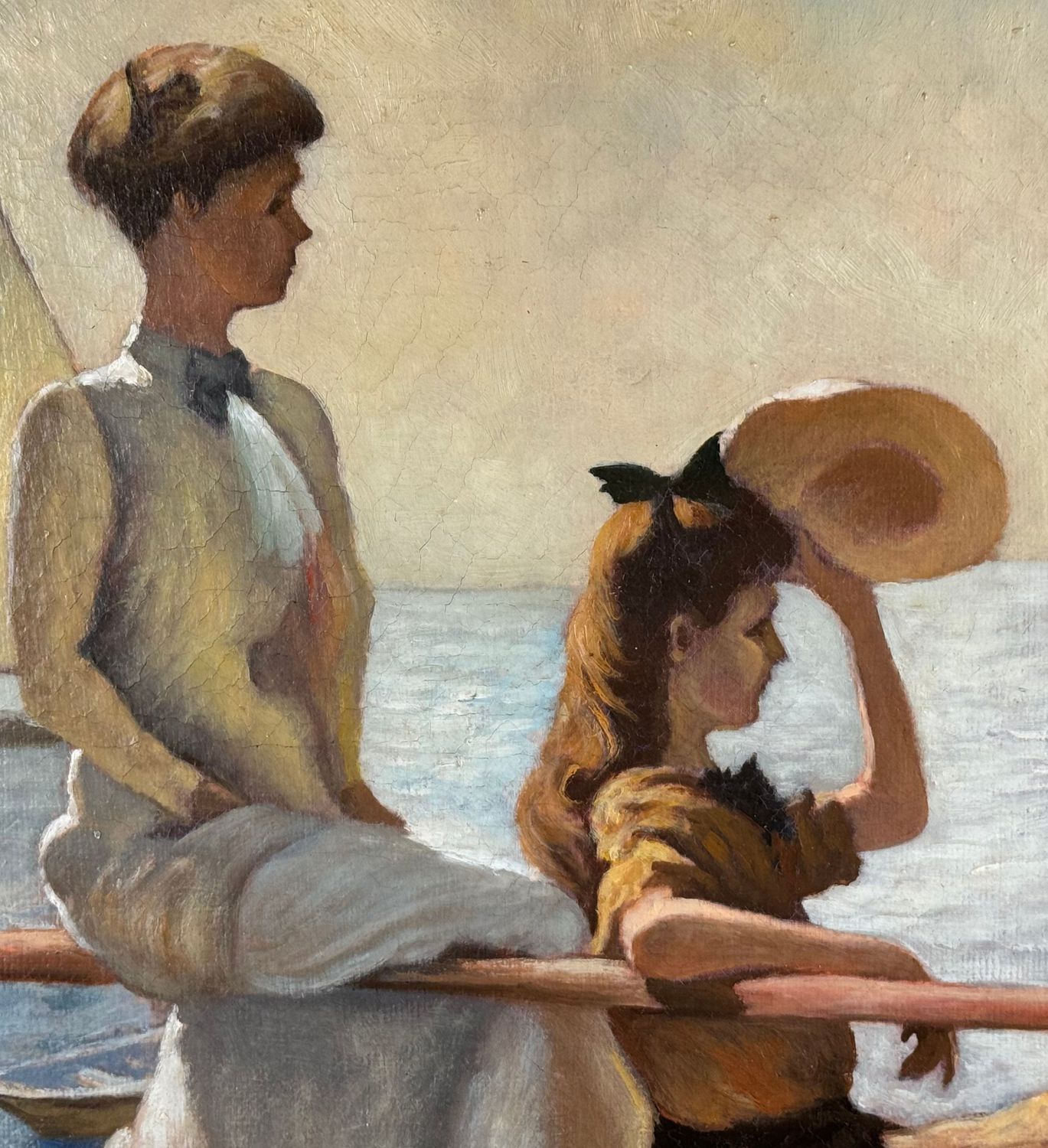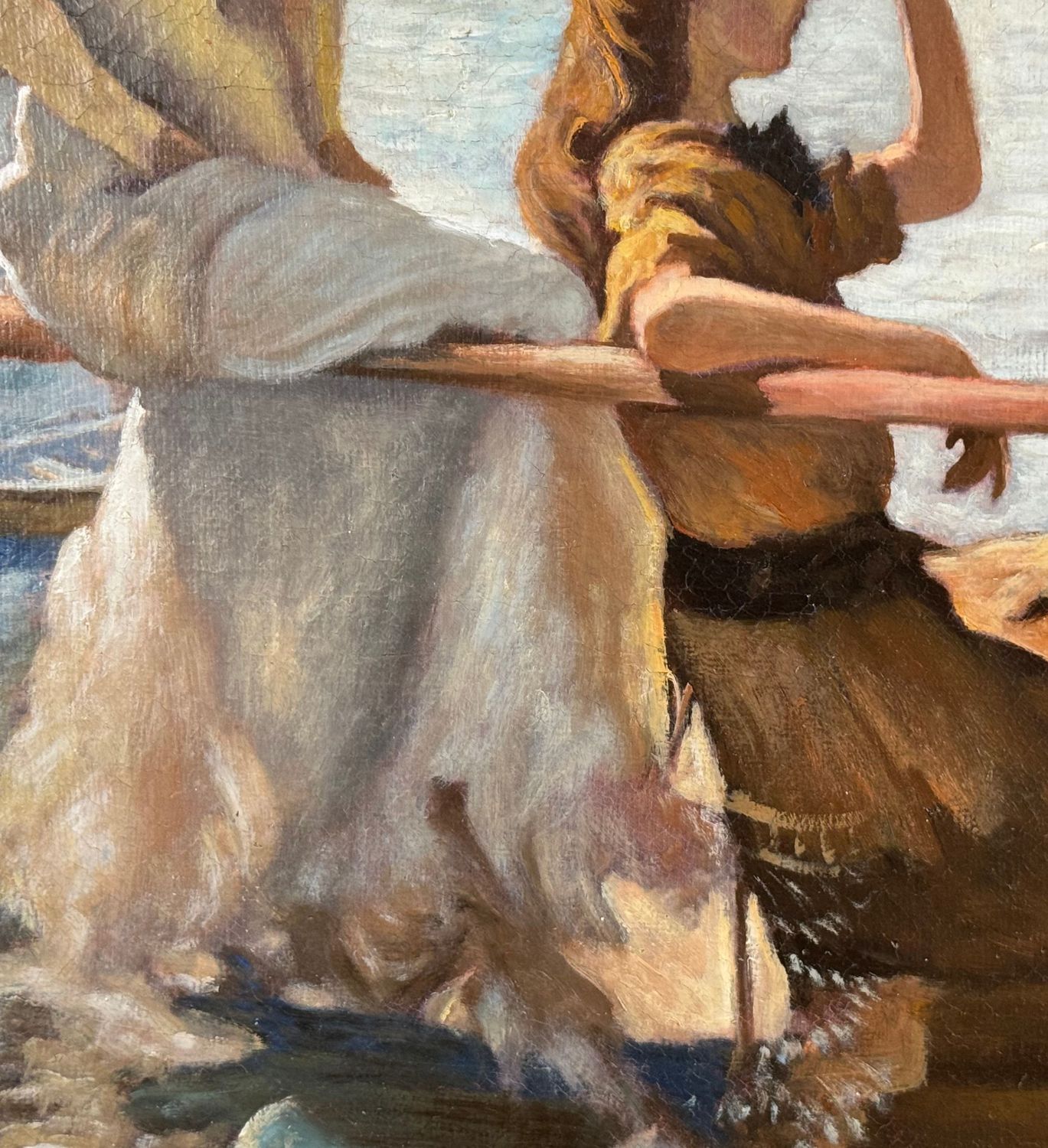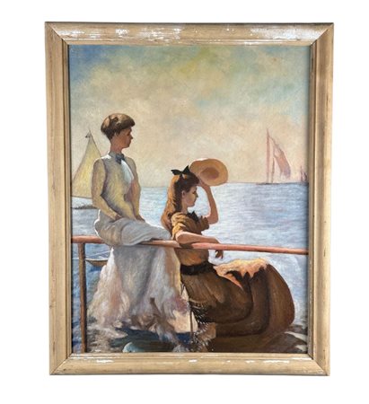 Dipinto olio su tela, periodo XX secolo 1952 scuola Italiana, raffigurante Due donne su marina. Tratta da un opera di Frank Benson. Dimensioni compreso cornice: 59,5x73,5 cm. Dimensioni interno cornice: 51,5x65,5 cm. Da artista anonimo. Opera in buone condizioni.