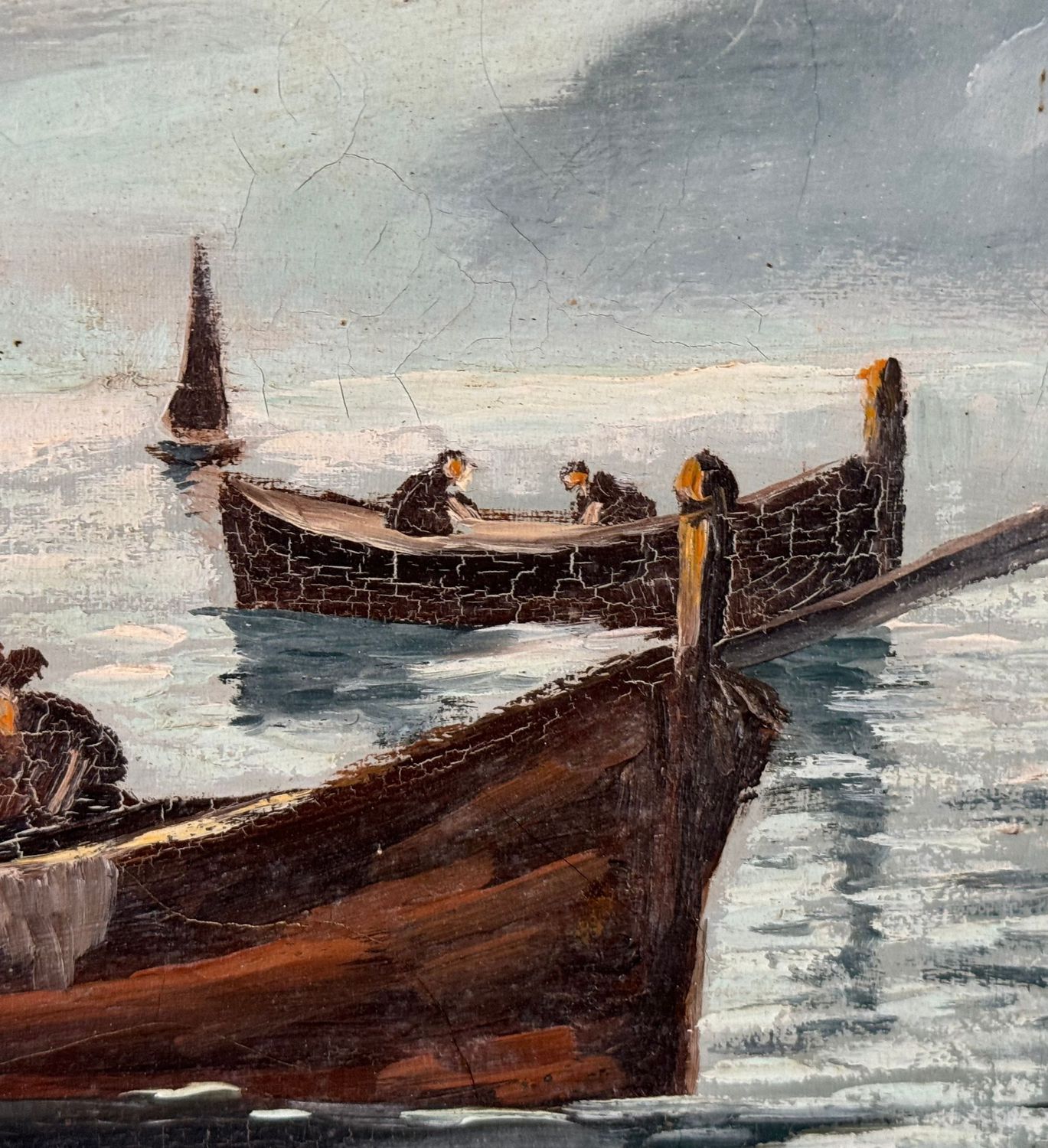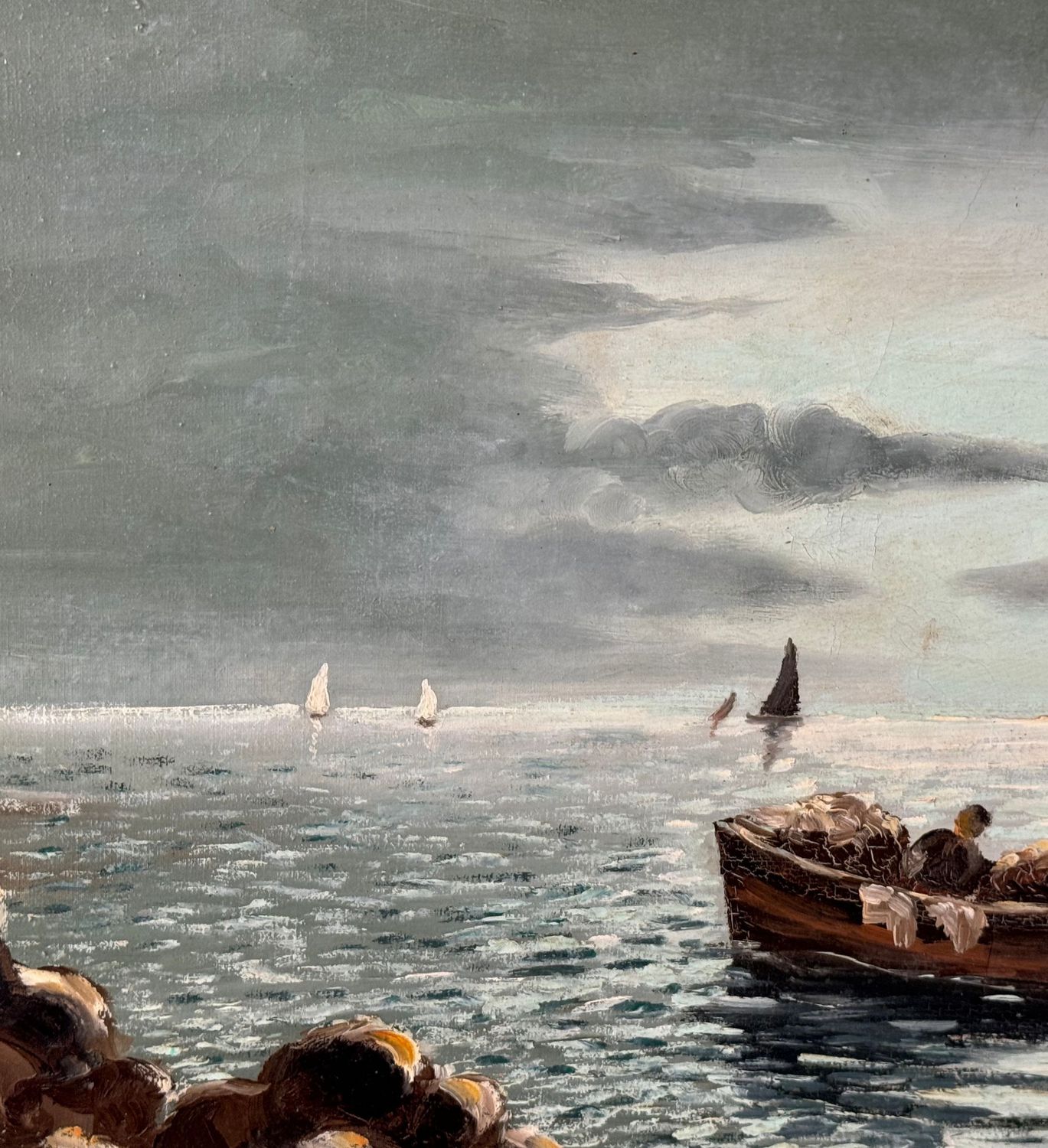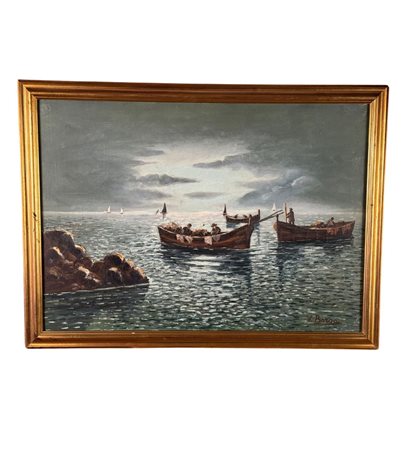 Dipinto olio su tela, periodo XX secolo scuola Napoletana, raffigurante Pescatori in barca. Dimensioni compreso cornice: 77x57 cm. Dimensioni interno cornice: 70x50 cm. Reca firma in basso a destra da artista non identificato. Opera in buone condizioni.