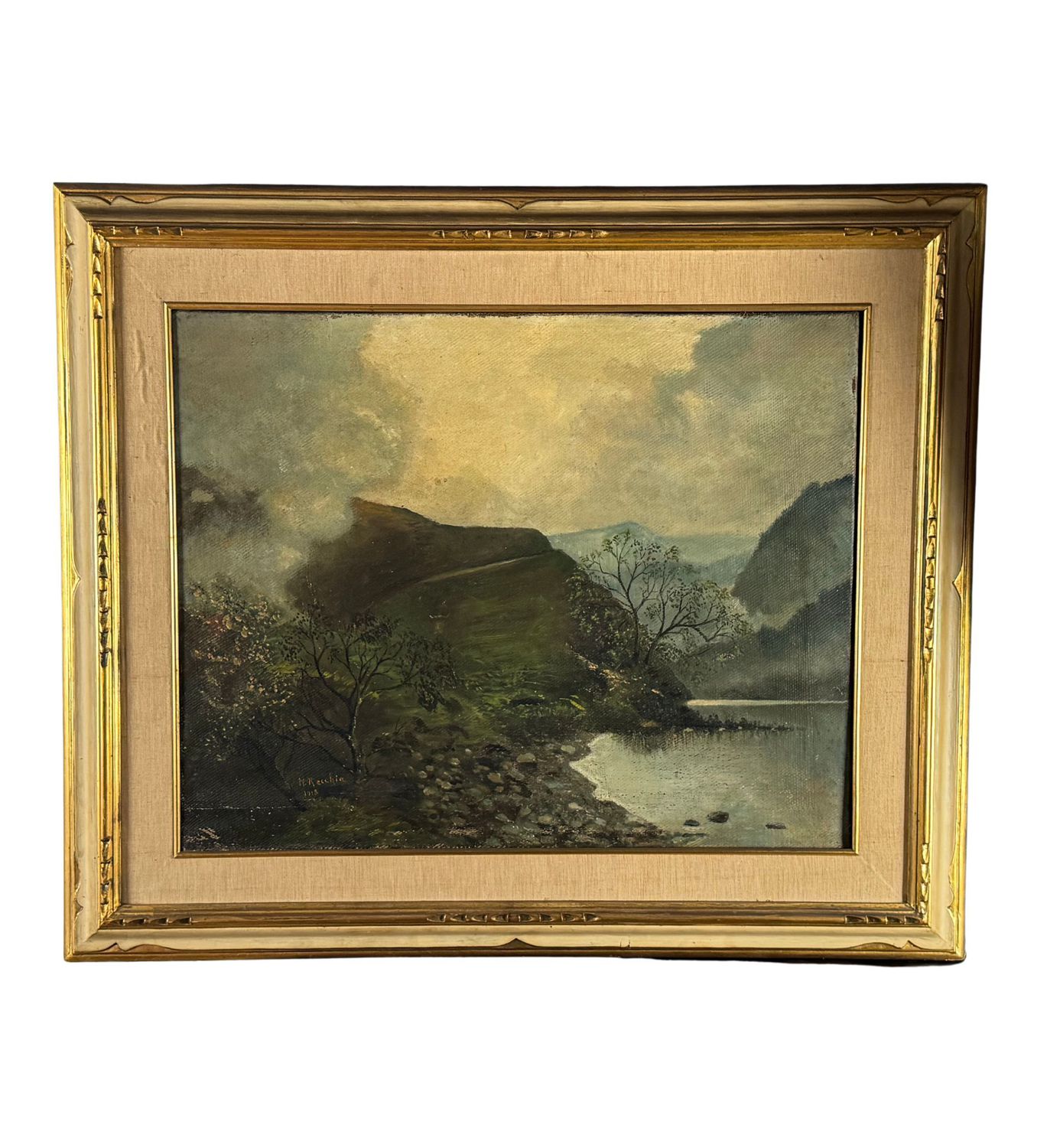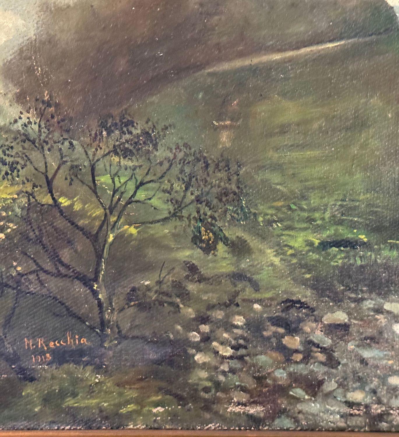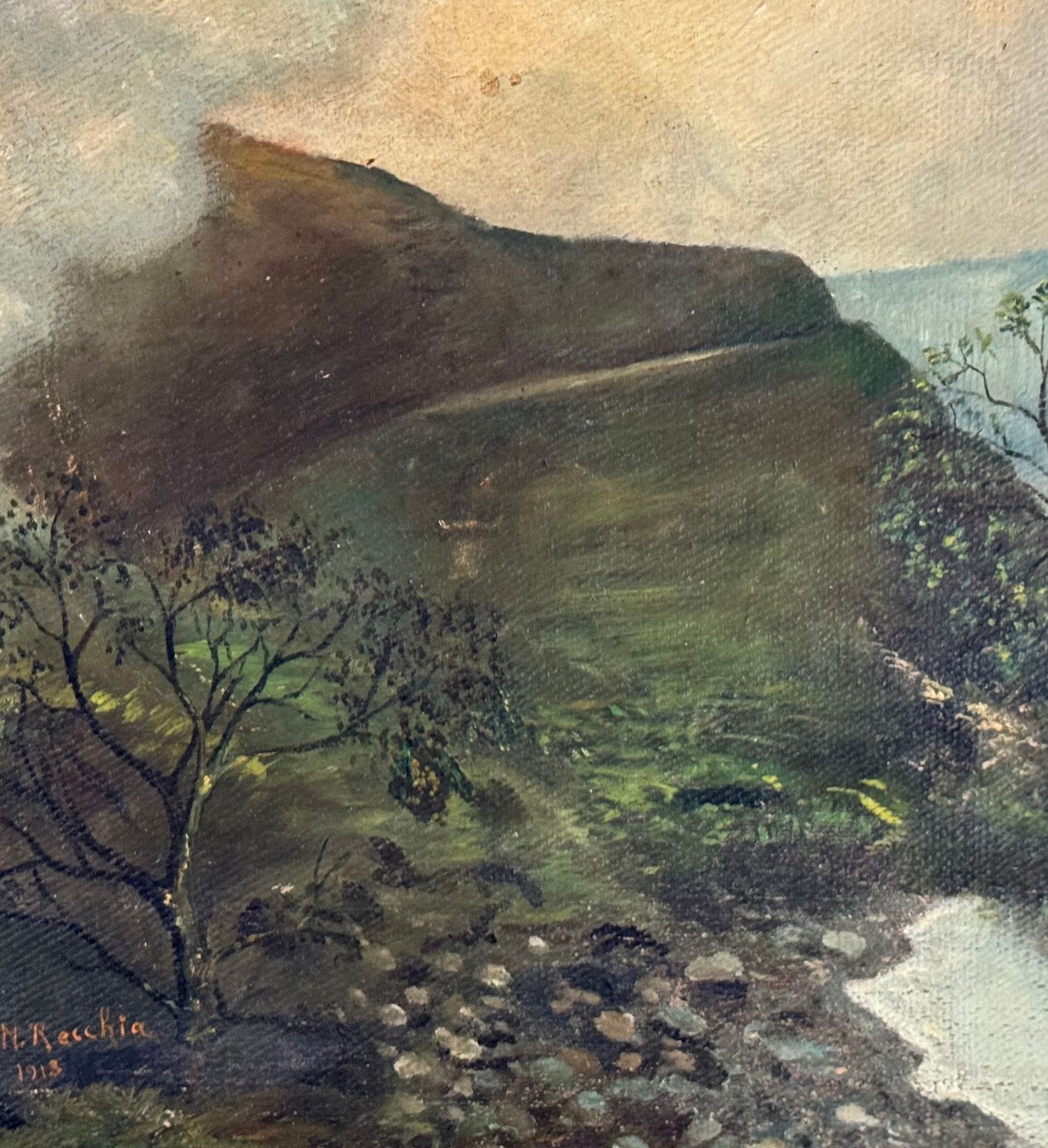 Dipinto olio su tela, periodo XX secolo (1913) scuola Italiana, raffigurante Paesaggio con lago. Dimensioni compreso cornice: 84x72 cm. Dimensioni interno cornice: 63x50 cm. Reca firma in basso a sinistra M. Recchia. Opera in buone condizioni, con lievi segni di vissuto come da foto allegate.