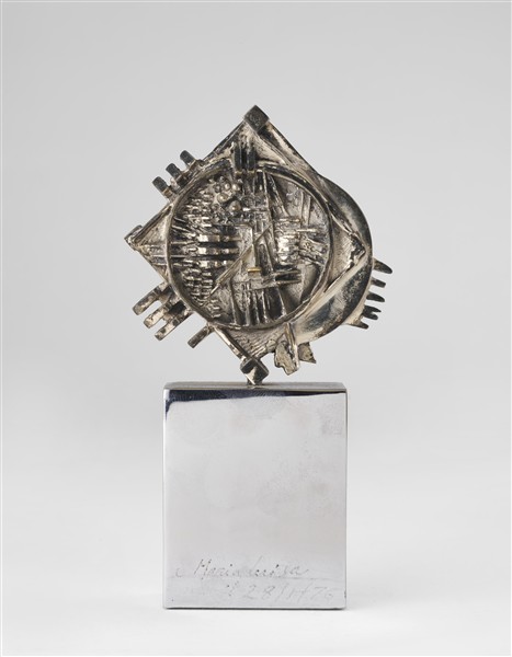Arnaldo Pomodoro "Piccola scultura" 1975 argento e ottone cromato cm 13,5x7x2,5