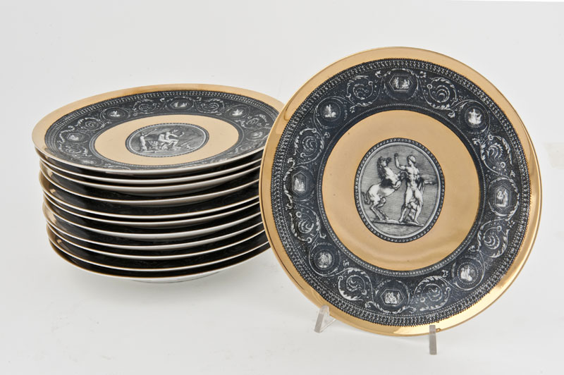 Piero Fornasetti (Milano 1913 - 1988) - Parte di servizio composto da dodici piatti in porcellana serie "Cammei" litografato in monocromo e oro con soggetti mitologici. Marcati e siglati con "F" dorata al verso (d cm 21) (lievi difetti)