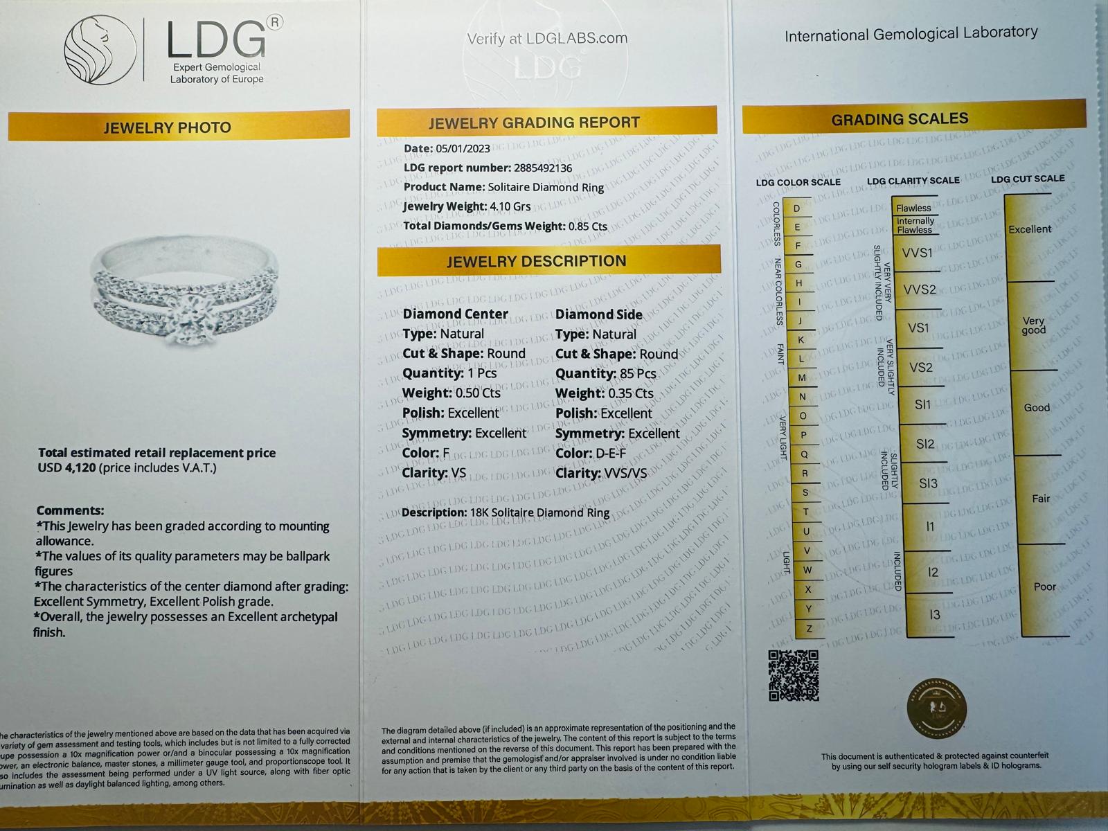 ANELLO IN ORO BIANCO 18k - 4.10 GR CON DIAMANTI: PEITRA CENTRALE BRILLANTE COLORE F PUREZZA VS1 1-0.50 CT + BRILLANTI LATERALI D VVS-VS 85-0.35 CT TAGLIA: 7 CERTIFICATO LD GR – DH-R771 - COMMISSIONE D’ASTA 25% - SEGUI IL LIVE SUL NOSTRO CANALE YOUTUBE https://www.youtube.com/@veronikwatches/streams