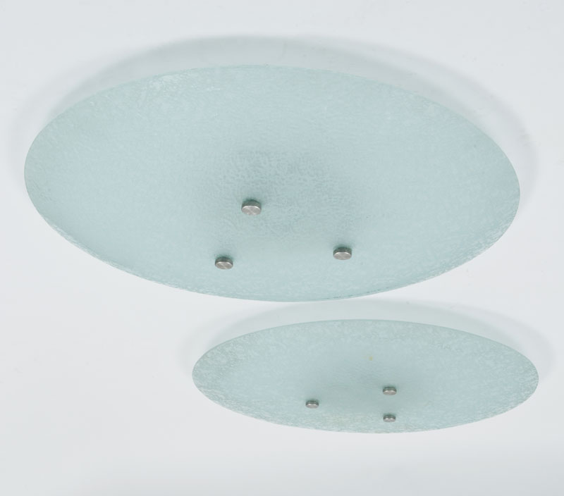 Erwin Burger - (attr.) Fontana Arte - Coppia di grandi plafoniere a scudo in cristallo fortemente corroso all'acido, struttura in alluminio tornito e acciaio. Milano, primi anni 70 del sec XX (d cm 101)