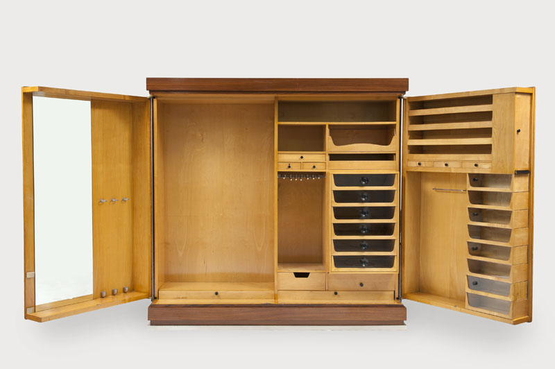 Guglielmo Ulrich (Milano 1904 - 1977) - Armadio per gentiluomo a due ante attrezzate, impiallacciatura esterna in radica, fianchi, basamento e coronamento in palissandro indiano, grandi maniglie intagliate in ebano, interni in acero con numerosi stipi e cassetti, alcuni muniti di vetri Securit. Base profilata in anticorodal. Esecuzione Jannace & Kovacs, Milano 1930-1931. (cm 205x198x60) Provenienza: architetto Piero Castellini Baldissera, Milano, già nella villa del barone Rinaldo Casana, Blevio (Co), probabilmente realizzato in origine per Renato Wildt, Milano. L’armadio è accompagnato da expertise scritta dell’Archivio Ulrich di Milano. Bibliografia: Luca Scacchetti, Guglielmo Ulrich, Federico Motta Editore, Milano 2009, pp. 272-273. Camera con vista. Arte e interni in Italia 1900-2000. A cura di R. Ferrario e L. Settembrini, catalogo della mostra curata da Claudia Gian Ferrari, Palazzo Reale, Milano 18 aprile – 1 luglio 2007, Skira, Milano 2007, pp. 279, fotografia s.p. Per un esemplare simile, attribuito a Giuseppe Gibelli cfr.: R. Aloi, Esempi di arredamento moderno di tutto il mondo. Camere da letto, armadi, toelette, Hoepli, Milano 1951 (ristampa 1953), fig. 179