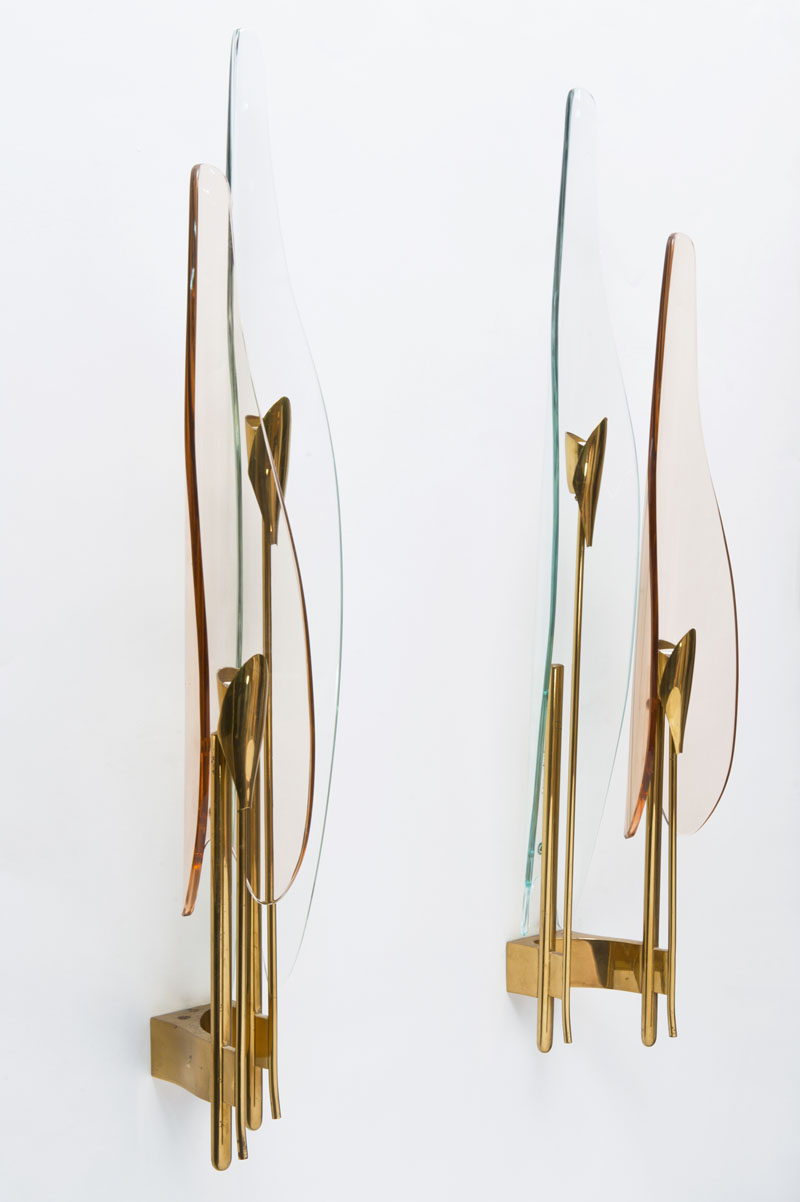 Fontana Arte, coppia di lampade da parete a due luci mod. 1461 "Dahlia", in ottone zapponato con tegole in vetro colorato curvato e molato. Anni 50 del sec XX (lievi difetti) Bibliografia: F. De Boni, Fontana Arte. Gio Ponti, Pietro Chiesa, Max Ingrand, Allemandi, Torino 2012, fig. 334; Catalogo di produzione n°6, 1964, p.16.