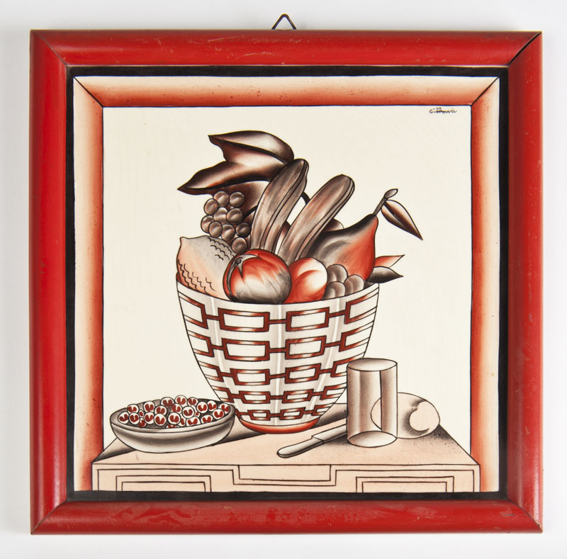 Gio Ponti (Milano 1891 - 1979) - Piastrella in terraglia smaltata in bicromia con decoro raffigurante una natura morta. Manifattura Richard-Ginori S. Cristoforo Milano, 1930 ca. Firmata in alto a sinistra, marcata al verso con monogramma in bruno e numerale in rosso "2142/603T". In cornice. (cm 24,5x24,59). Bibliografia: Emanuele Gaudenzi, Novecento. Ceramiche italiane protagonisti e opere del XX secolo, vol. 1, Faenza Editrice, 2005, p.142