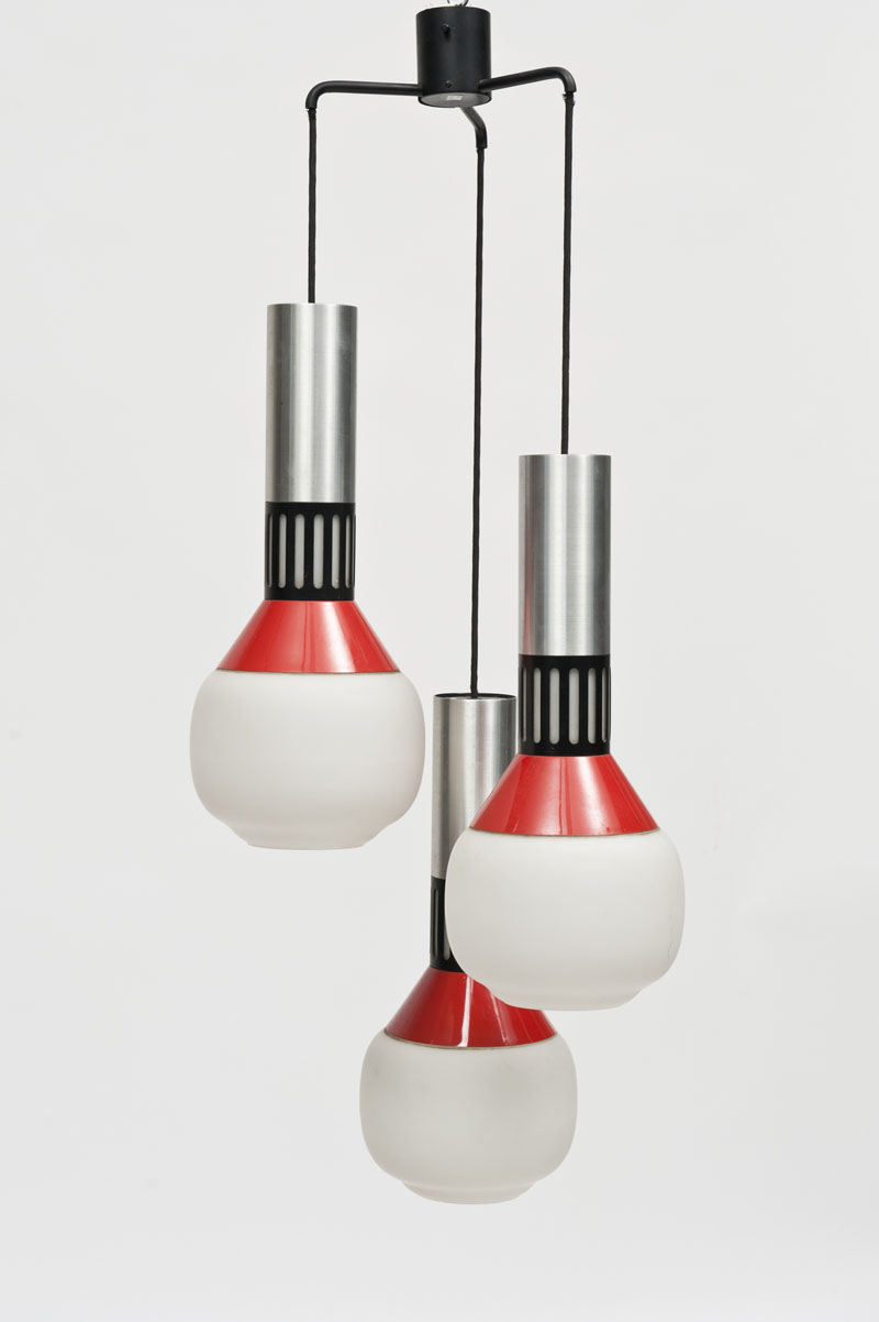 Stilnovo, lampada da sospensione mod. "1247", a tre elementi cilindrici in alluminio e metallo laccato nero e rosso, paralumi in vetro bianco “Triplex Opal” satinato. Produzione Stilnovo, Milano anni 60 del sec XX. Bibliografia: Catalogo Stilnovo n. 10.
