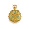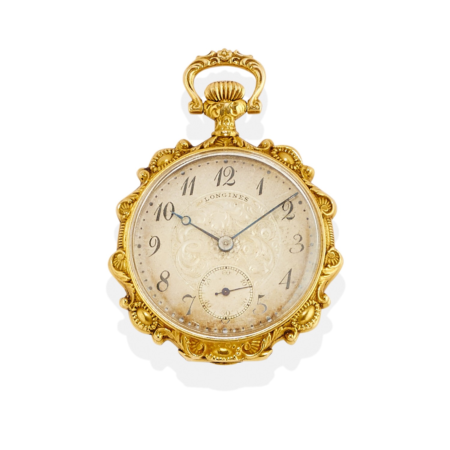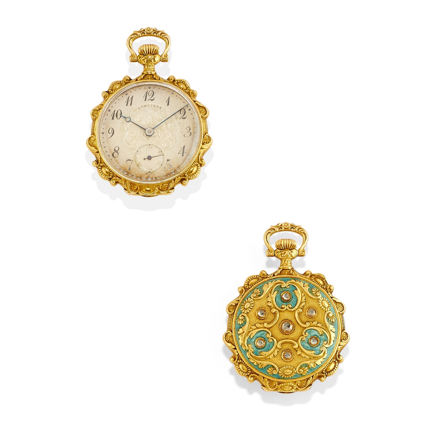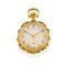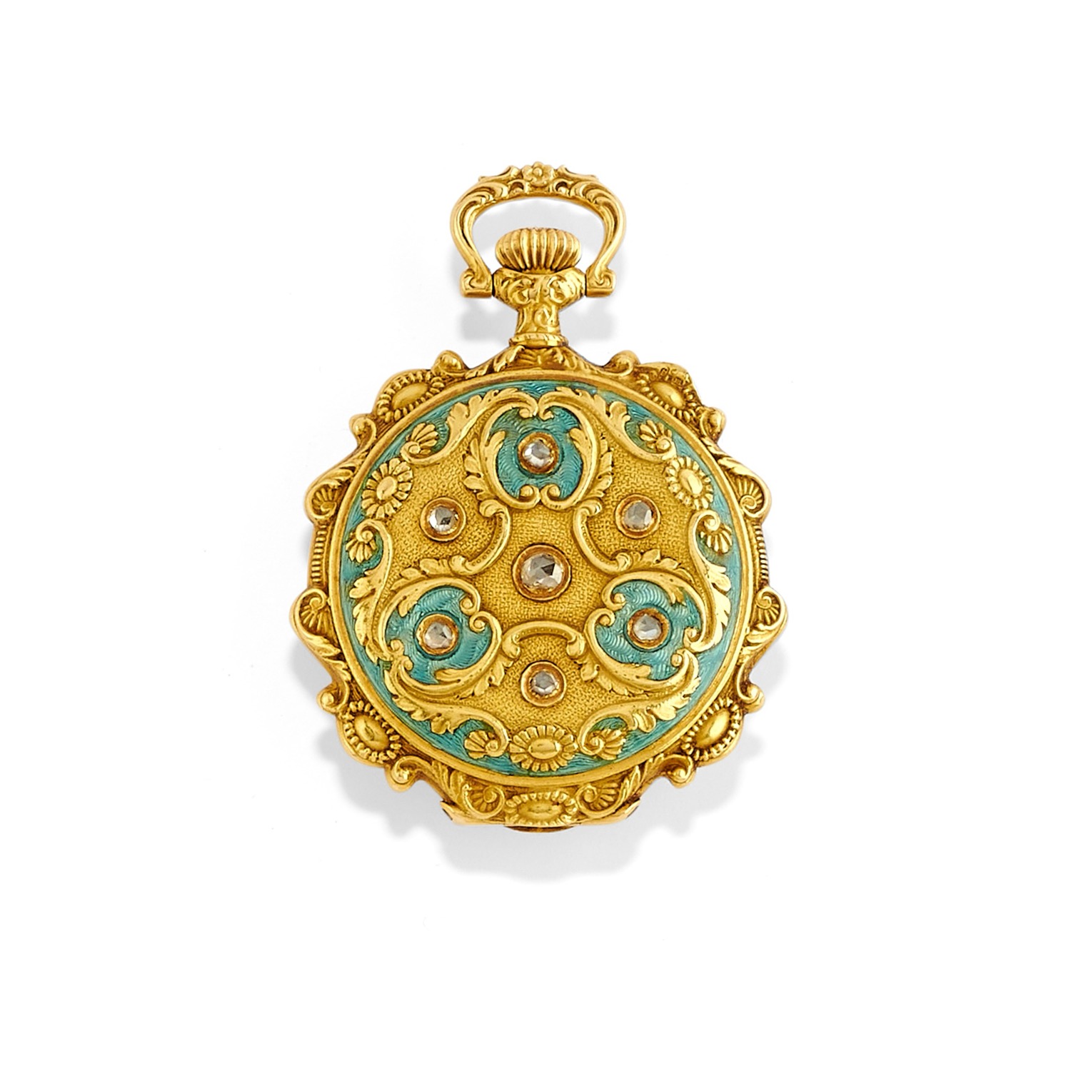 cassa rotonda, quadrante chiaro inciso, numeri arabi dipinti, secondi al sei, al retro cassa incisa e a rilievo decorata da smalto guillochè e diamanti taglio briolette antico, da revisionare.